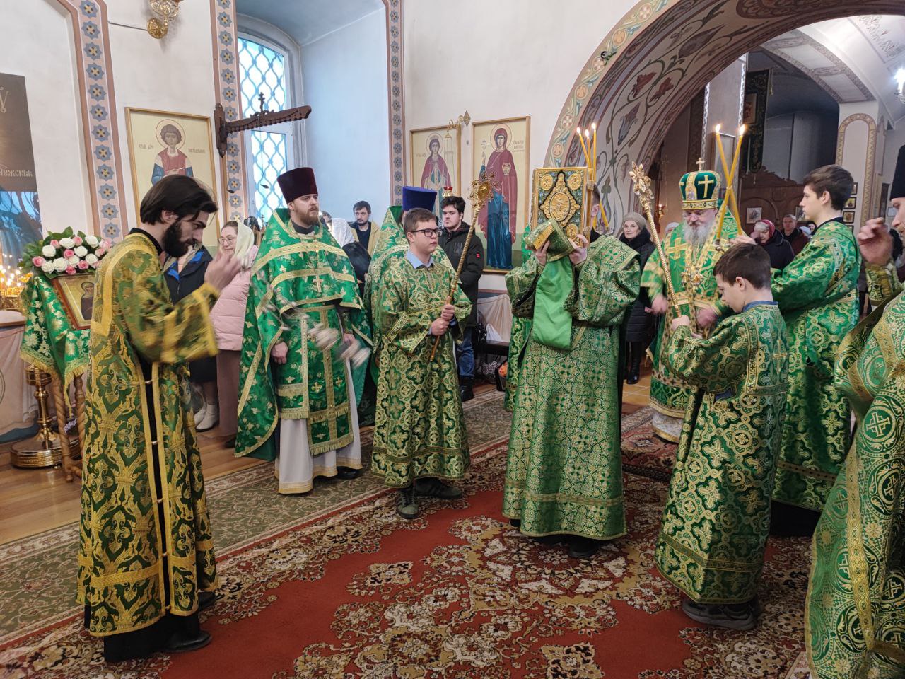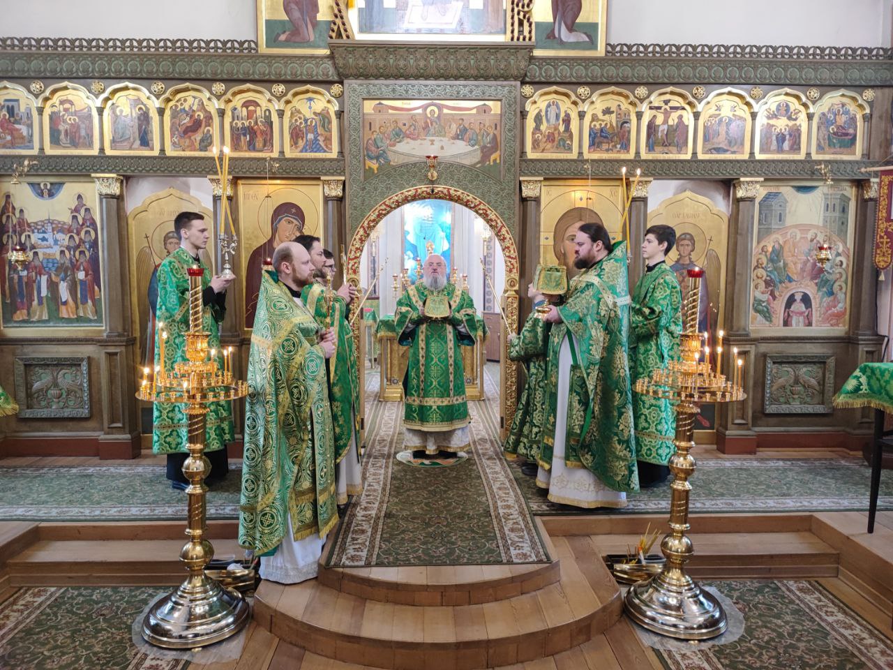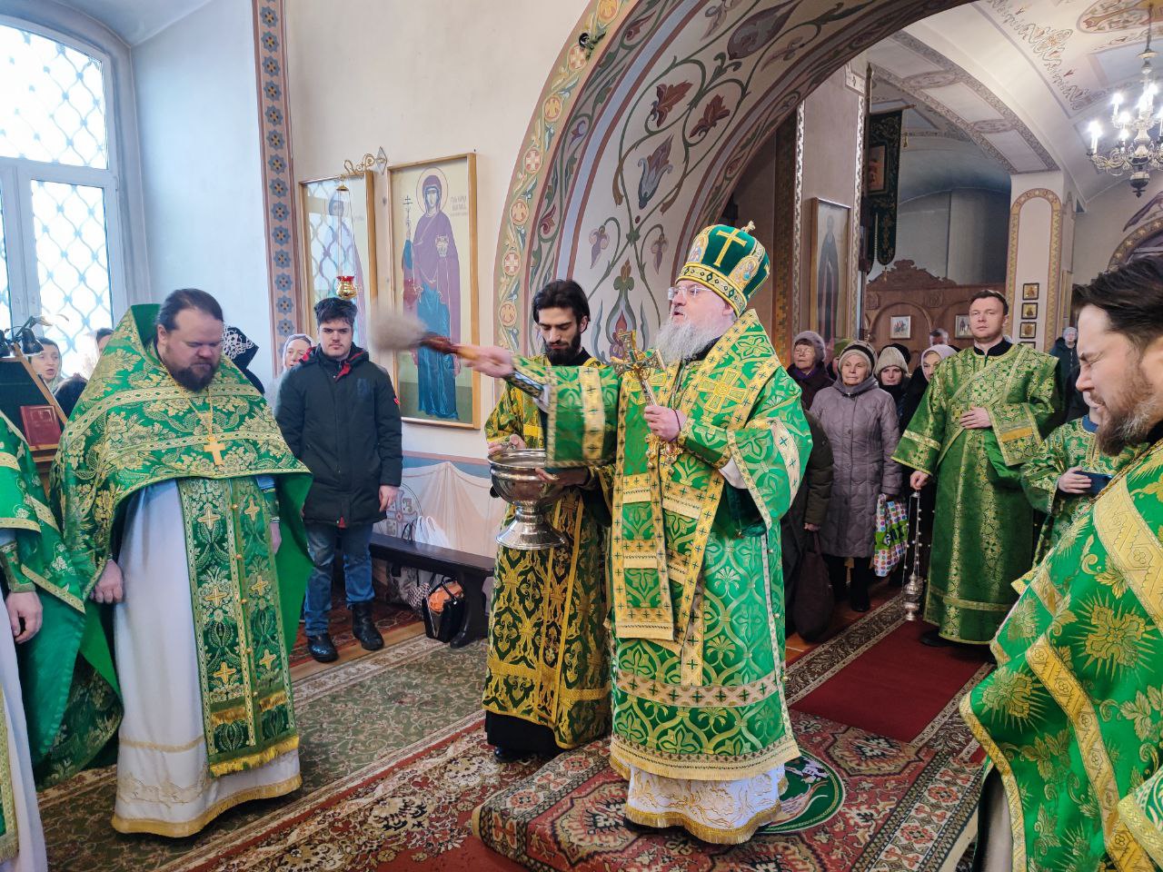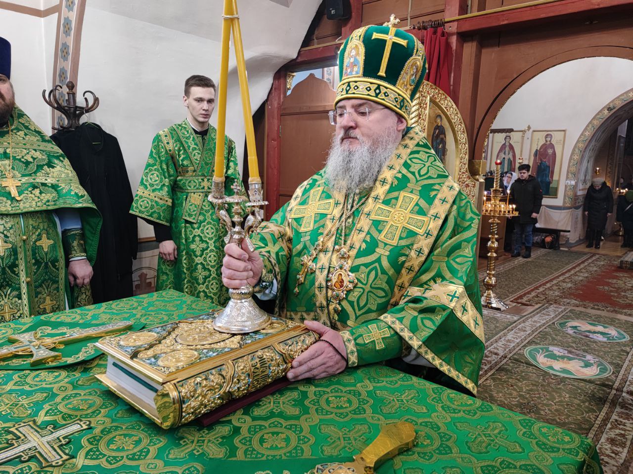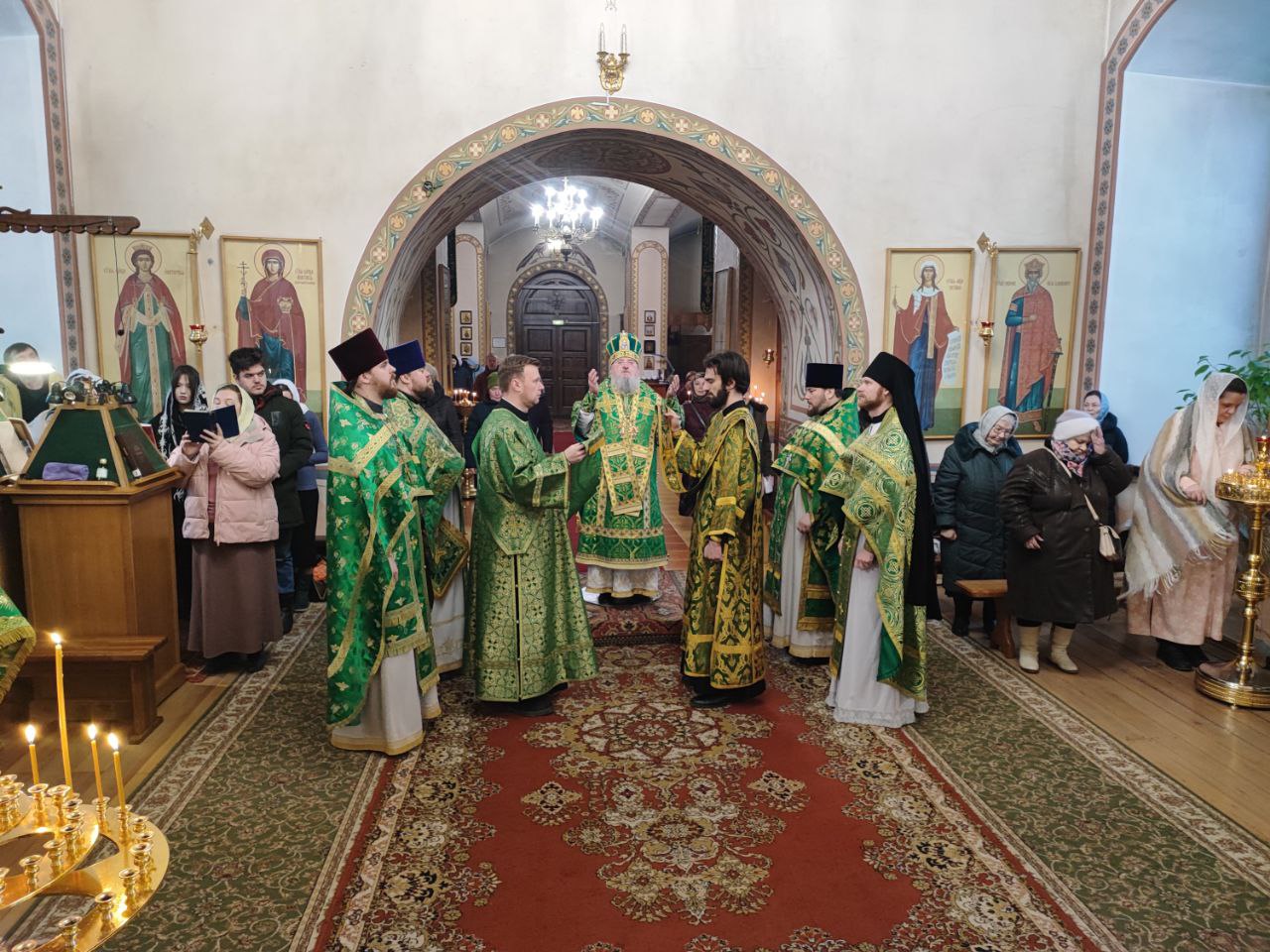 Архипастырю сослужили: настоятель храма протоиерей Сергий Сычев, протоиерей Антоний Хатунцев, иерей Виктор Носов, иеромонах Лука (Старостин), диакон Евгений Ковригин и диакон Дамиан Рупасов.