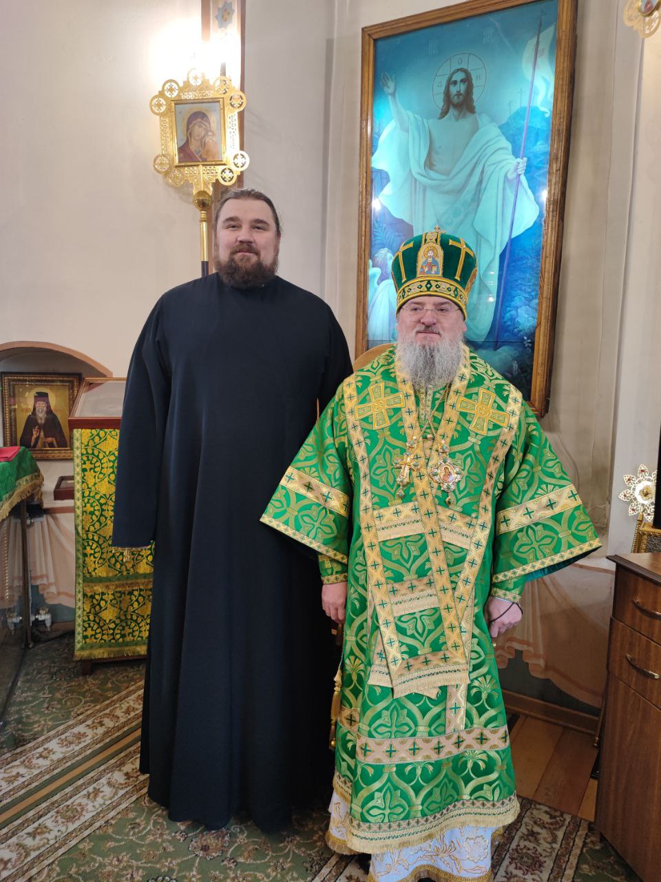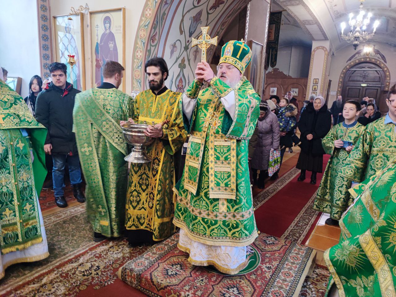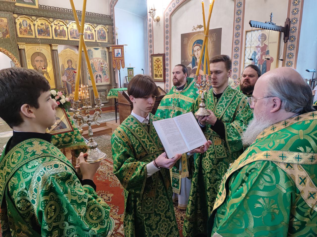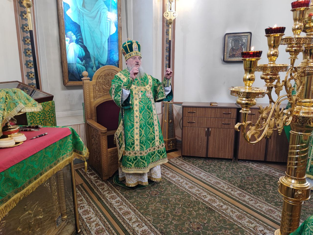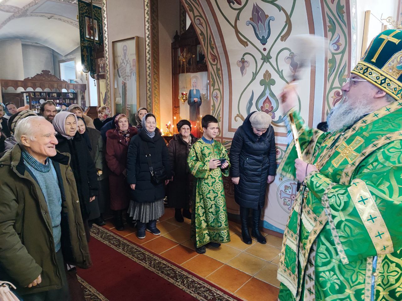 Архипастырю сослужили: настоятель храма протоиерей Сергий Сычев, протоиерей Антоний Хатунцев, иерей Виктор Носов, иеромонах Лука (Старостин), диакон Евгений Ковригин и диакон Дамиан Рупасов.