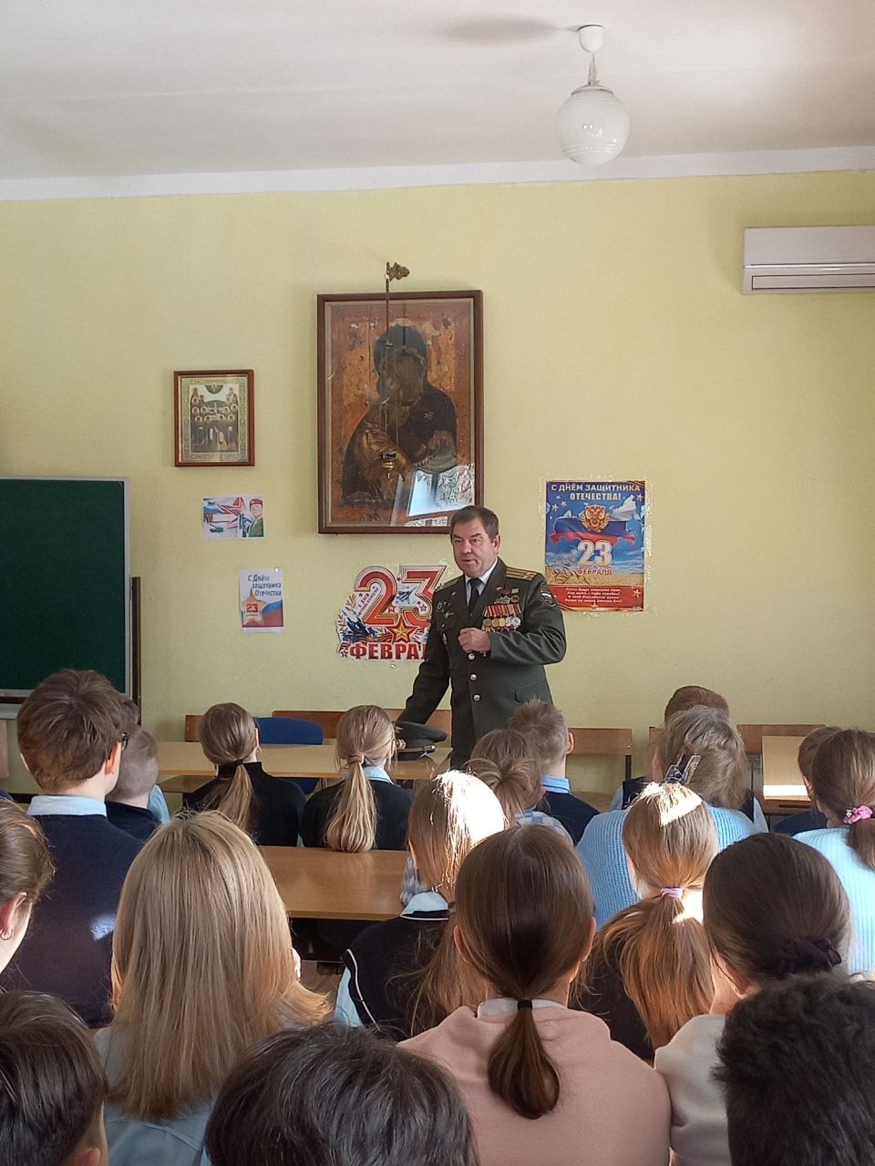 21 февраля гимназия была рада приветствовать в своих стенах неординарного человека — кавалера орденов Красной звезды и «За службу Родине в вооружённых силах СССР», а также обладателя ещё около двадцати правительственных наград, подполковника запаса, прошедшего Афганистан и Чечню, ликвидатора аварии на Чернобыльской АС вертолётчика Хомутова Вячеслава Алексеевича. Он провел в небе более 2700 часов. Из них не менее 1000 часов – на боевых вылетах. Каждый из них мог стать последним.