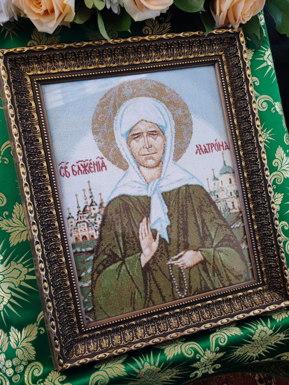О, блаже́нная ма́ти Матро́но, душе́ю на Небеси́ пред Престо́лом Бо́жиим предстоя́щи, те́лом же на земли́ почива́ющи, и да́нною ти свы́ше благода́тию разли́чныя чудеса́ источа́ющи. При́зри ны́не ми́лостивным твои́м о́ком на ны, гре́шныя, в ско́рбех, боле́знех и грехо́вных искуше́ниих дни своя́ иждива́ющия, уте́ши ны, отча́янныя, исцели́ неду́ги на́ши лю́тыя, от Бо́га нам по грехо́м на́шим попуща́емыя, изба́ви нас от мно́гих бед и обстоя́ний, умоли́ Го́спода на́шего Иису́са Христа́ прости́ти нам вся на́ша согреше́ния, беззако́ния и грехопаде́ния, и́миже мы от ю́ности на́шея да́же до настоя́щаго дне и часа́ согреши́хом, да твои́ми моли́твами получи́вше благода́ть и ве́лию ми́лость, просла́вим в Тро́ице Еди́наго Бо́га, Отца́, и Сы́на, и Свята́го Ду́ха, ны́не и при́сно и во ве́ки веко́в. Ами́нь.