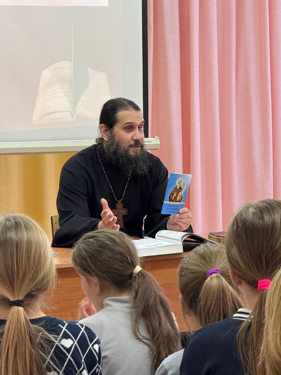 14 марта в рамках духовно-нравственного воспитания обучающихся преподаватели средней образовательной школы совместно с настоятелем храма Владимирской иконы Божией Матери в селе Волконское иереем Максимом Изоповым организовали и провели мероприятие под названием «Через книгу — к добру и свету». Советник директора по воспитанию Тазова Галина Валентиновна познакомила ребят с православными книгами, которые повествуют о добре и зле, прощении, милосердии и заботе о ближних. Отец Максим более подробно рассказал ребятам о содержании, истории создания книги «Апостол» и показал современное его издание. Ребятам также могли познакомиться с экземплярами старинных книг.