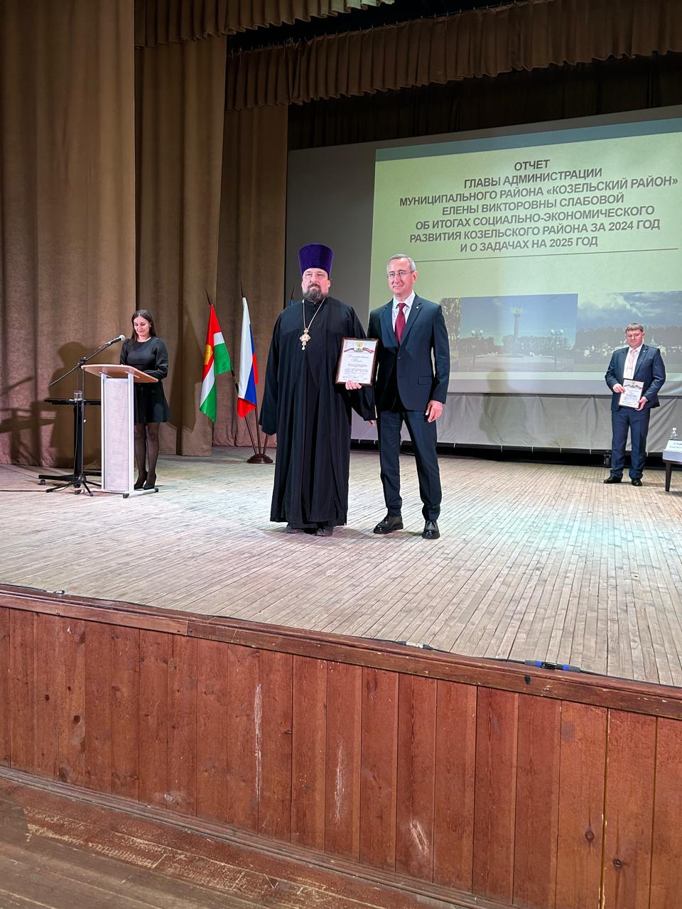От лица епархии, столь высокую награду принял секретарь Козельской епархии, благочинный Козельского района, настоятель храма прп. Серафима Саровского г. Сосенский — протоиерей Владимир Бахаев.