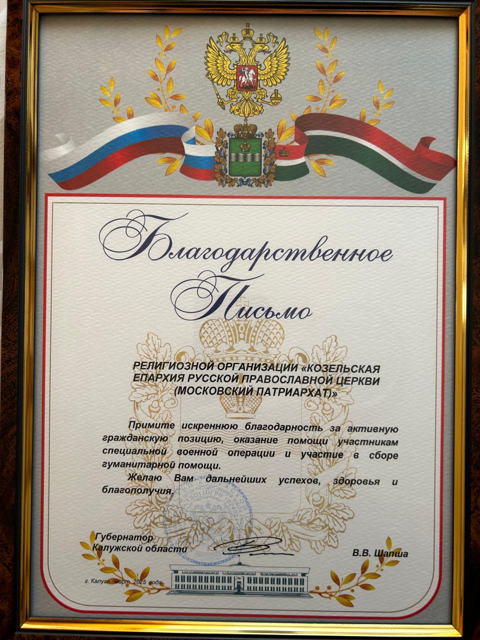 БЛАГОДАРСТВЕННОЕ ПИСЬМО КОЗЕЛЬСКОЙ ЕПАРХИИ ОТ ГУБЕРНАТОРА