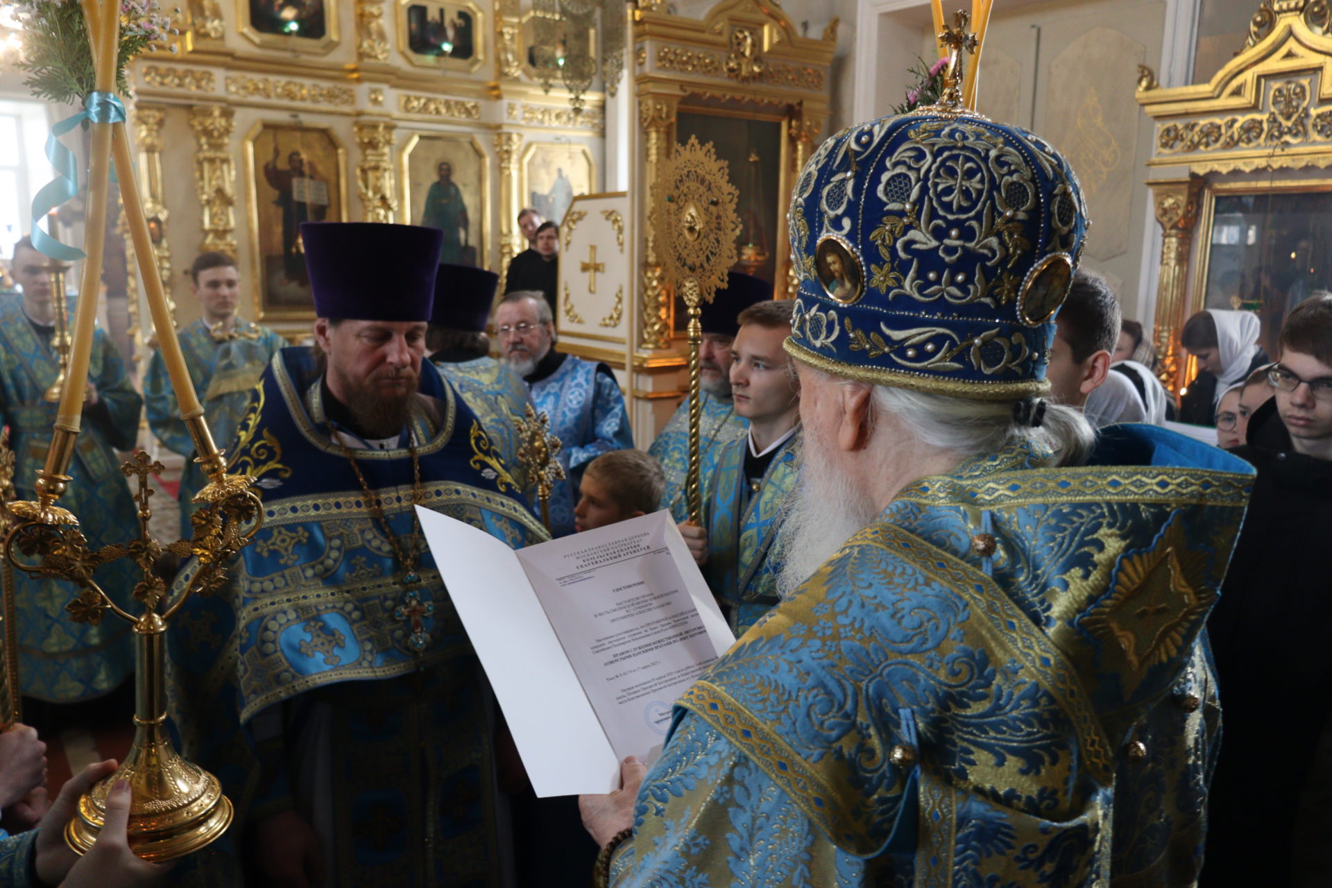На малом входе владыка митрополит возложил богослужебно-иерархические награды к празднику Святой Пасхи. Согласно Указа Святейшего Патриарха Кирилла, правом служения Божественной литургии с отверстыми Царскими вратами по «Иже Херувимы…» были награждены клирики Козельской епархии: