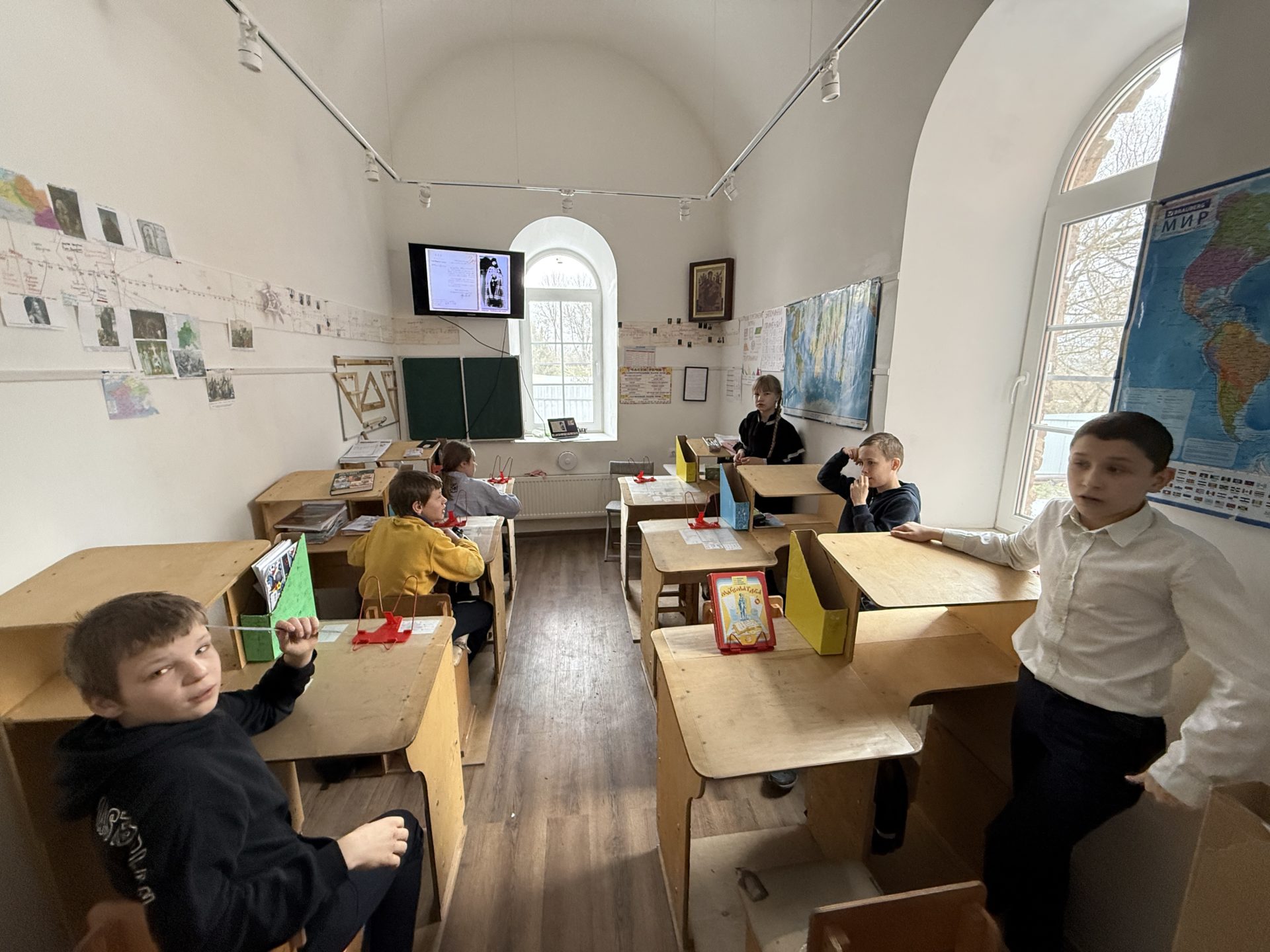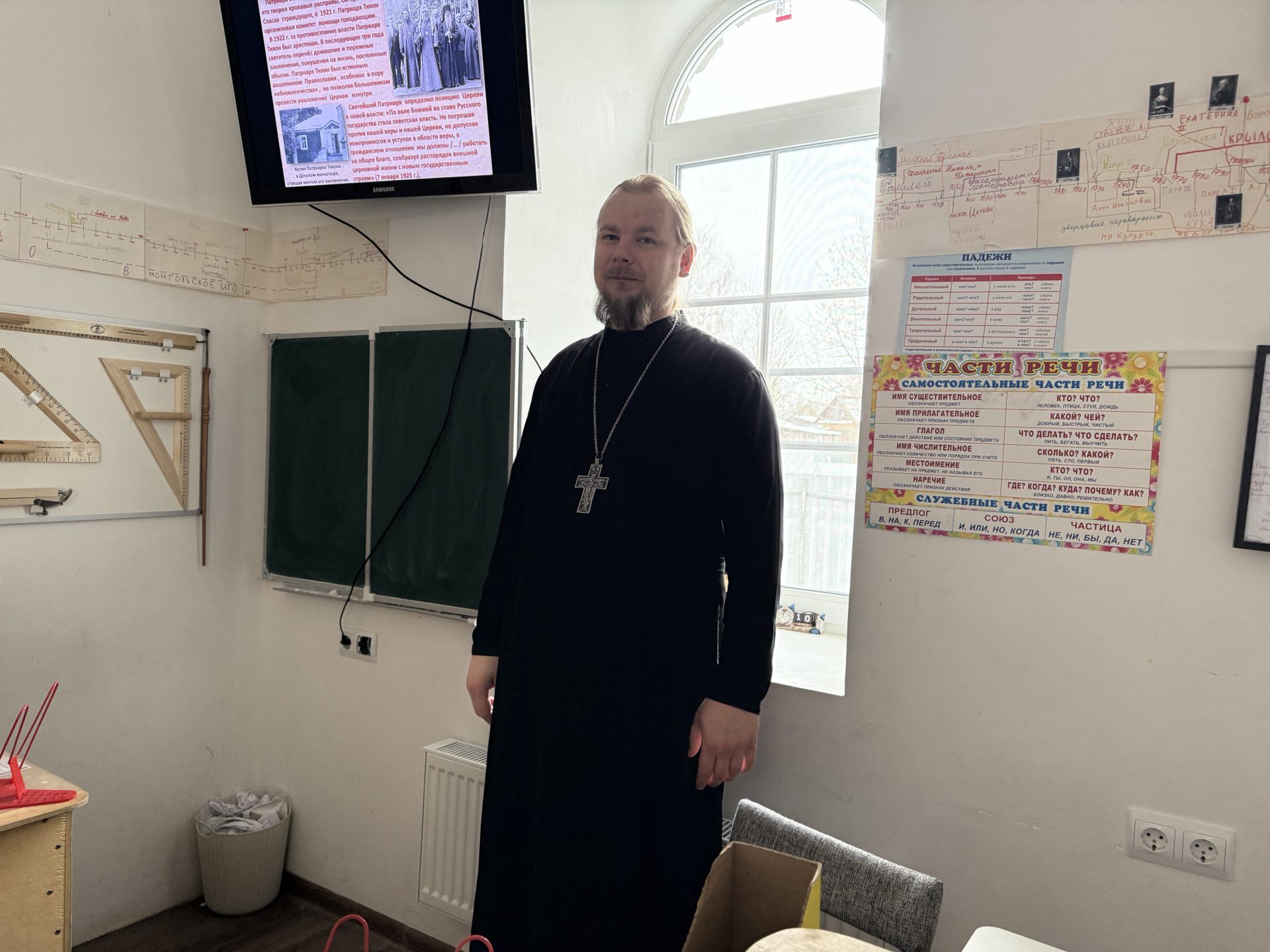 11 апреля настоятель Благовещенского храма в городе Козельске иерей Сергий Барыкин провел урок в 6 классе Козельской семейной школы. Урок был посвящен святителю Тихону Патриарху Московскому и всея Руси. В этом году исполняется 100 лет со дня его преставления. Батюшка показал детям презентацию, в которой рассказал о жизни святителя, его послушаниях и непростом Патриаршем кресте.