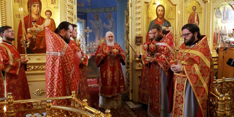 После сугубой ектении была прочитана молитва о Святой Руси, возносимая во всех храмах Русской Православной Церкви по благословению Святейшего Патриарха Московского и всея Руси Кирилла.