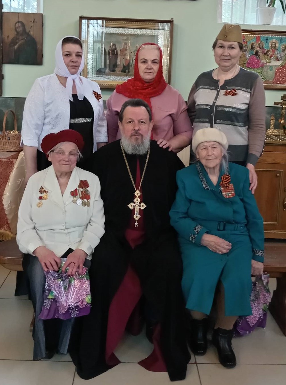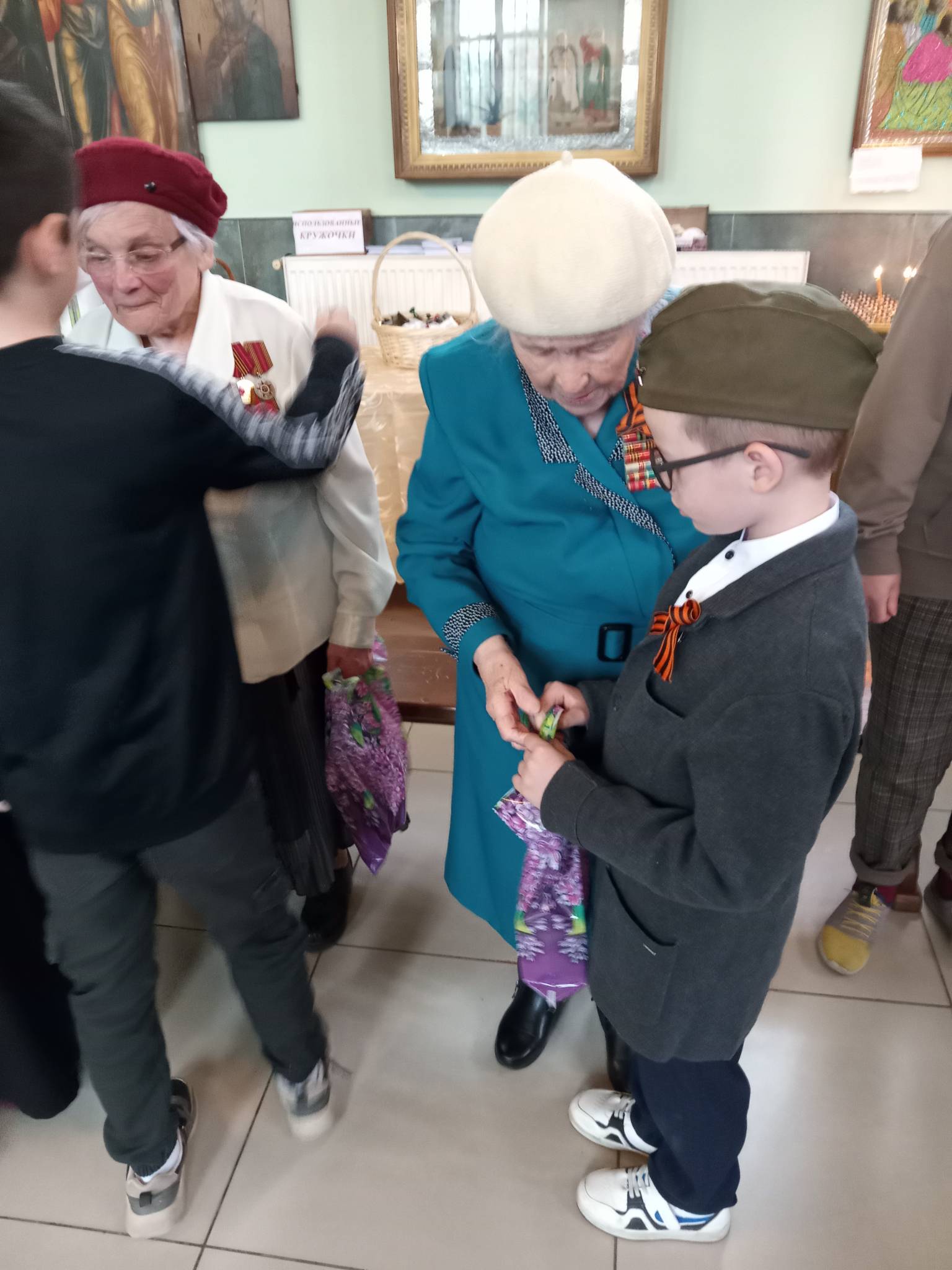 Затем все присутствующие, во главе с настоятелем храма протоиереем Василием Биляк возложили венок на братскую могилу. Всем ветеранам дети вручили  памятные подарки. Сами ребята получили сладкое угощение из рук батюшки.