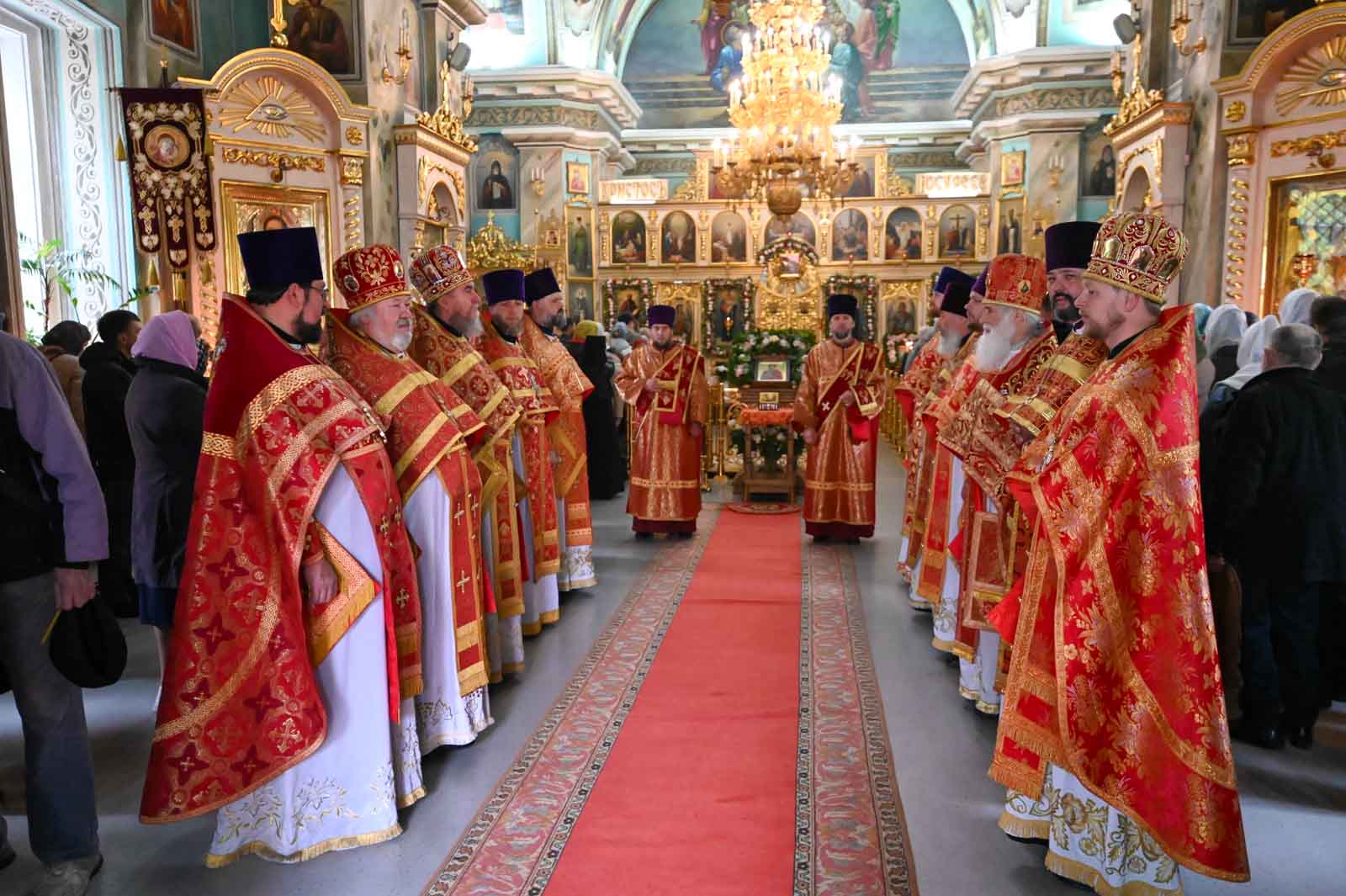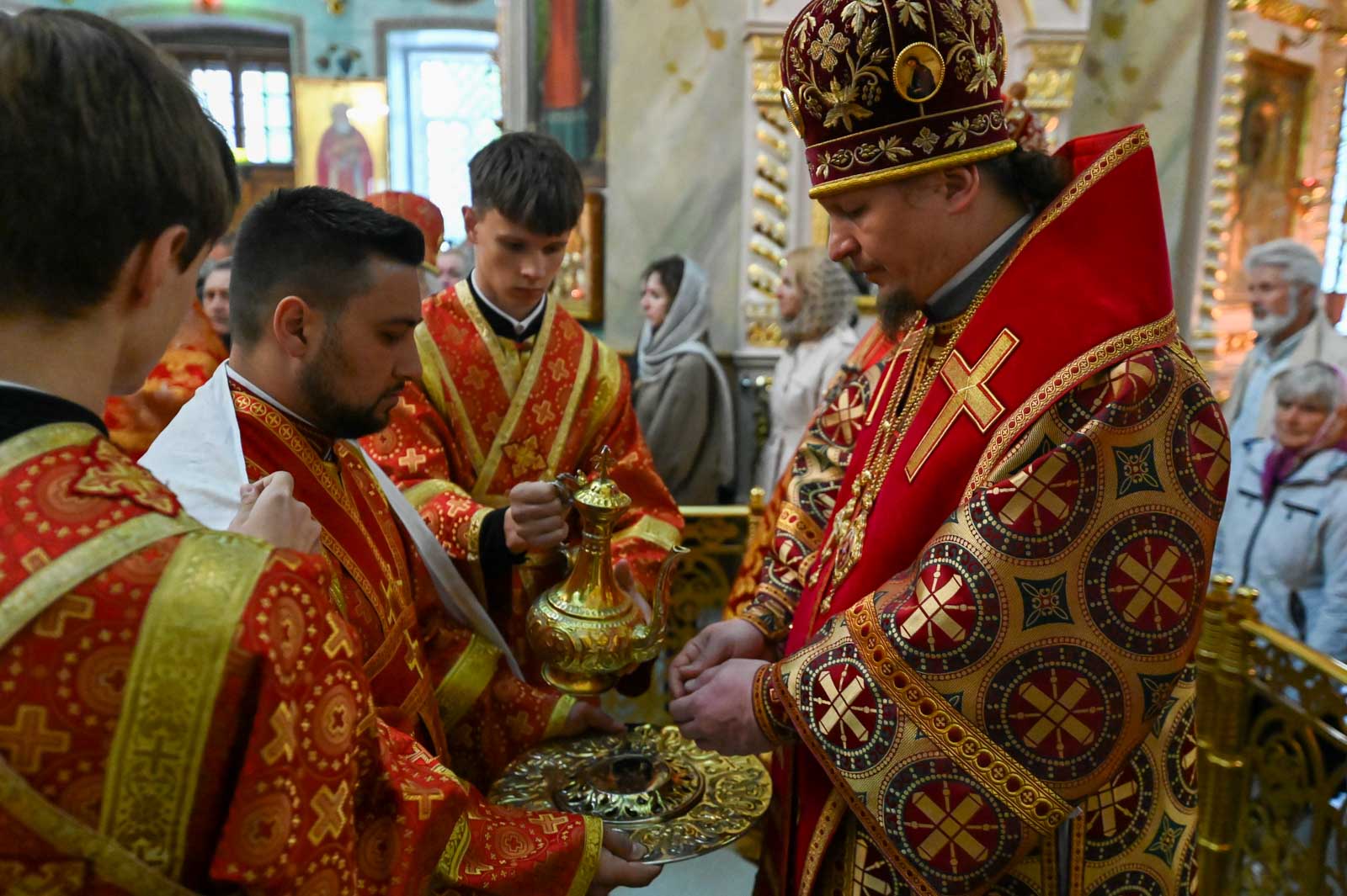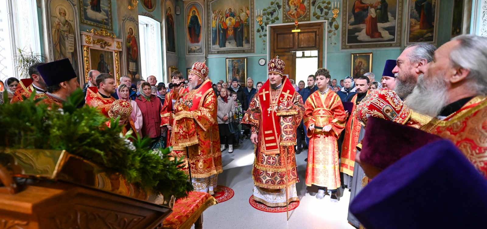 Архипастырям сослужили секретарь Гомельской епархии протоиерей Георгий Алампиев, ведущий специалист Сектора выставок Издательского совета Русской Православной Церкви священник Андрей Степанов, благочинные и настоятели храмов г. Гомеля и духовенство Петро-Павловского собора.