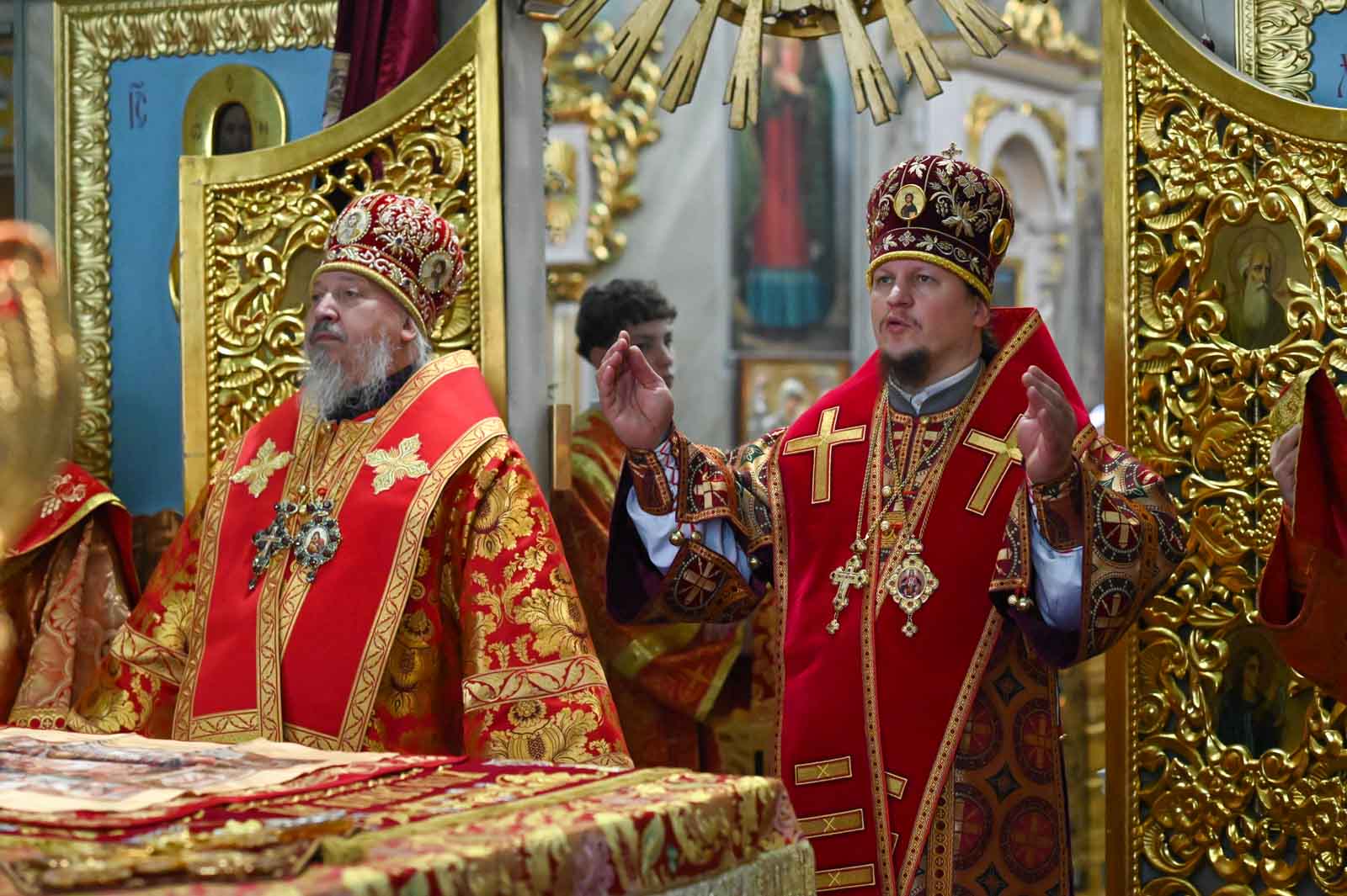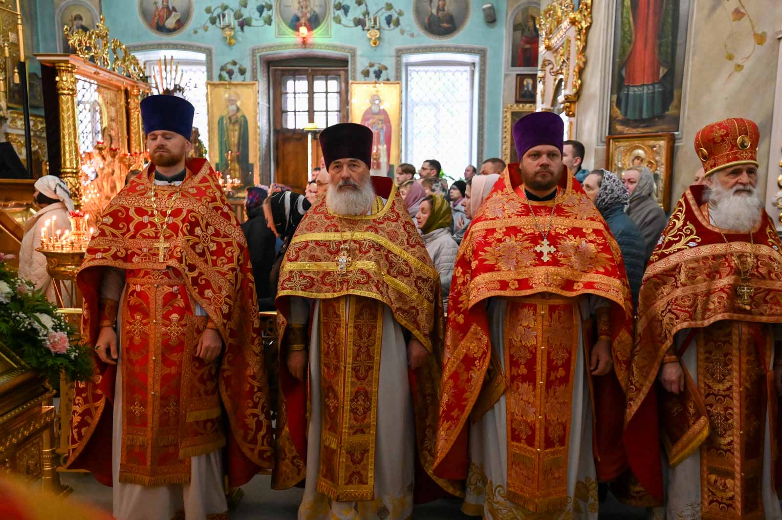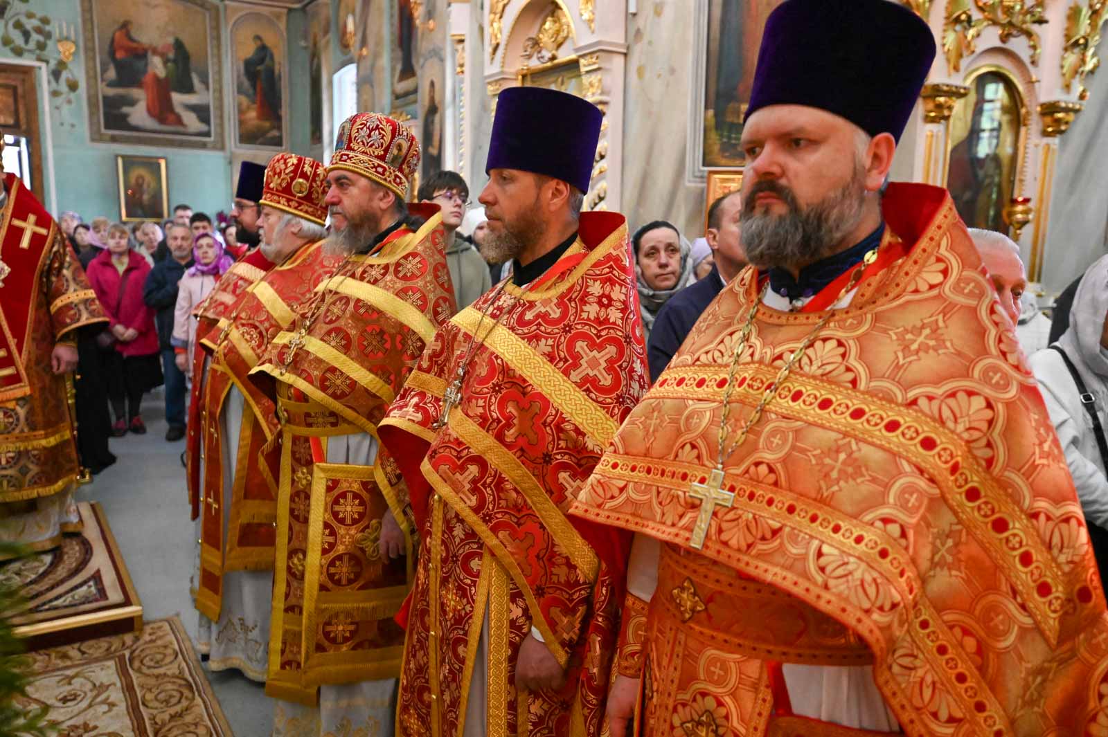 Архипастырям сослужили секретарь Гомельской епархии протоиерей Георгий Алампиев, ведущий специалист Сектора выставок Издательского совета Русской Православной Церкви священник Андрей Степанов, благочинные и настоятели храмов г. Гомеля и духовенство Петро-Павловского собора.