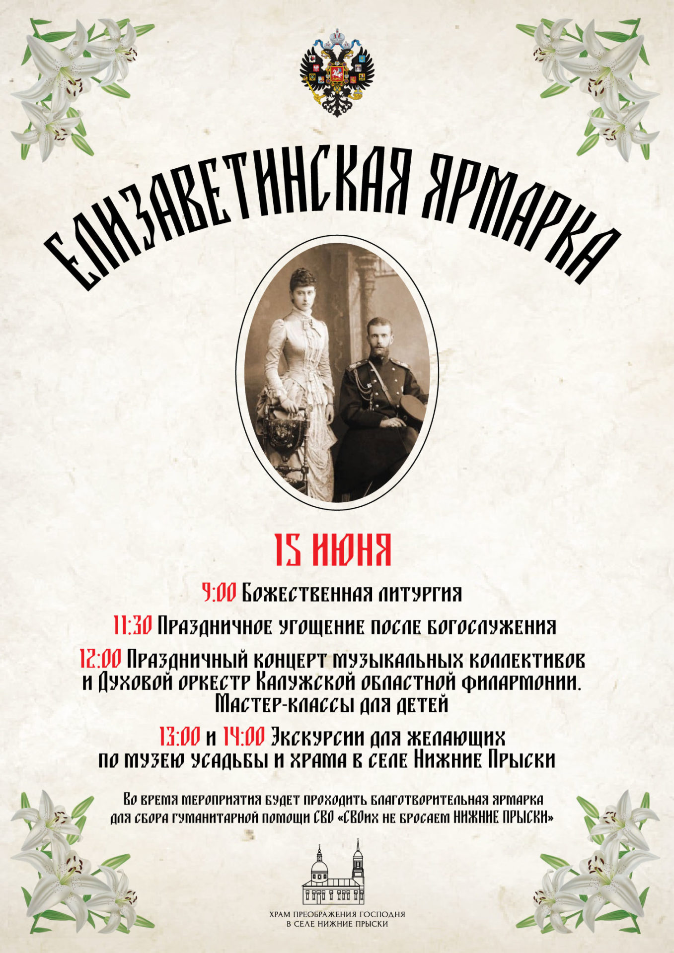 Дорогие братья и сёстры! По благословению Преосвященнейшего Макария, епископа Козельского и Людиновского, 15 июня на территории храма Преображения Господня в селе Нижние Прыски пройдет «Елизаветинская Ярмарка» — праздник, посвященный памяти преподобной великомученицы Елизаветы Федоровны Романовой и всем в Алапаевске за Христа пострадавшим.