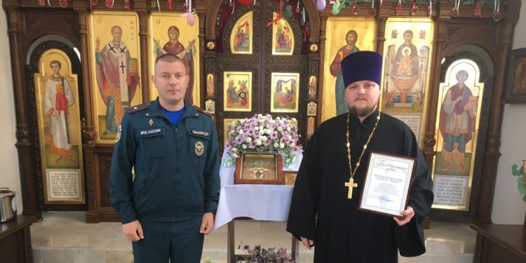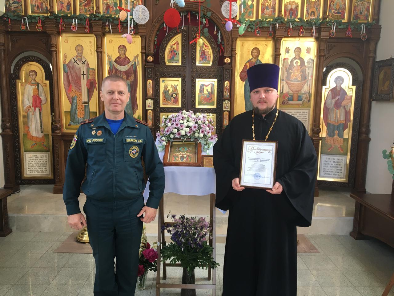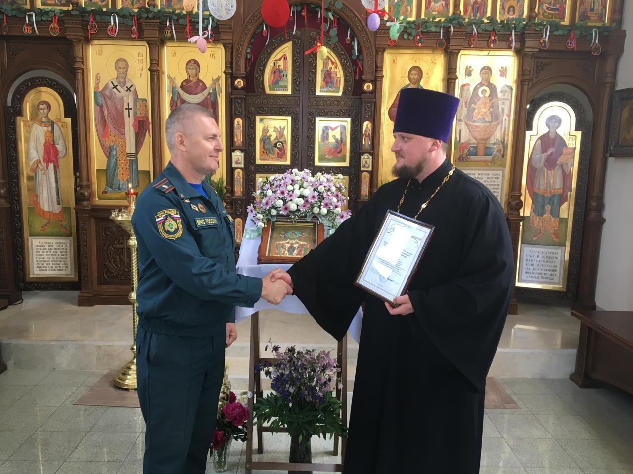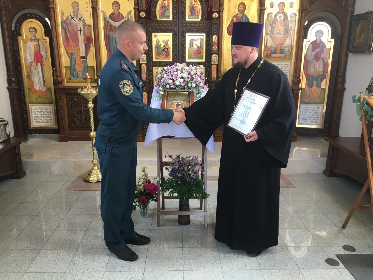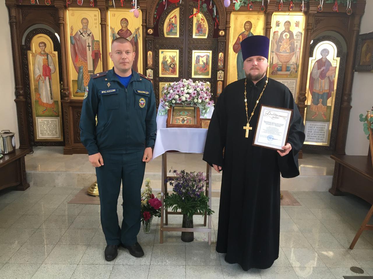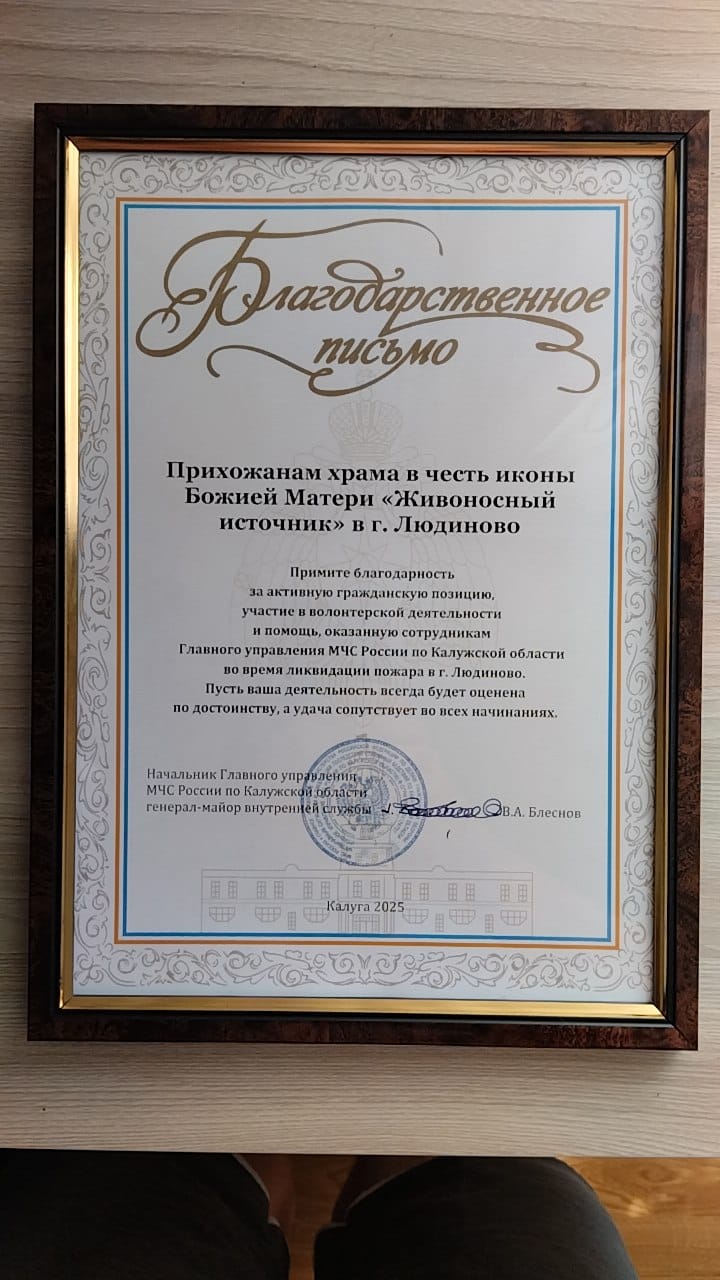 Настоятелю храма в честь иконы Божией Матери «Живоносный Источник» иерею Иоанну Майорову и прихожанам храма вручили благодарственное письмо от начальника ГУ МЧС России по Калужской области