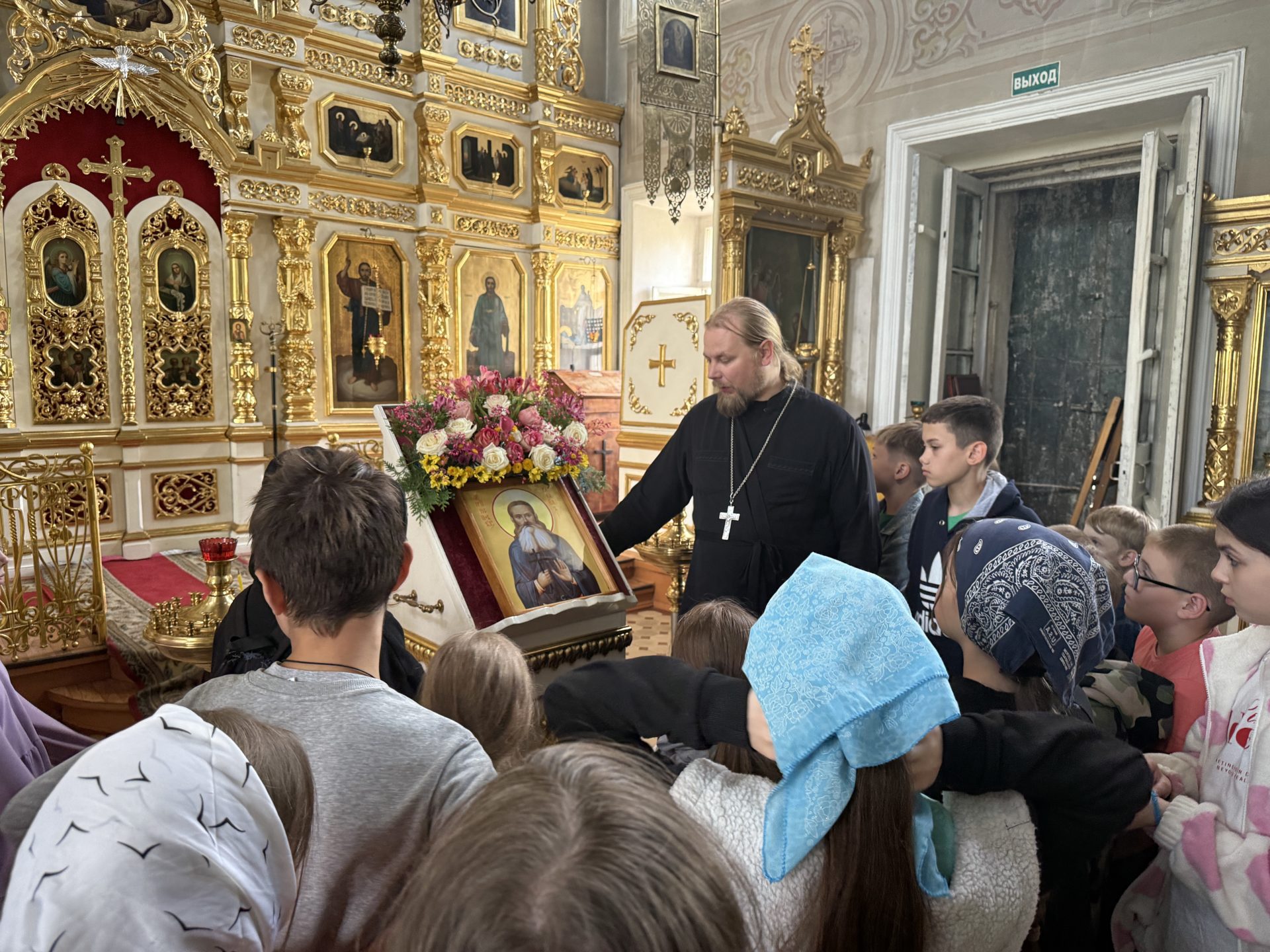 Настоятель храма иерей Сергий Барыкин провел для гостей экскурсию и рассказал им о личности святого Рафаила и его роли в истории храма и города, а также о других святых, связанных с храмом — новомученике Борисе Козлове, и древнем подвижнике, который был родом из Козельска — преподобном Елеазаре Анзерском.