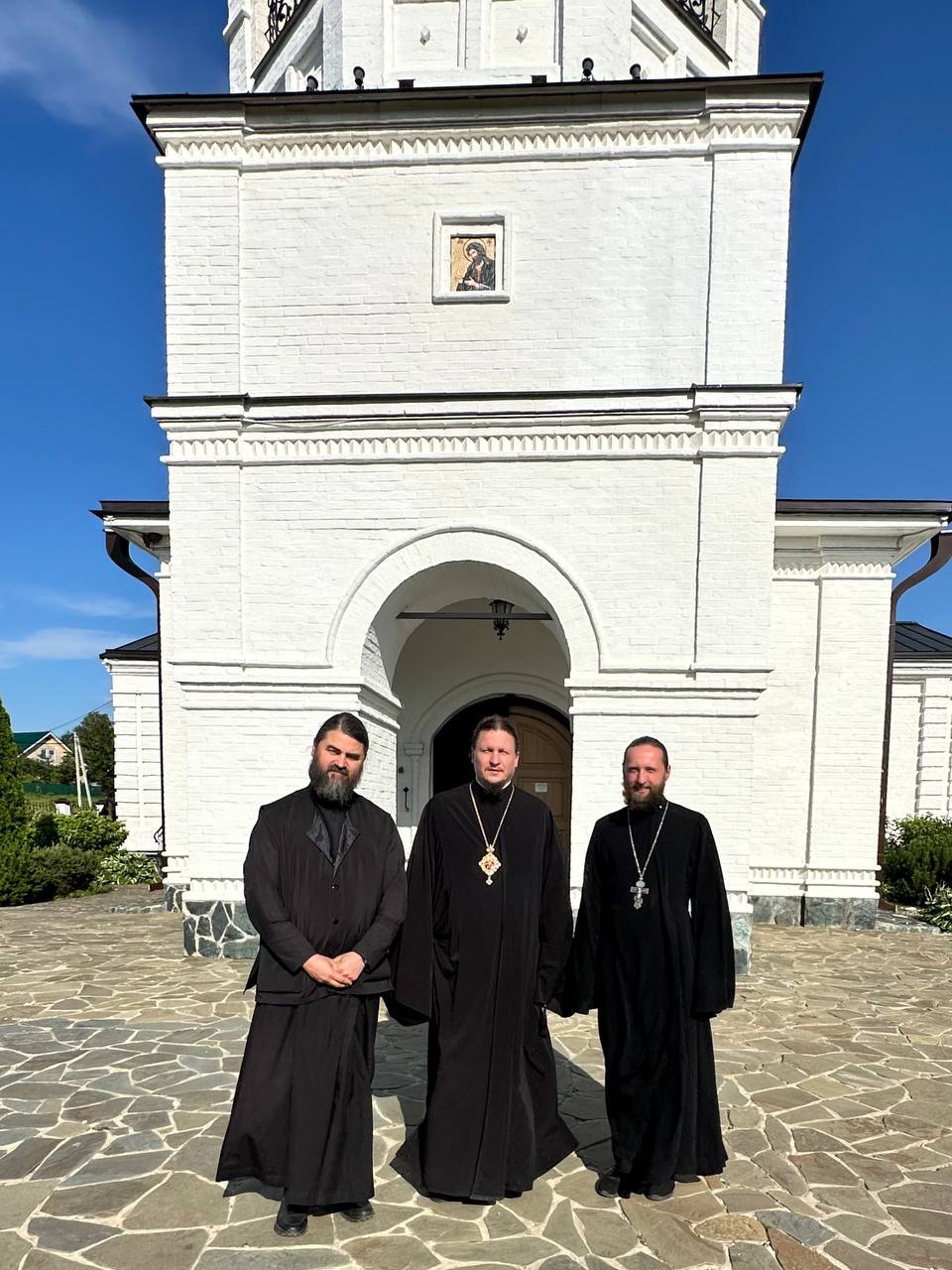 У входа в храм епископа встретили настоятель священник Дионисий Капустин и строитель храма, инициатор возрождения с. Губино, насельник Оптиной пустыни иеромонах Вадим (Басов).