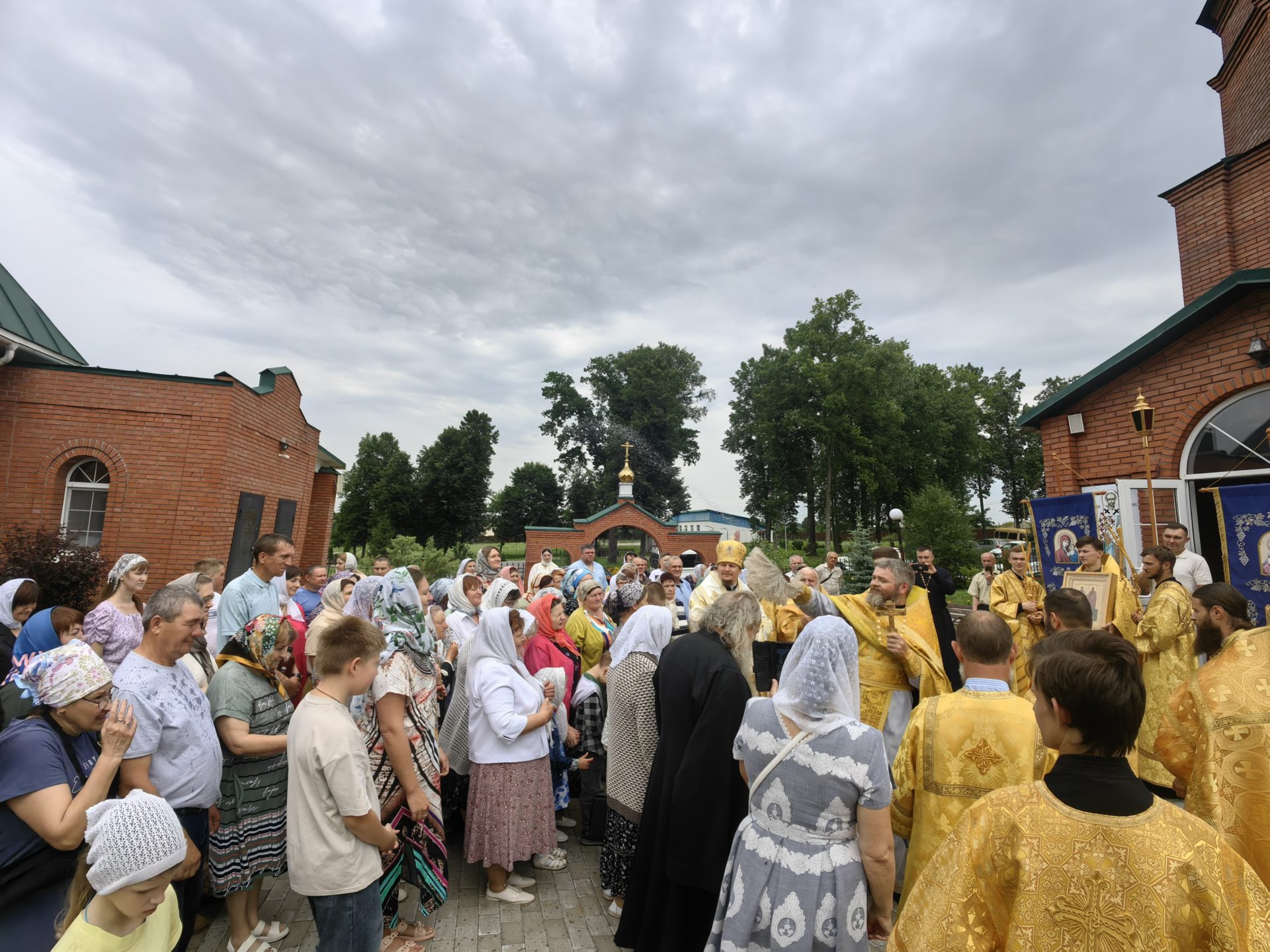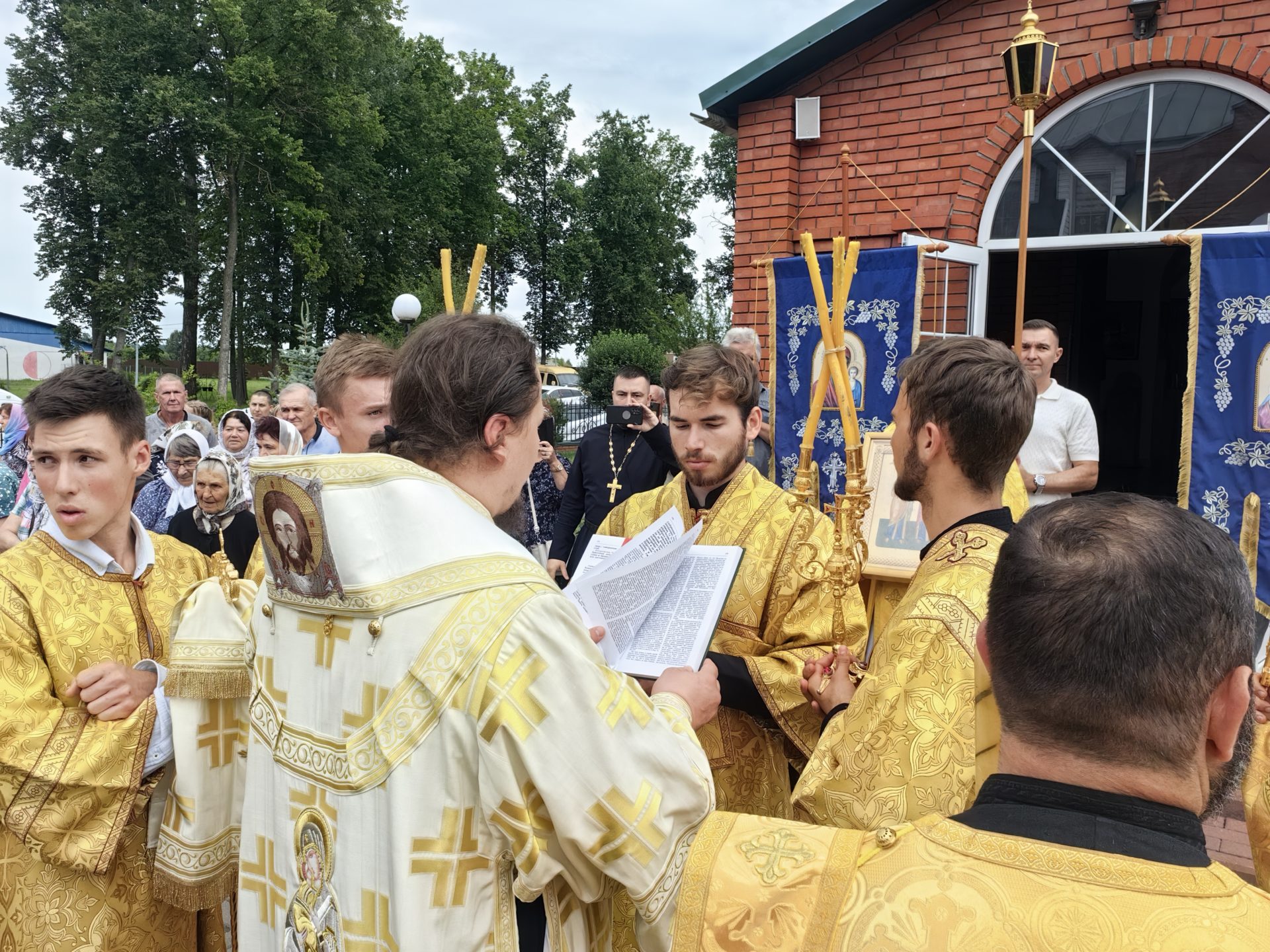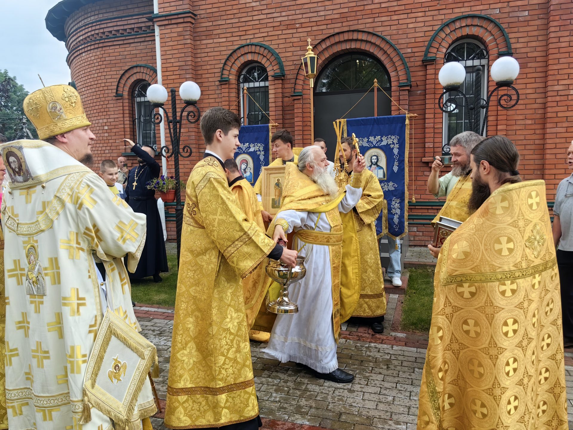 По отпусте Литургии был совершен молебен святым апостолам с Крестным ходом вокруг храма. Епископ и священники окропили верующих святой водой.