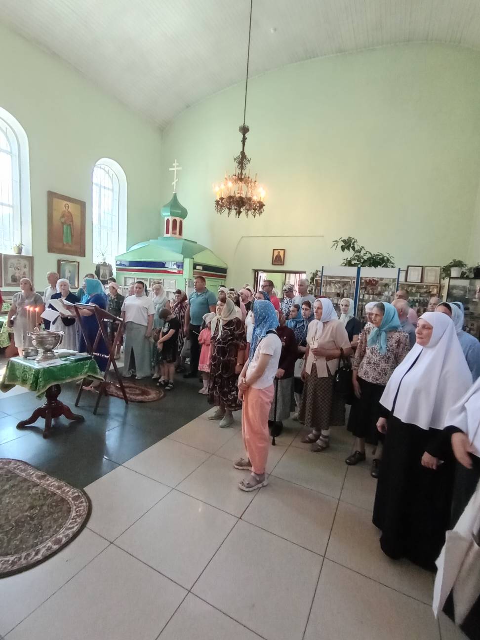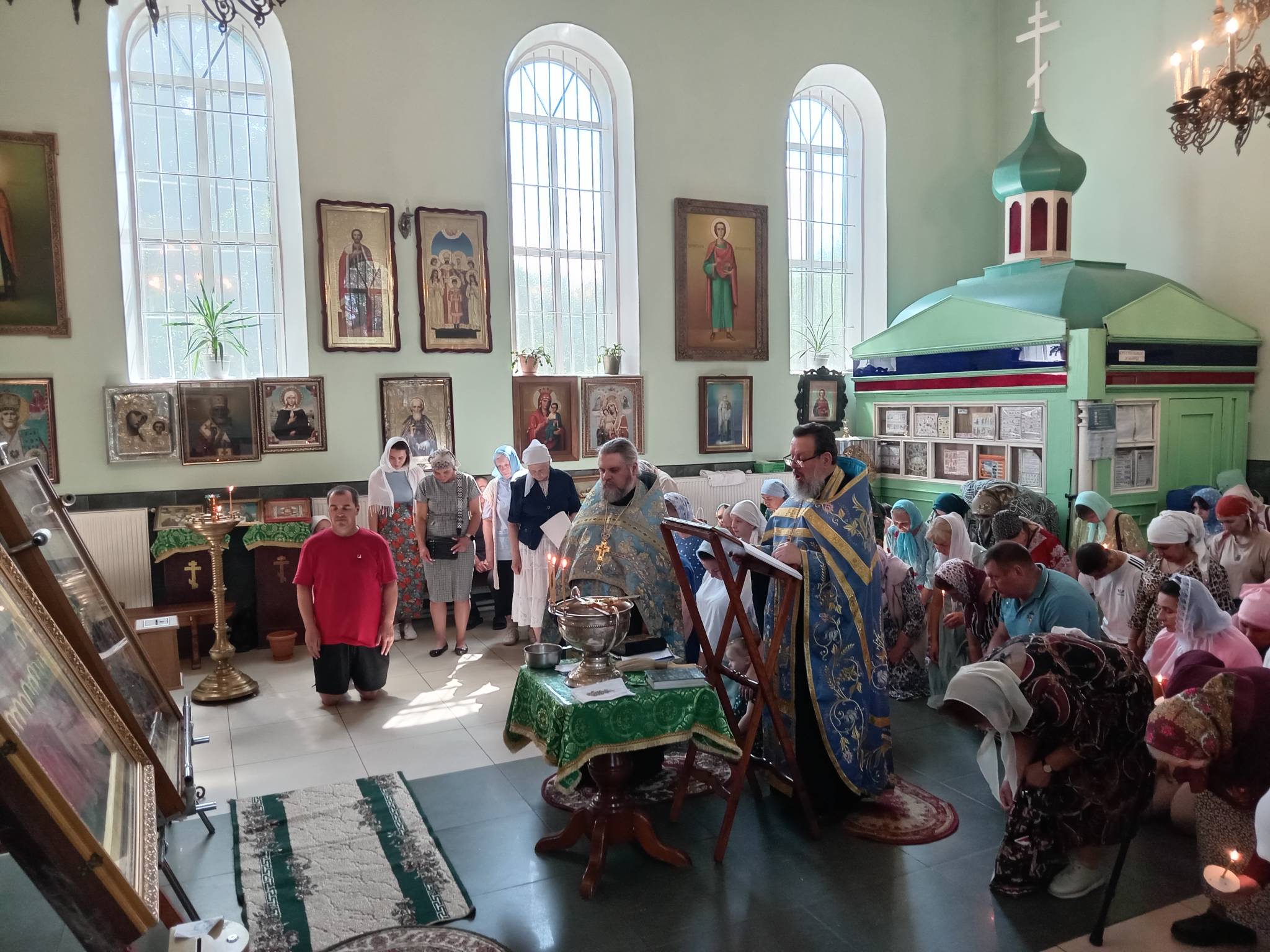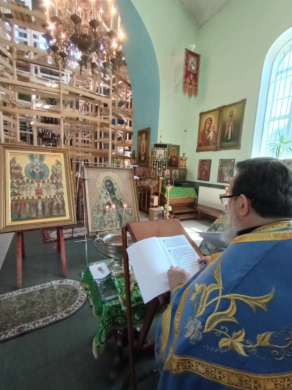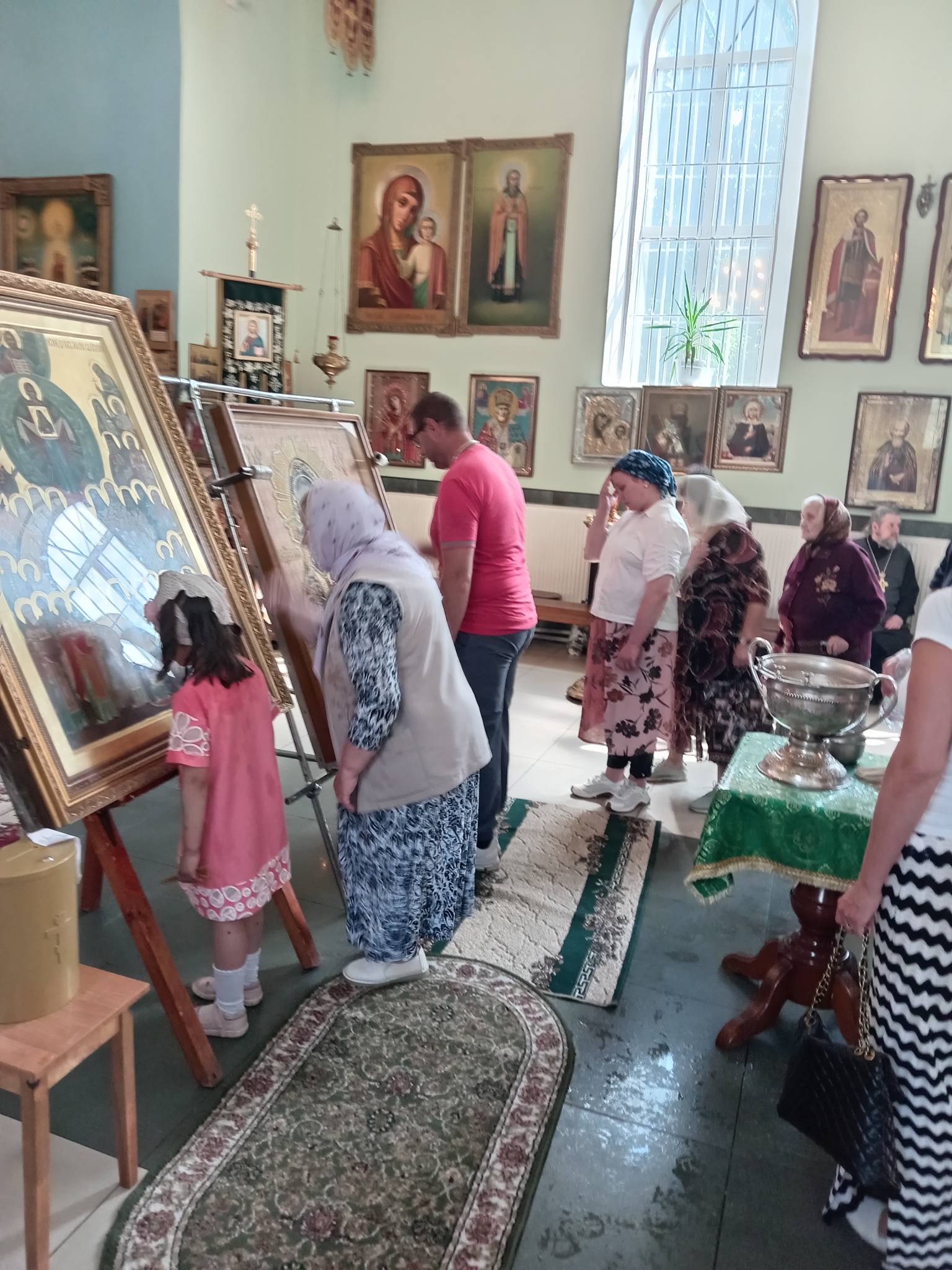 Прихожане храма и жители города Людиново имели возможность помолиться и приложиться к святыням. В храме настоятель храма преподобного Сергия Радонежского протоиерей Василий Биляк, в со служении настоятеля храма Святого Праведного Лазаря протоиерея Михаила Карпенко, совершил молебен с акафистом Божией Матери, а затем обратился к прихожанам с проповедью. «По милости Божией, наш храм вновь посетила чудотворная икона божией Матери «Калужская» и образ «Собор святых новомучеников и исповедников земли Калужской». Перед образом Божией Матери мы молимся и просим, чтобы Она защитила наше отечество, исцелила от разных болезней и недугов. Можно много перечислять те чудеса, которые уже описаны, которые происходили у иконы Божией Матери. Чудотворный образ продолжает помогать людям, с верою и молитвой обращающимся к нему. Главное верить и возносить пламенную молитву каждый раз, как только человек стоит перед Святым ликом. Хочется верить, что каждый верующий сможет почувствовать ту благодать, ту любовь и незримое заступничество оказанное нам!» Затем всех верующих окропили святой водой и все приложились к чудотворному образу Божией Матери и образу  «Собор святых новомучеников и исповедников земли Калужской» . После молебна крестный ход с иконой Калужской Божией Матери отбыл в с.Зикеево.
