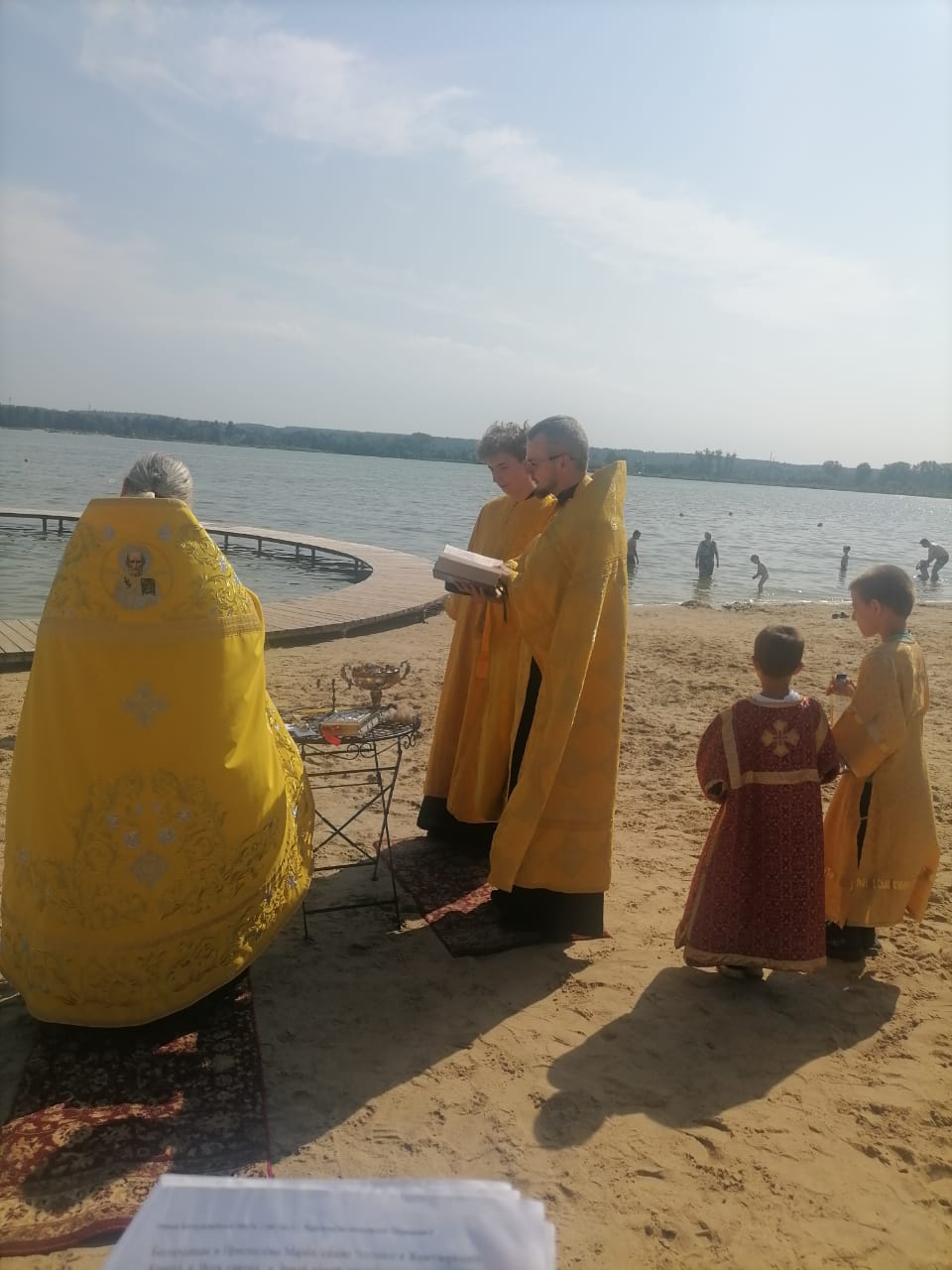У водоёма настоятель Лазаревского храма протоиерей Михаил Карпенко в сослужении клириков Казанского собора иерея Алексия Сначёва и диакона Никиты Агарёва, с певчими и прихожанами собора совершили молебное пение и чин освящения воды.