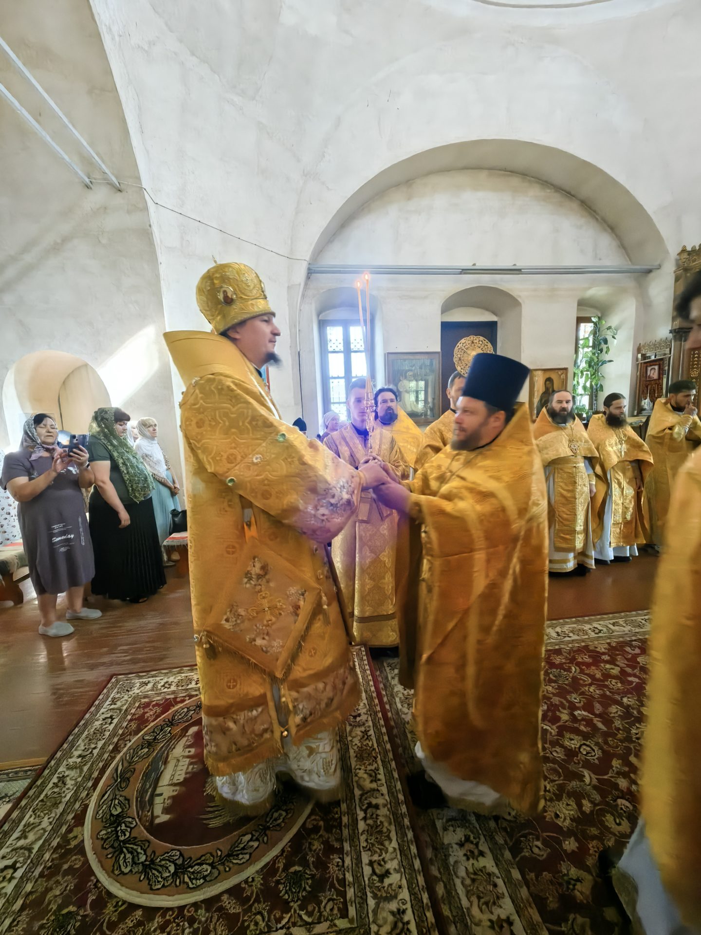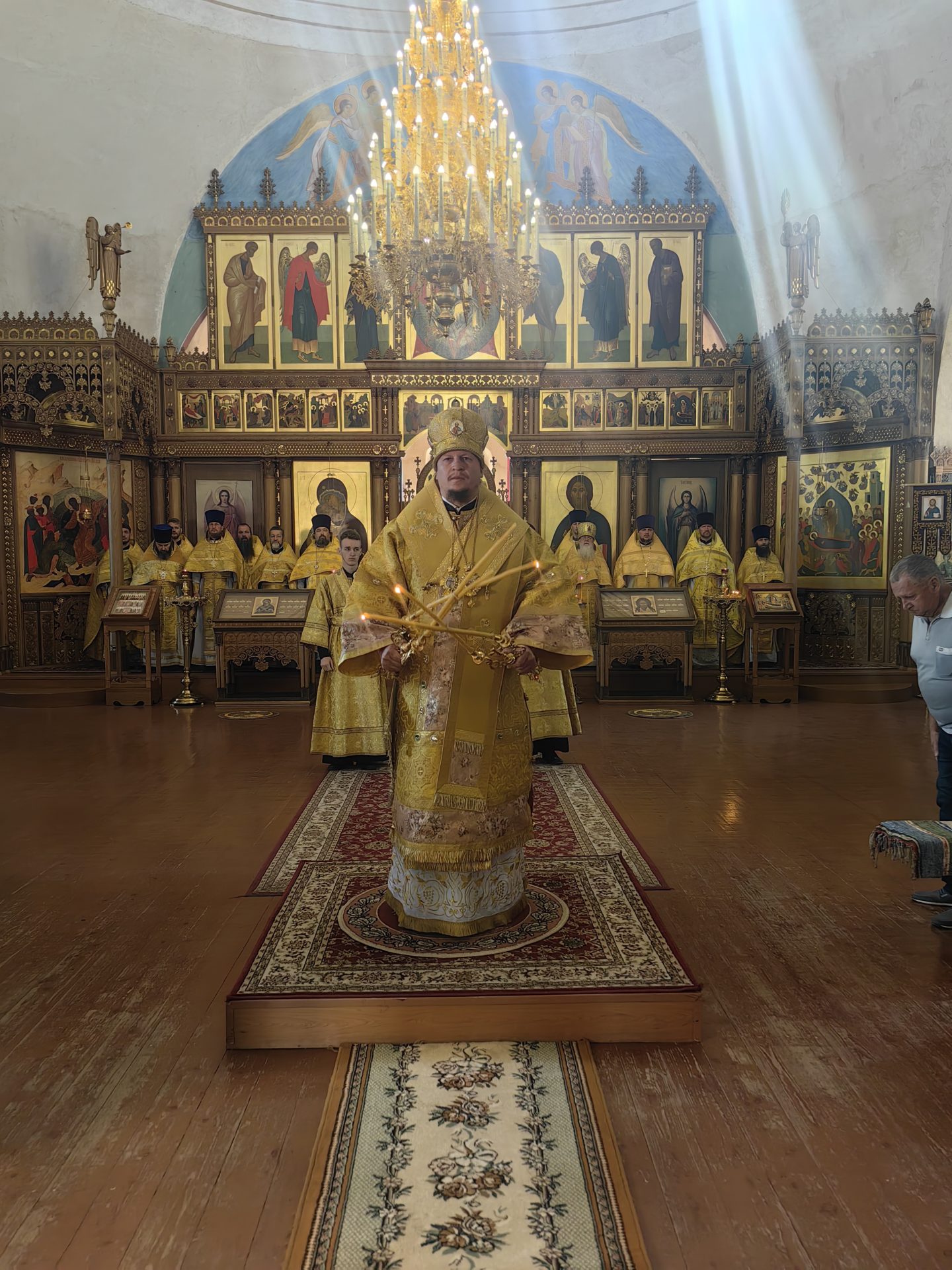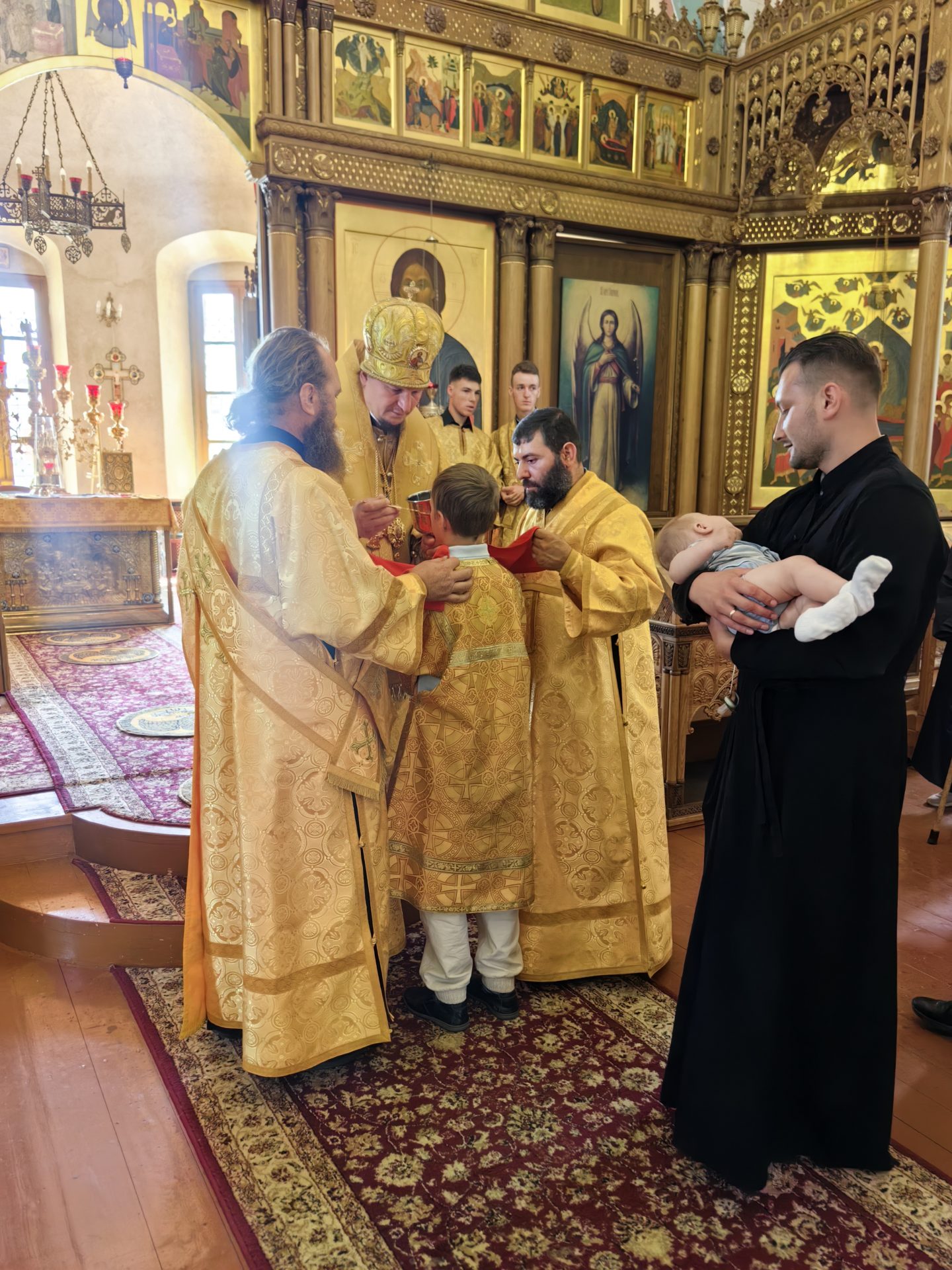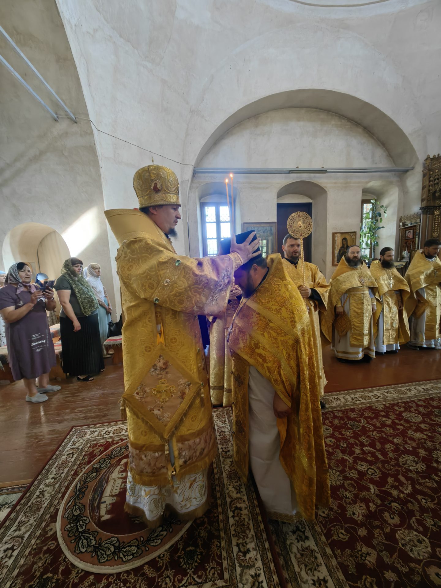 На малом входе епископ Макарий возложил камилавку на священника Олега Леонова, настоятеля храма св. пророка Илии в с. Ильинском.