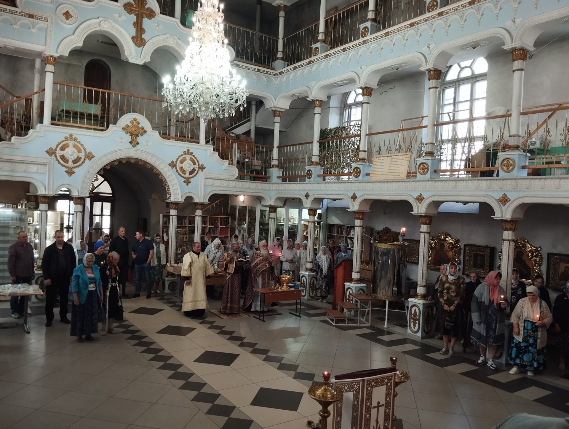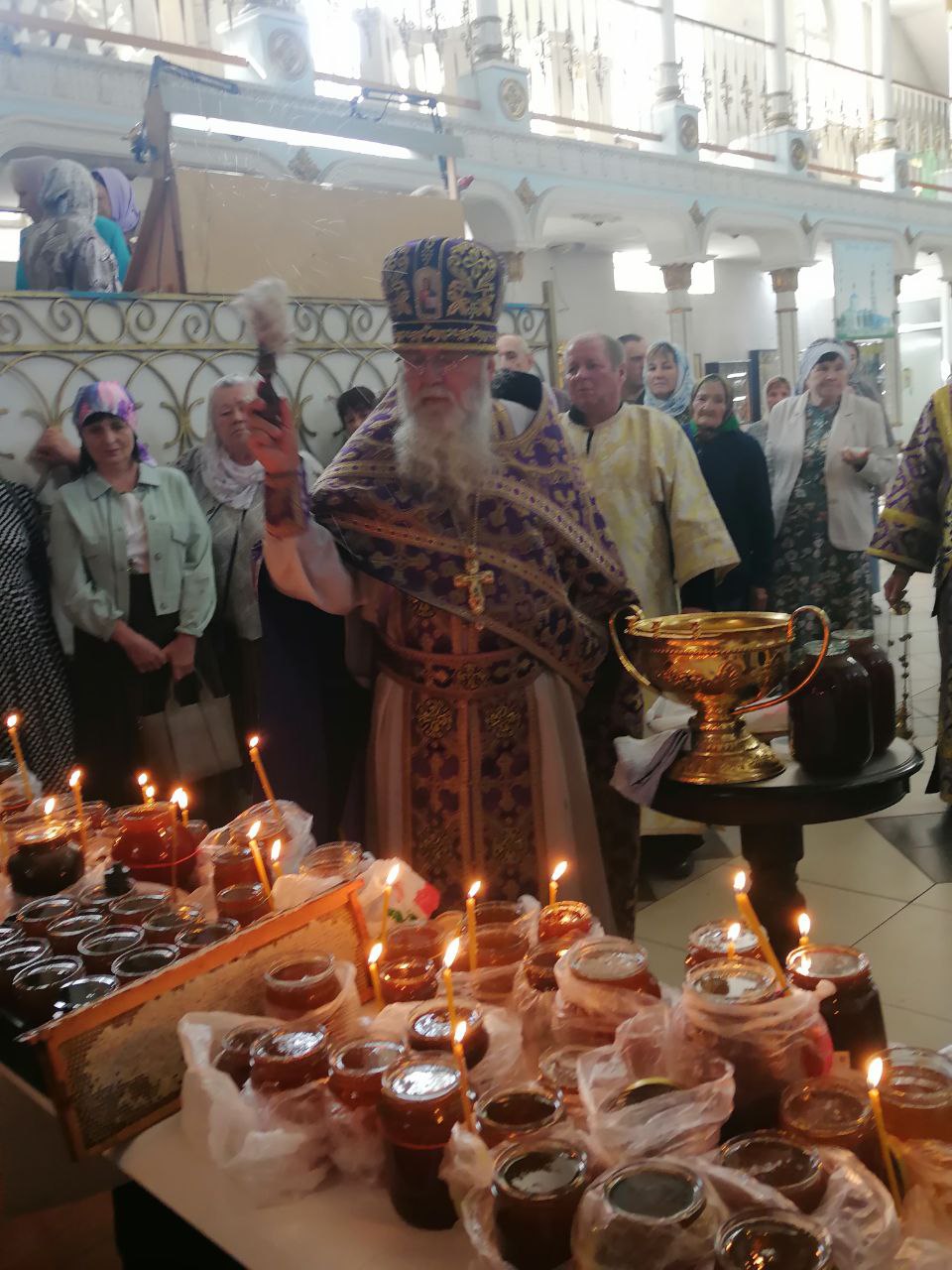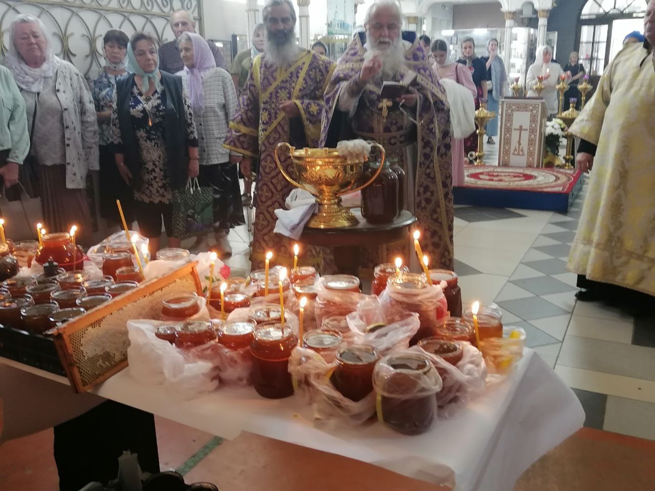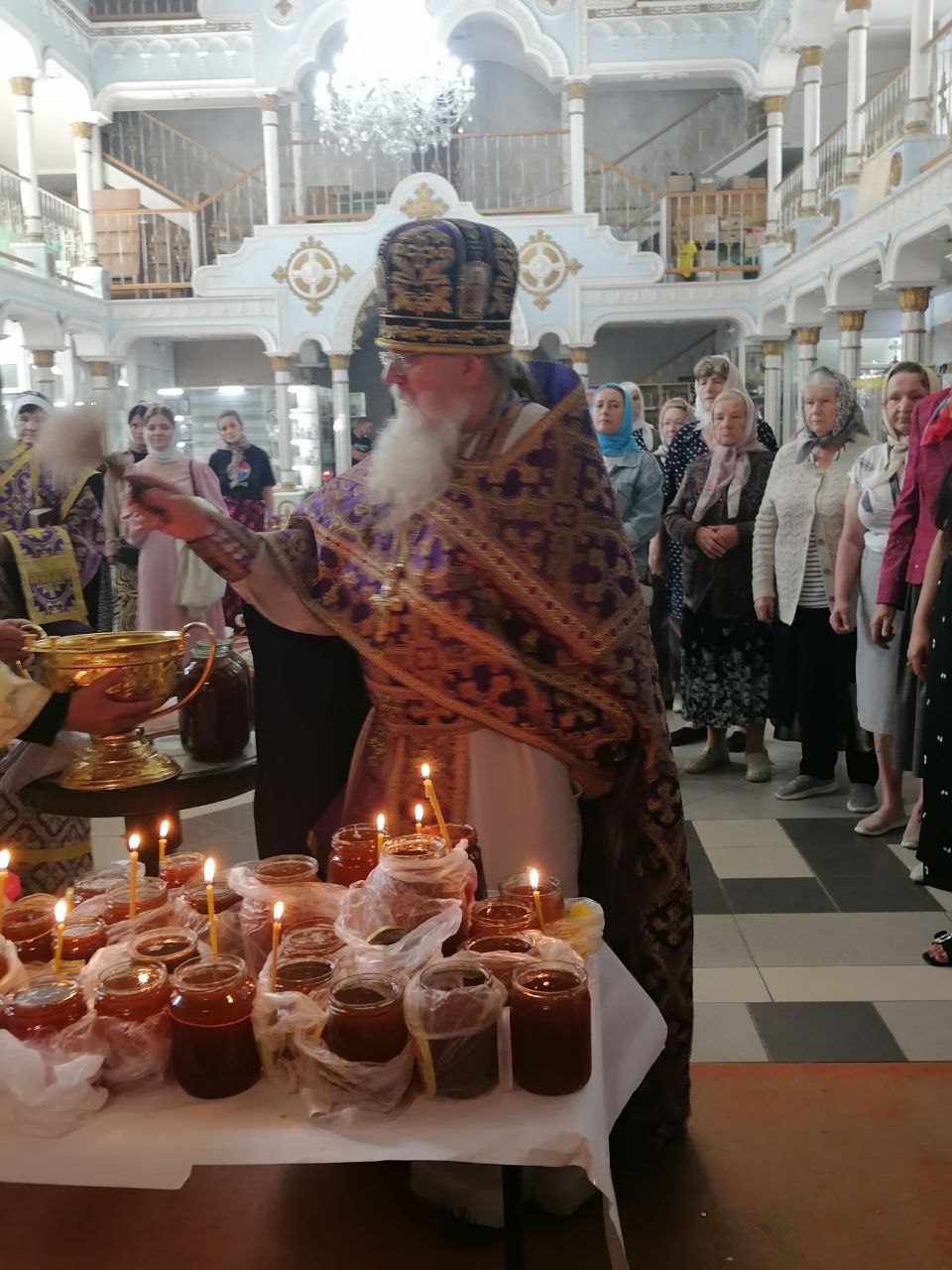 14 августа 2025 года, в сам день происхождения (изнесения) Честных Древ Животворящего Креста Господня,  настоятель Казанского собора города Людиново протоиерей Алексий Жиганов в сослужении диаконов Андрея Соколова и Никиты Агарёва совершили водосвятный молебен с акафистом Честному Кресту Господню и Божественную литургию. Затем отец Алексий совершил  чин освящения меда нового урожая в храме, после чего поздравил прихожан с праздником, пожелав помощи Божией в предстоящем Успенском посте.
