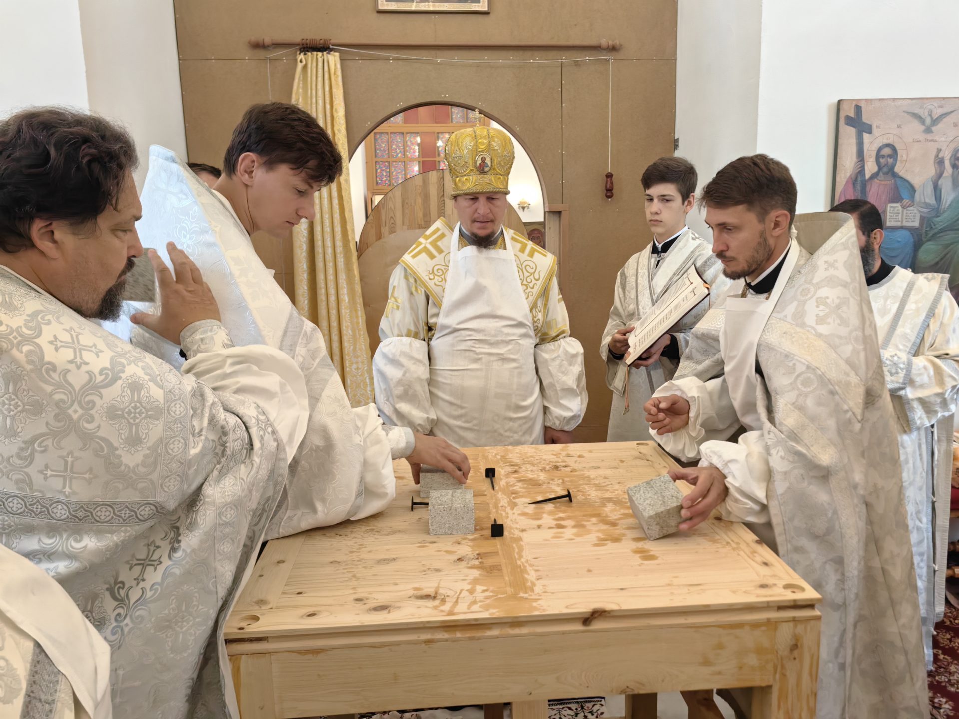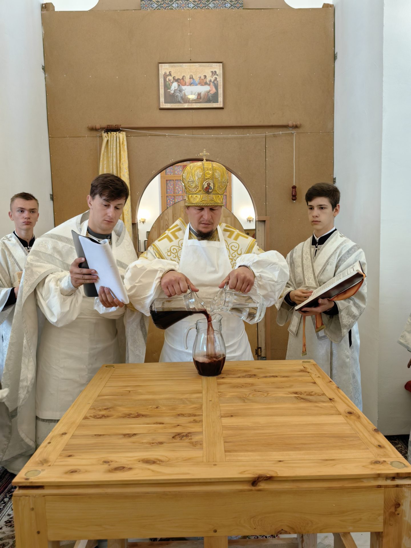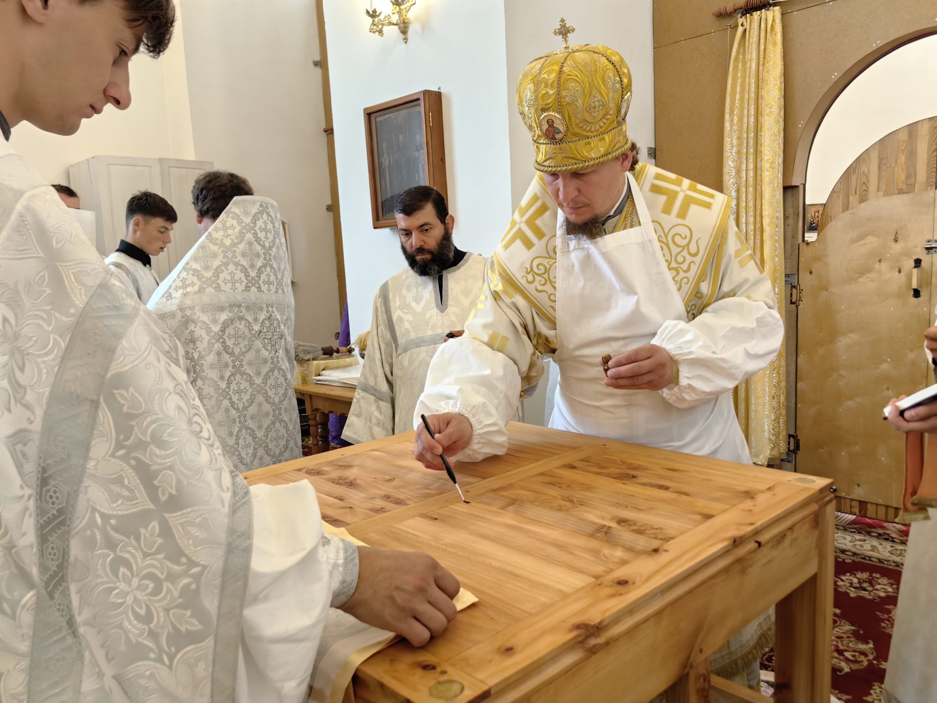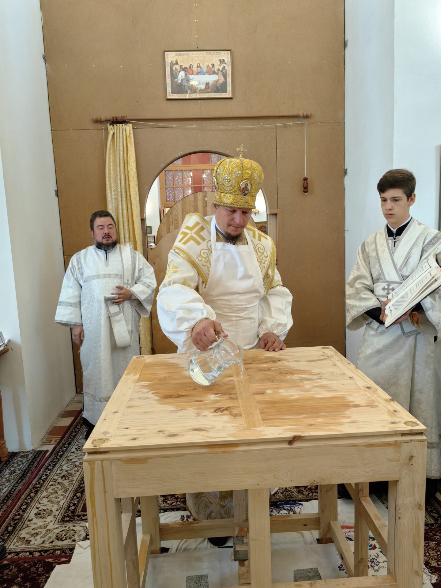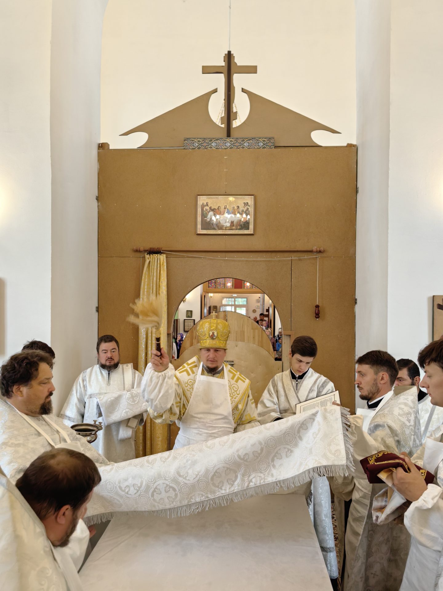 Был совершен чин освящения Святого Престола и жертвенника, затем совершен Крестный ход вокруг храма со Святыми мощами и освящение антиминса.