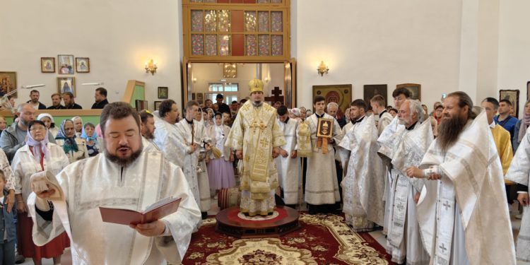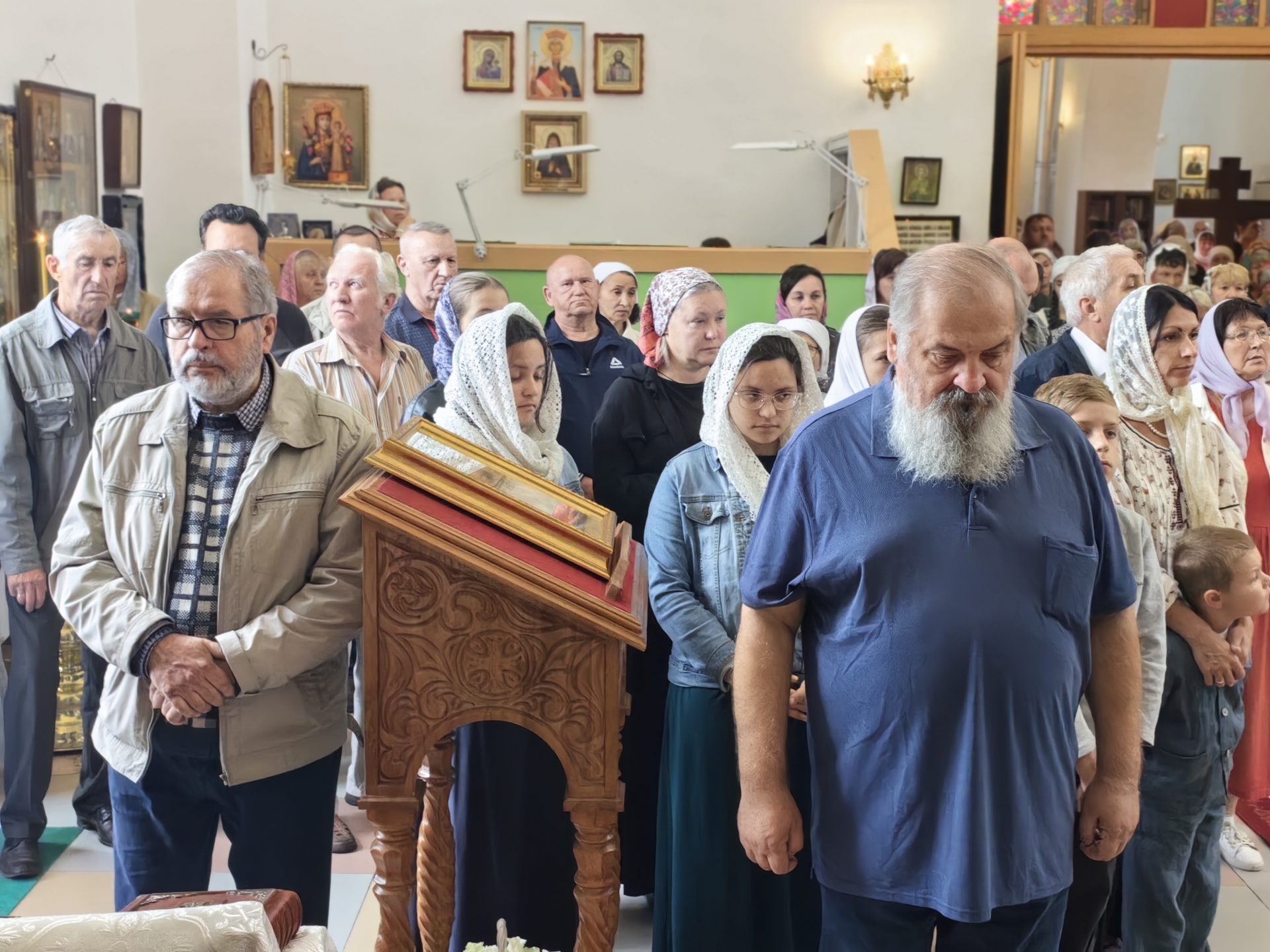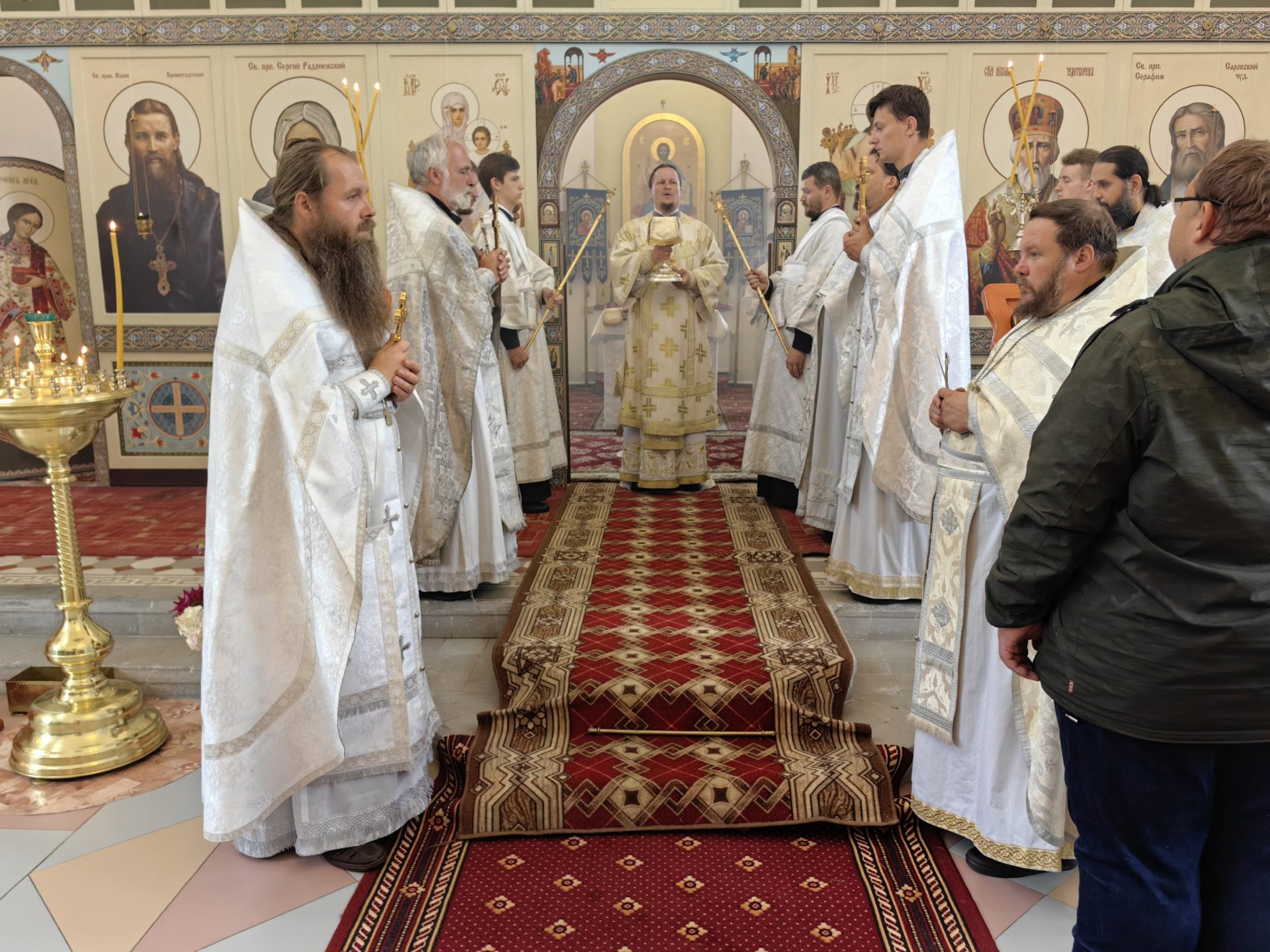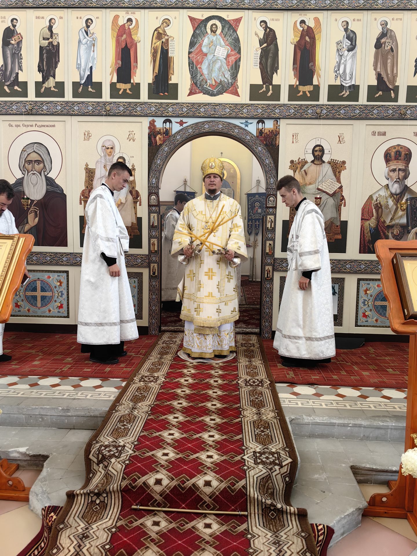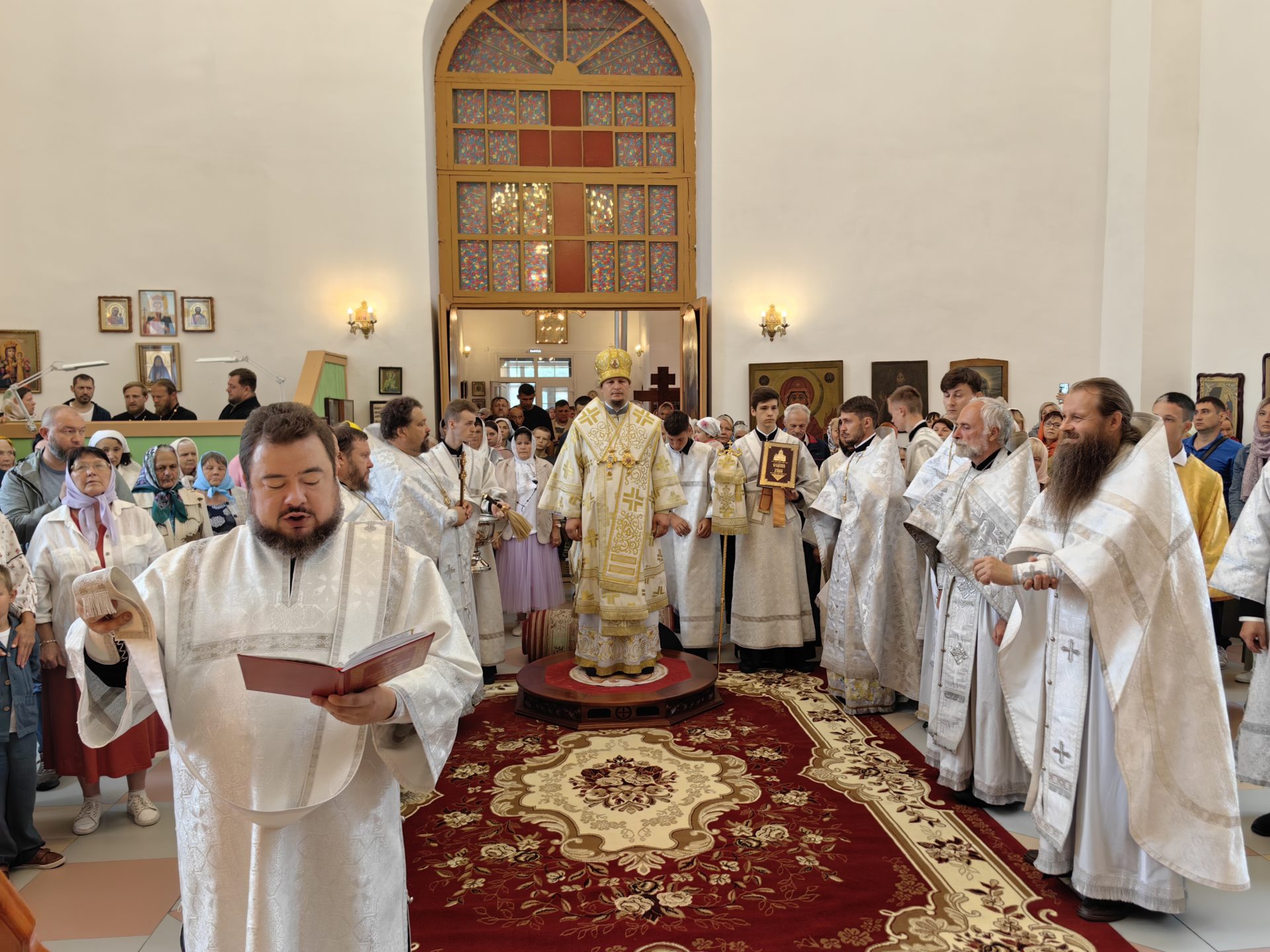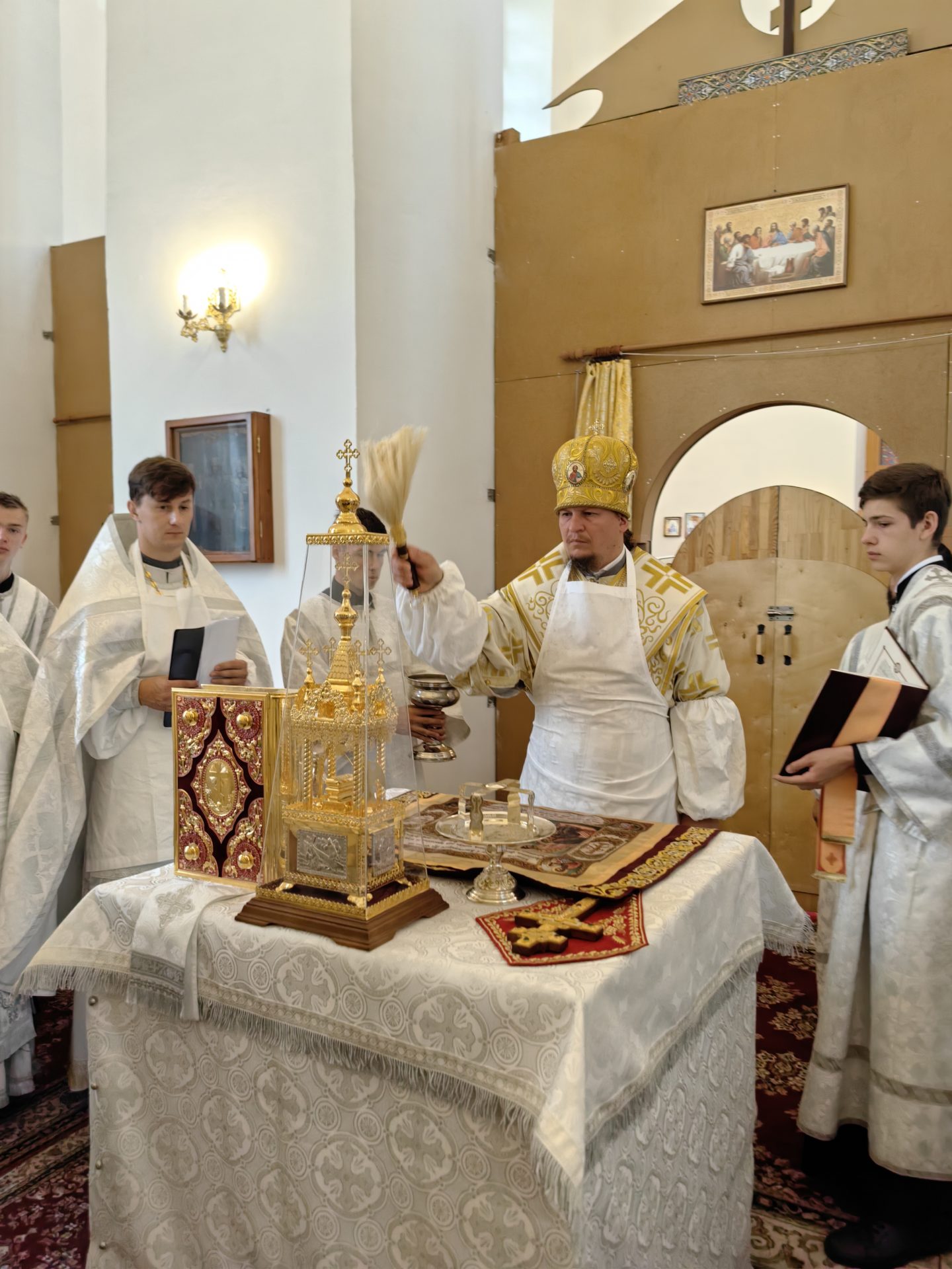 Был совершен чин освящения Святого Престола и жертвенника, затем совершен Крестный ход вокруг храма со Святыми мощами и освящение антиминса.