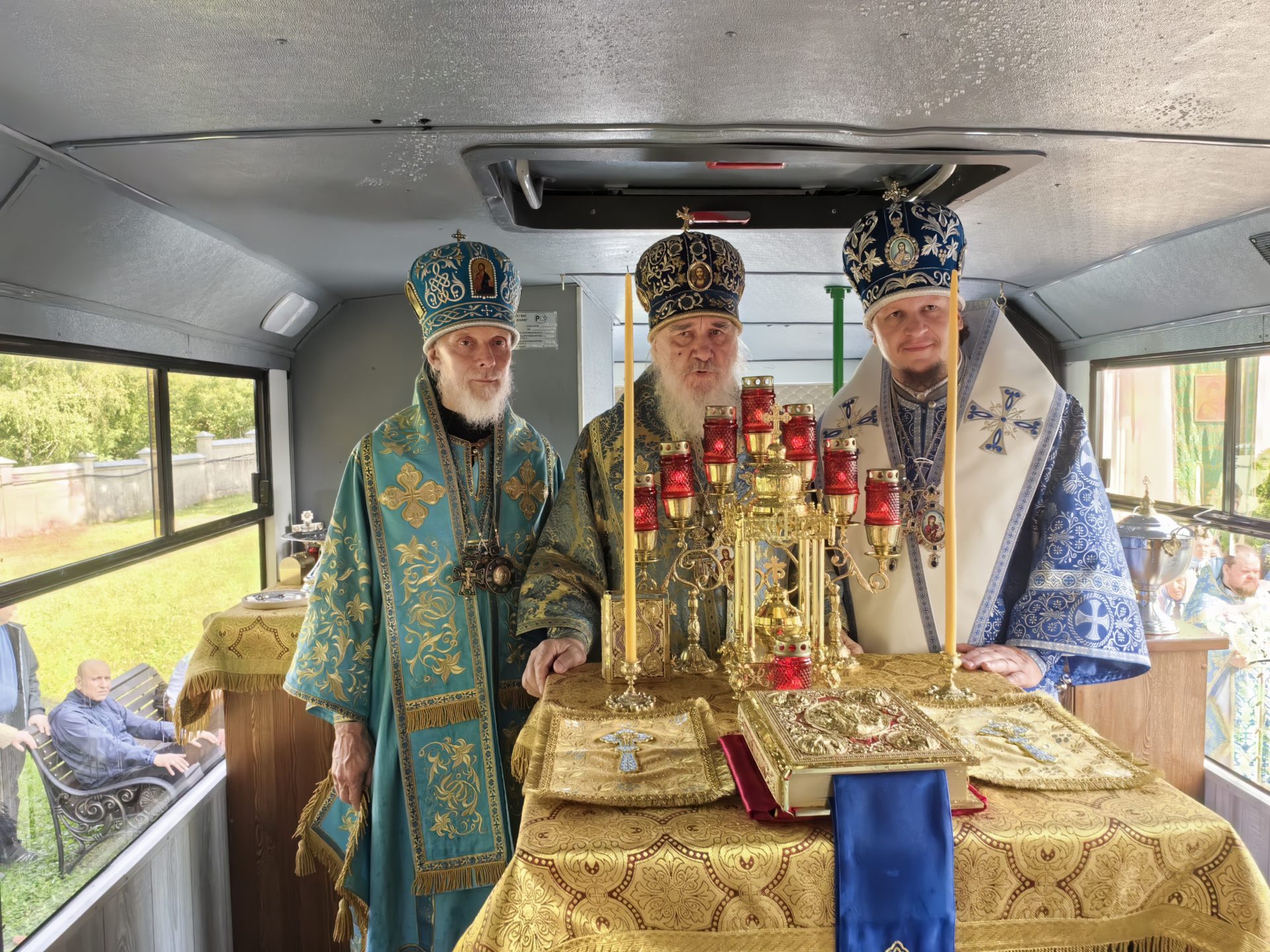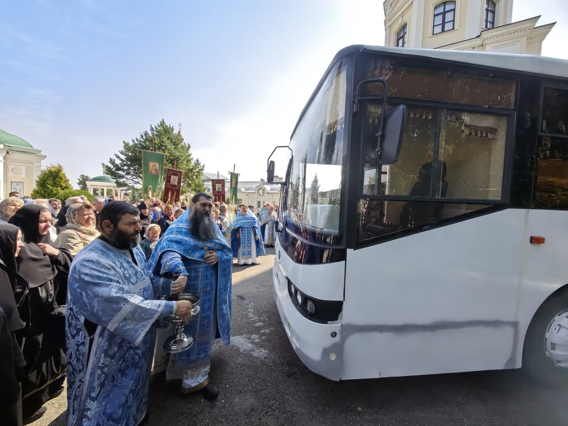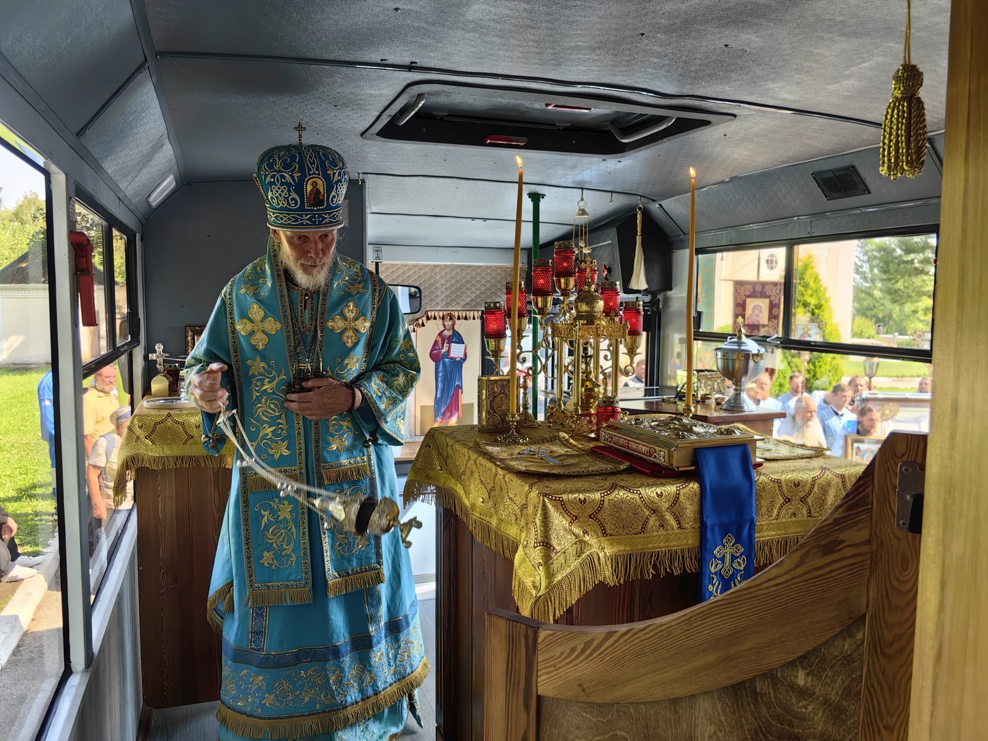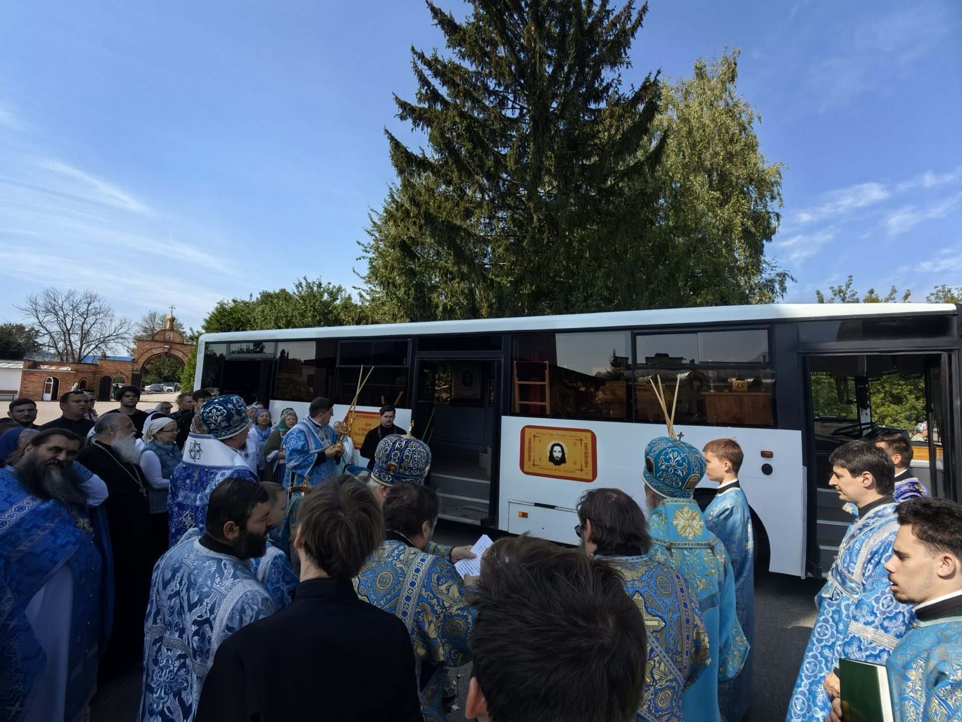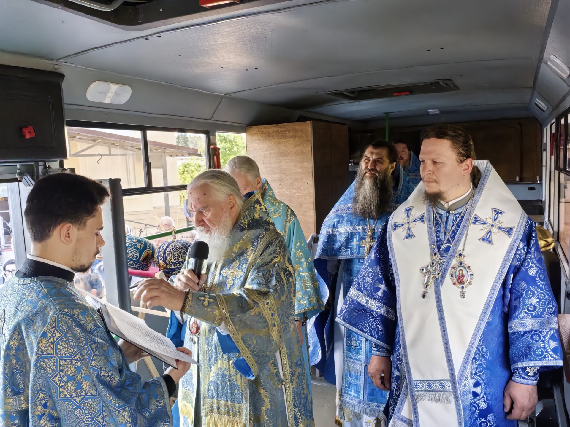 По окончании Божественной Литургии был совершен молебен, Крестный ход вокруг храма и освящение храма на колёсах на базе автобуса, который создан братией обители для посещения отдаленных сел и совершения Божественной Литургии, принесения святынь.