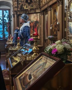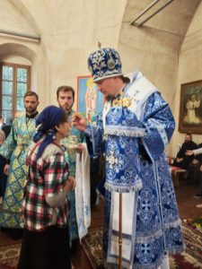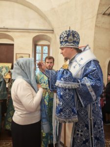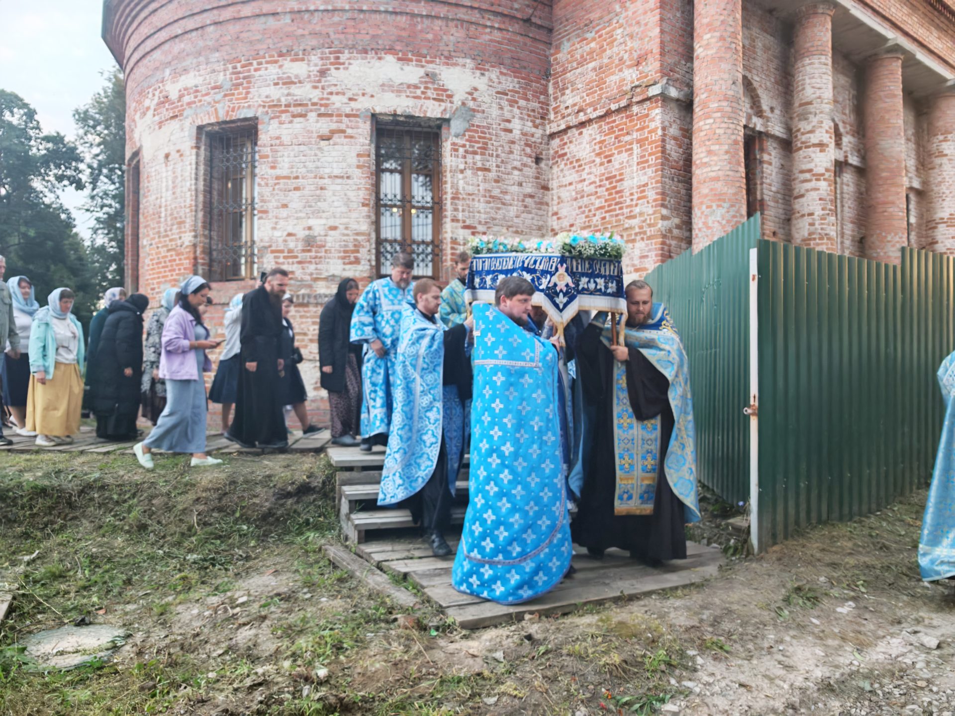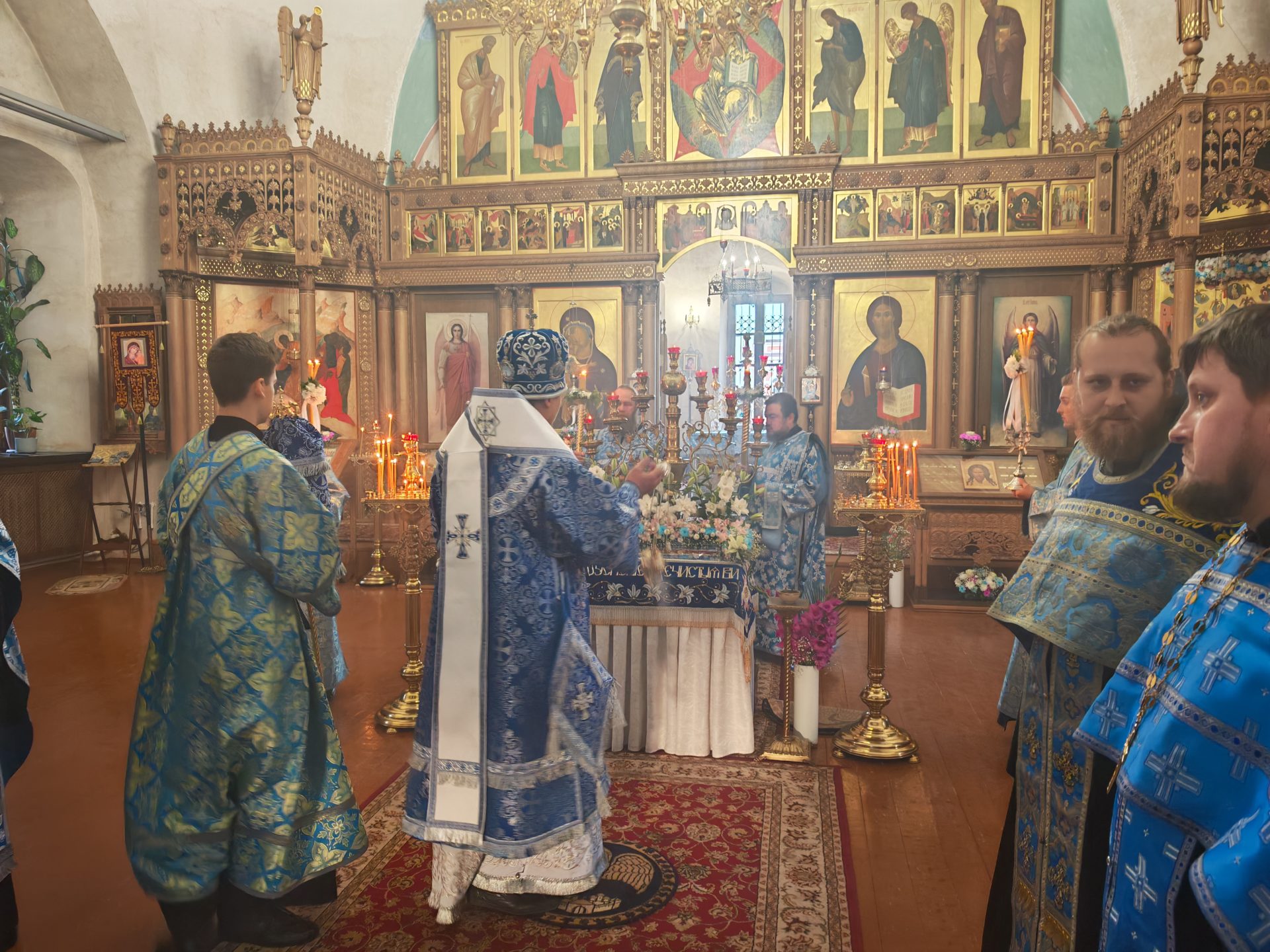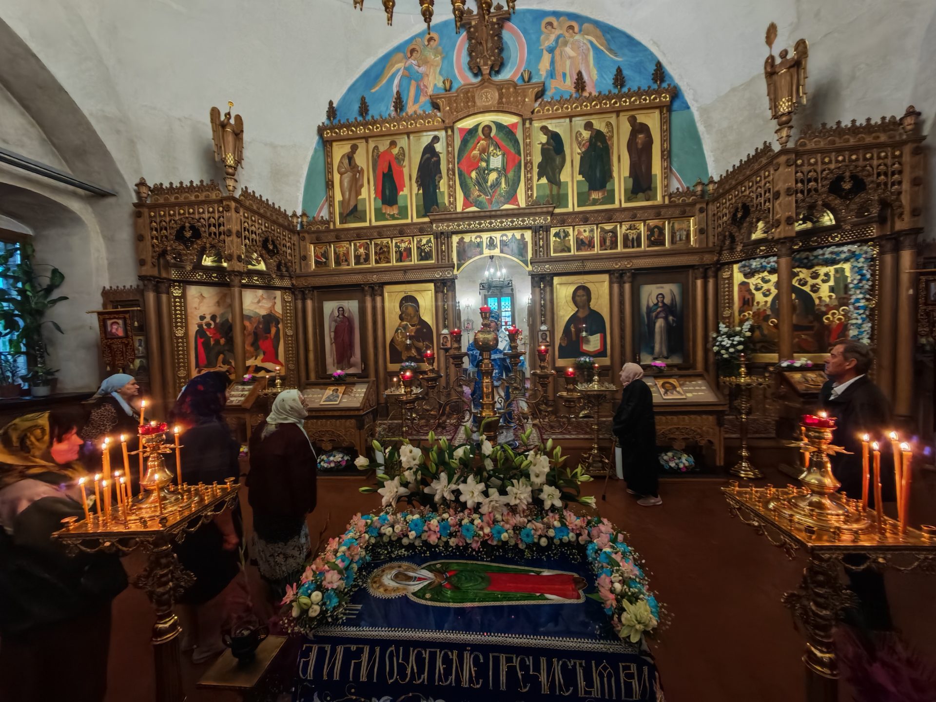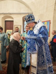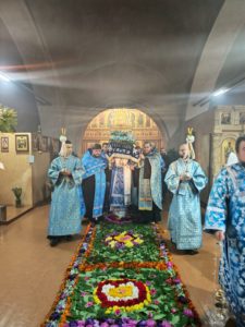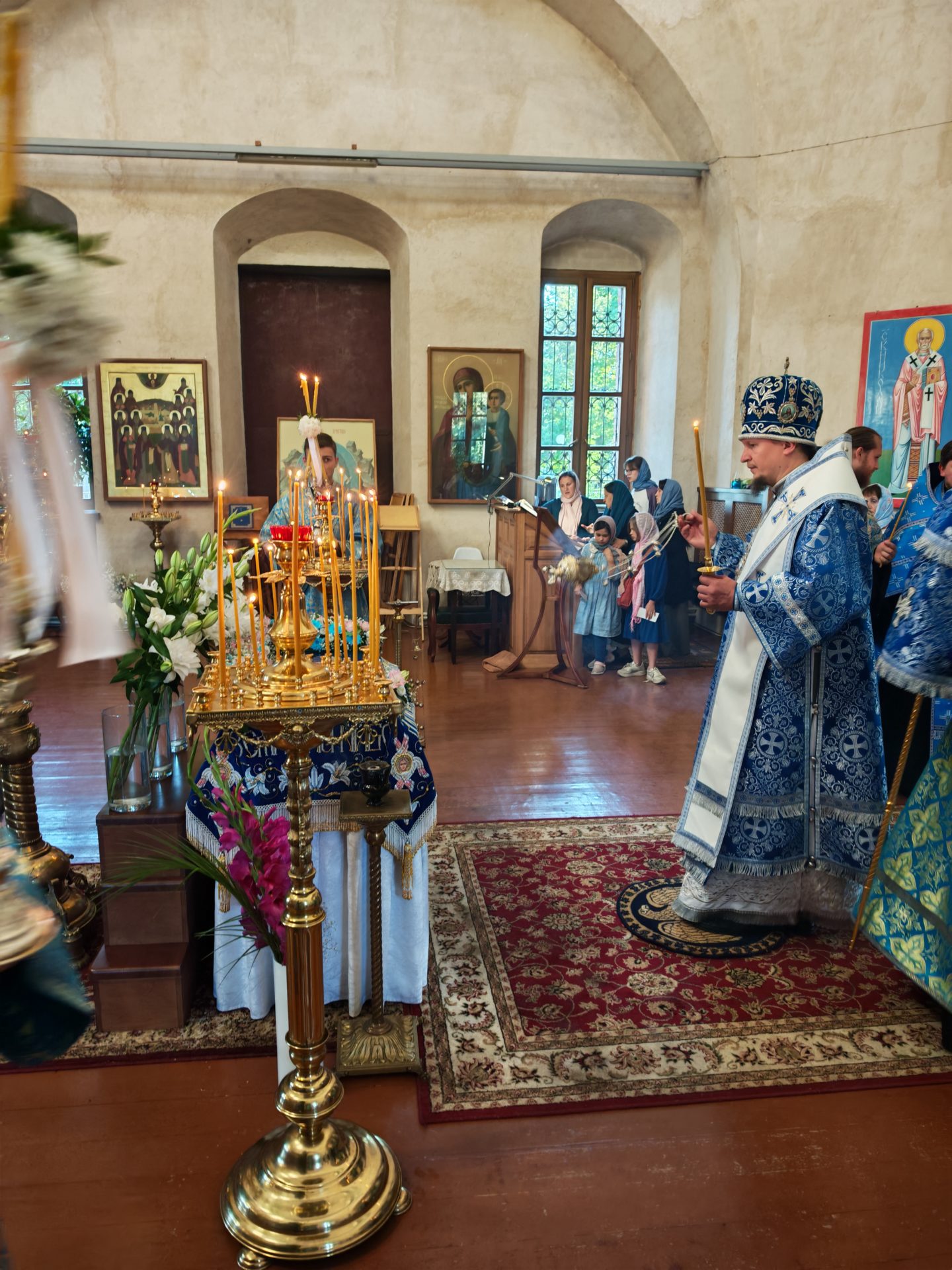 Были прочитаны похвалы Пресвятой Богородице и совершен Крестный ход вокруг храма со святой плащаницей Матери Божией. Епископ помазал верующих освященным елеем.