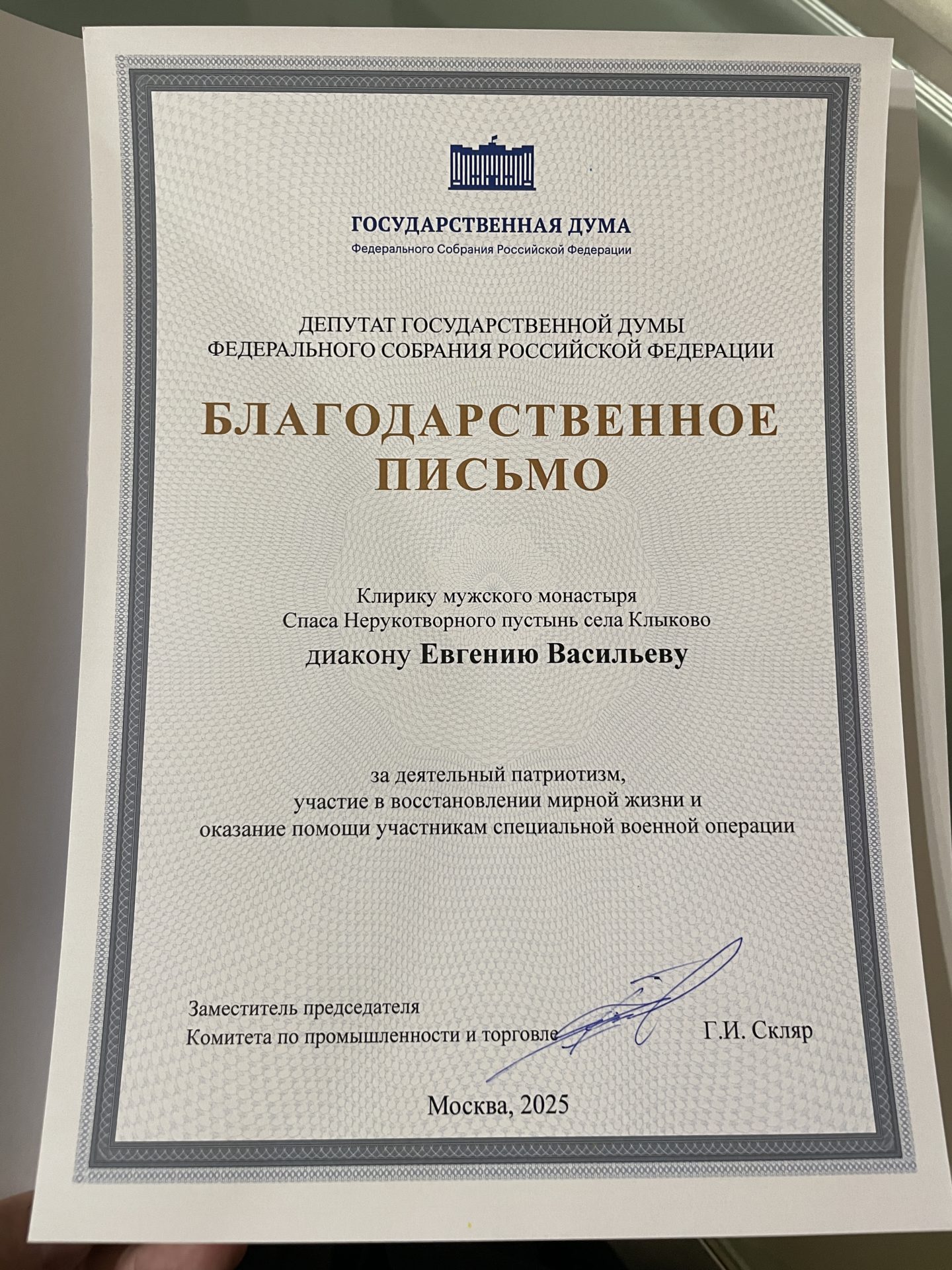 КЛИРИК КОЗЕЛЬСКОЙ ЕПАРХИИ НАГРАЖДЕН БЛАГОДАРСТВЕННЫМ ПИСЬМОМ ЗА ПОМОЩЬ СВО