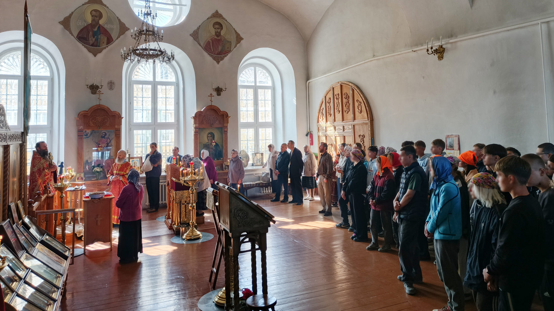 По окончании акафиста к нам присоединились студенты Сухиничского колледжа Транспорта и сервиса. Настоятель храма иерей Сергий Дрозд окропил всех собравшихся святой водой и благословил главной храмовой святыней — Крестом-мощевиком, подаренным в 1740 году на открытие храма храмостроителем Дмитрием Андреевичем Шепелевым.