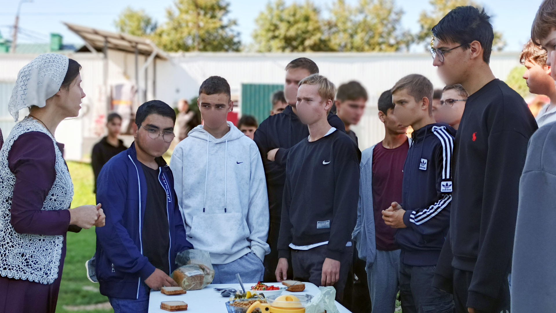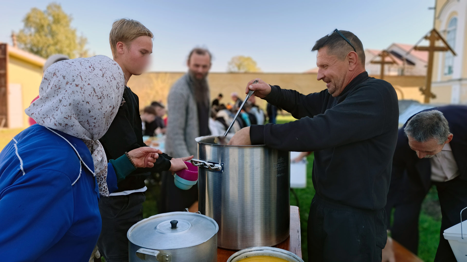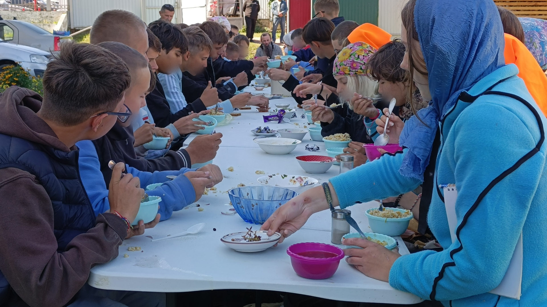 Затем прихожанами была организована трапеза на открытом воздухе с пловом «на дровах» и домашними угощениями. По окончании трапезы епархиальный координатор по утверждению трезвости иерей Сергий Дрозд провёл с ребятами экскурсию по храму и  беседу о счастье и смысле жизни.