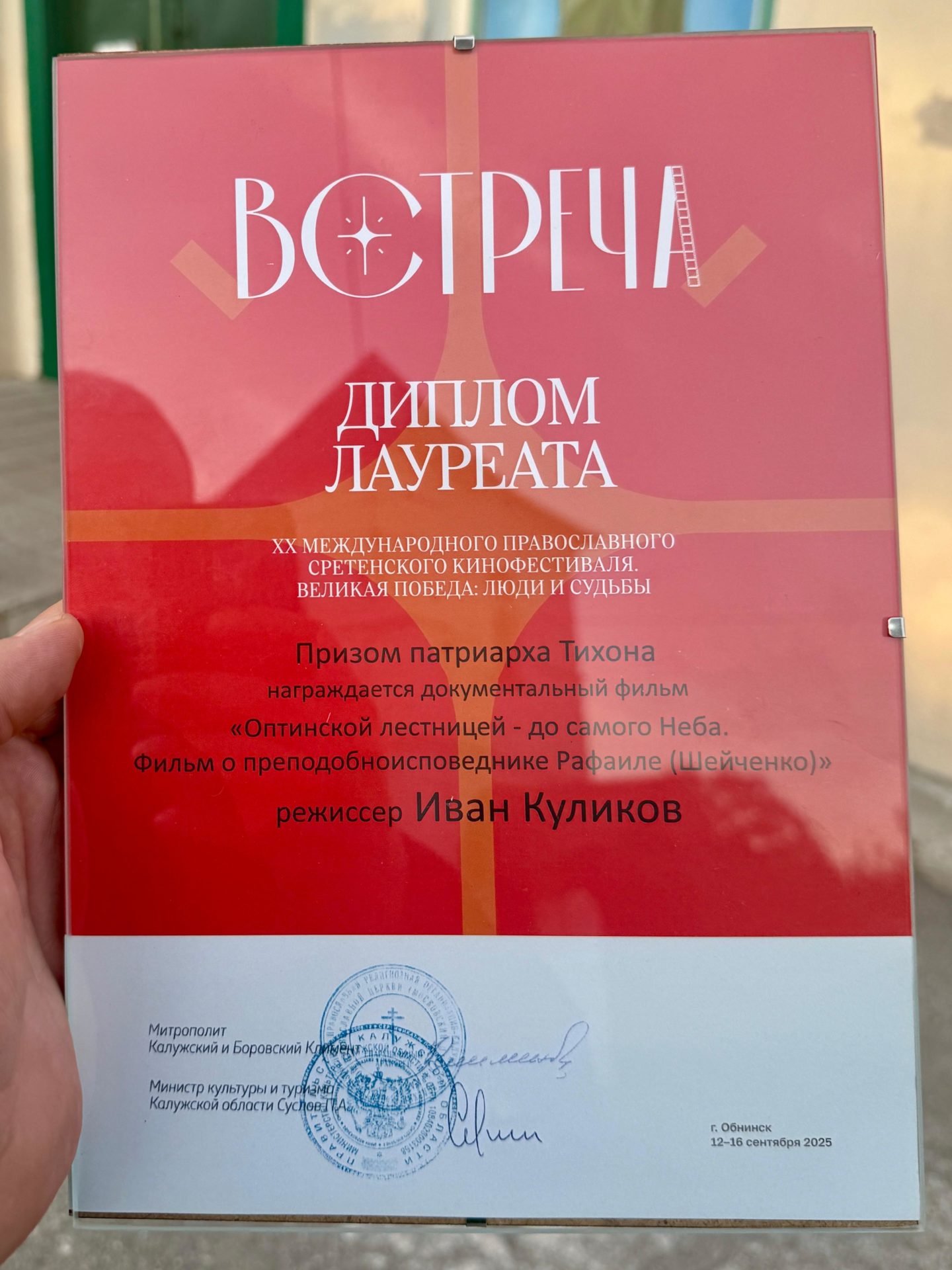 Фильм «Оптинской лестницей до самого неба» получил диплом лауреата и был награжден призом Патриарха Тихона.