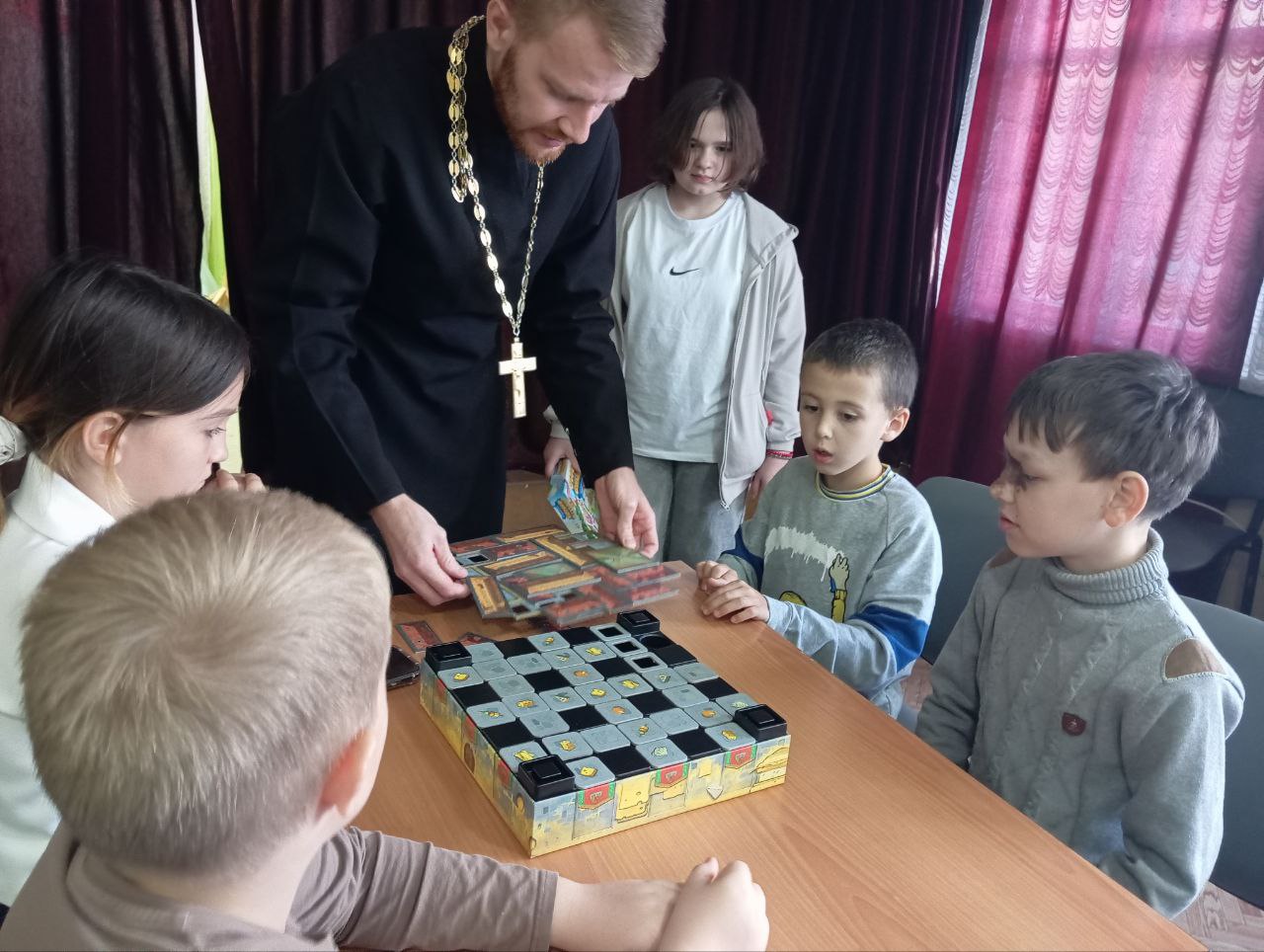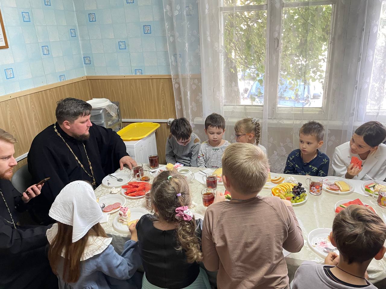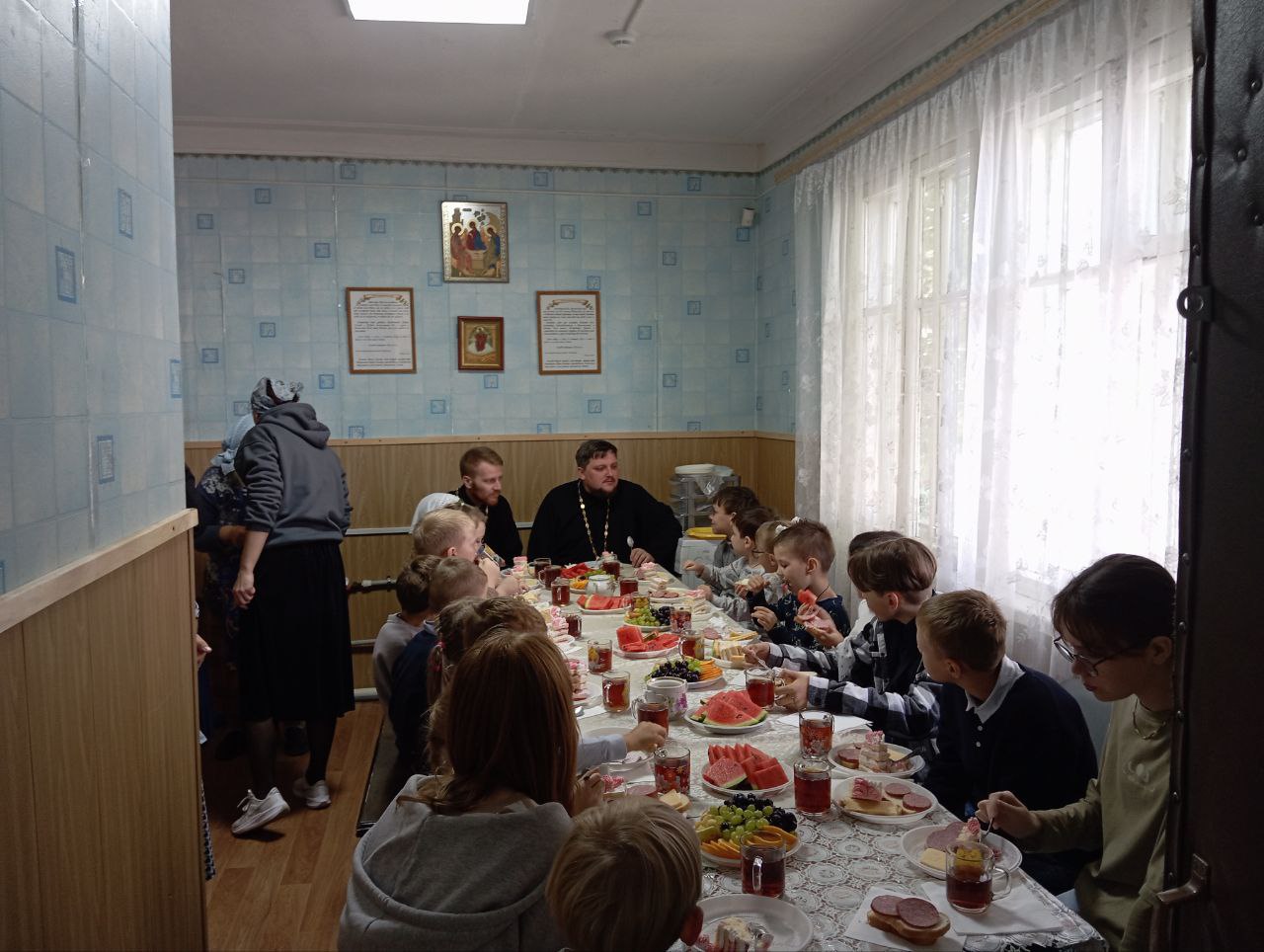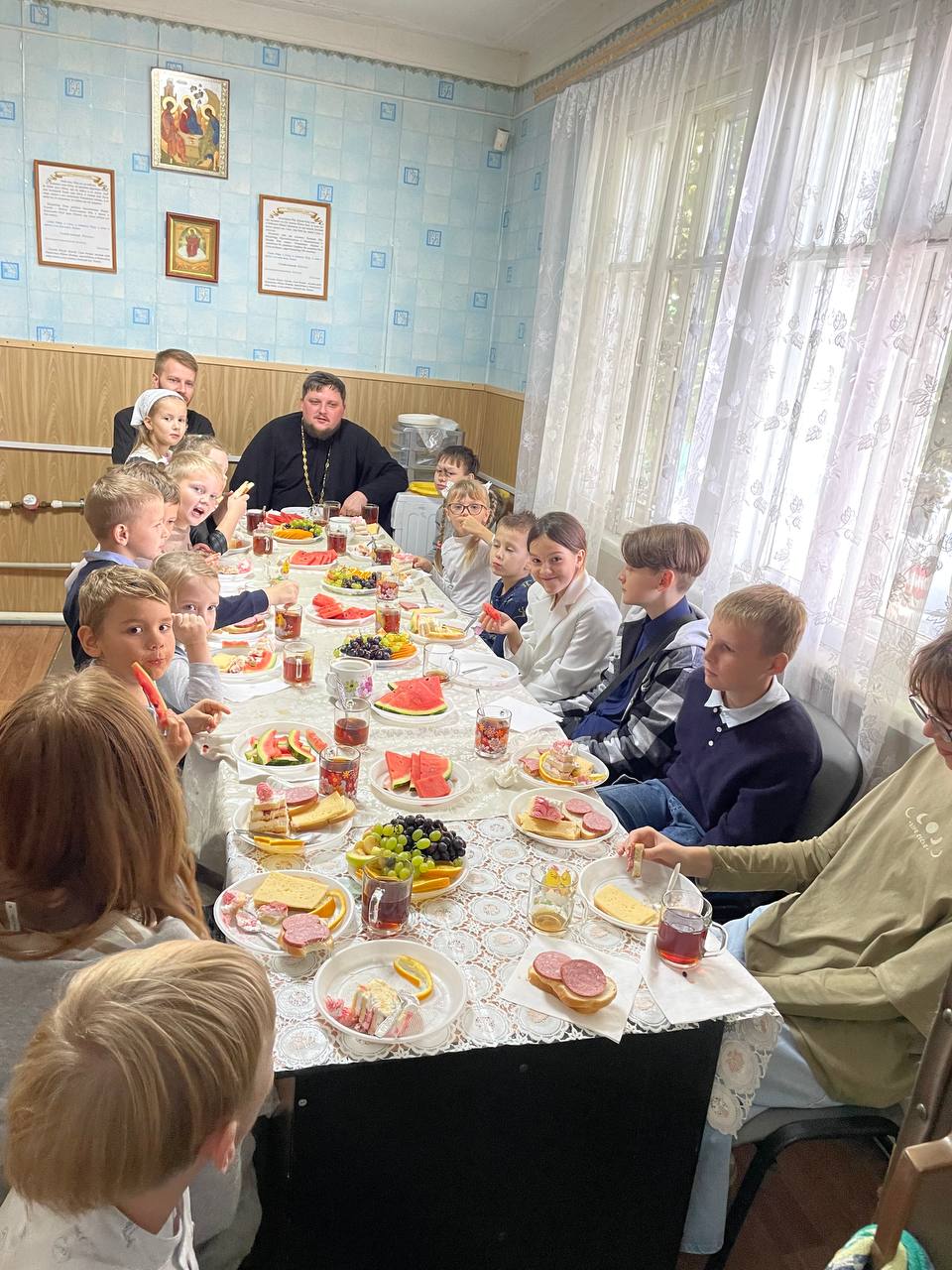 Далее всех ребят и преподавателей ждал настоящий праздник в детском центре «Возрождение»! Учащиеся познакомились с настоятелем собора, иереем Иоанном Майоровым, который тепло поприветствовал всех собравшихся.