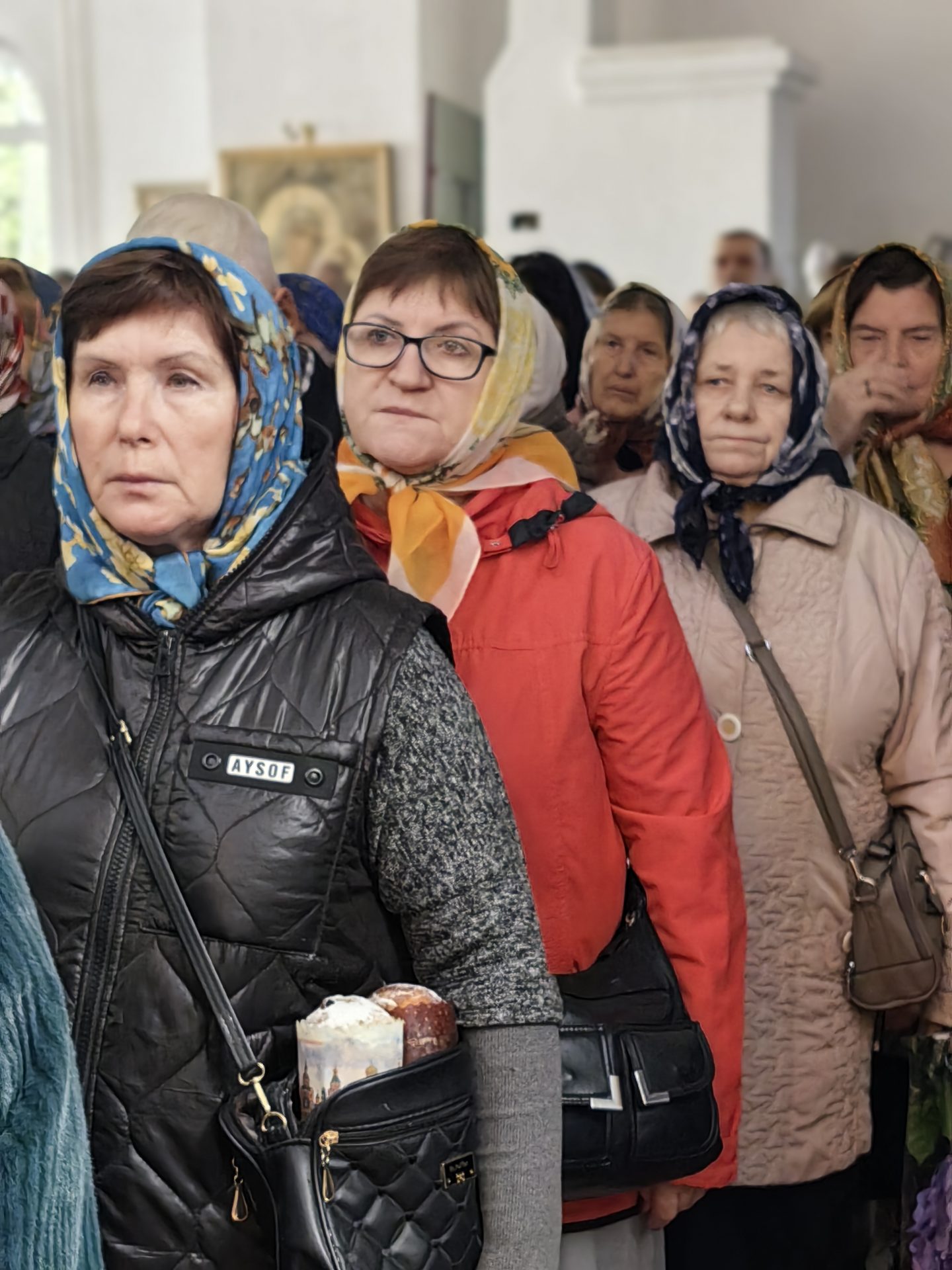 По окончании Литургии был совершен Пасхальный Крестный ход вокруг храма. Епископ и священники окропили верующих святой водой.