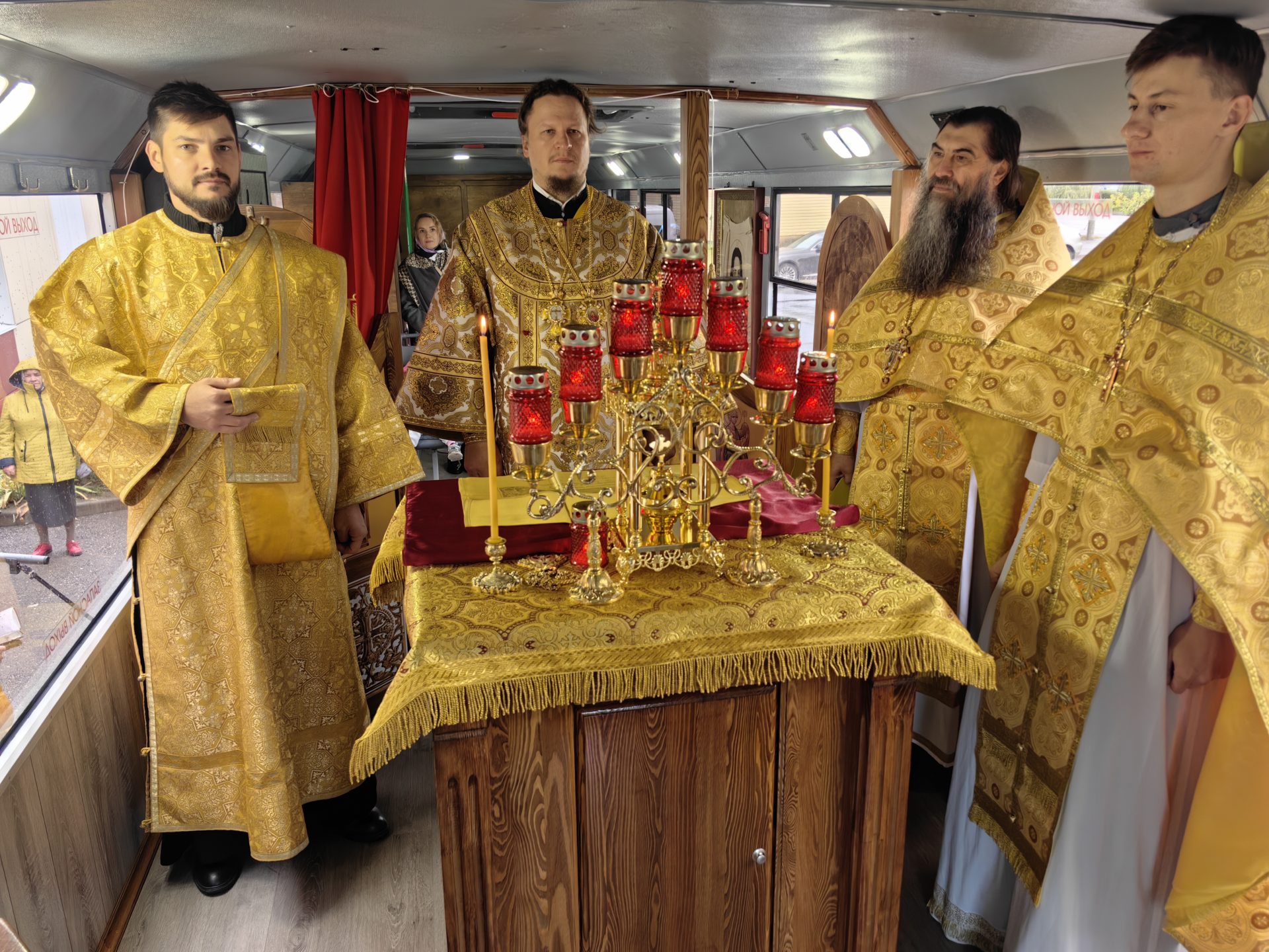 В посёлок Стекольный завод передвижной храм прибыл накануне вечером. В воскресный день Божественную Литургию совершил епископ Козельский и Людиновский Макарий в сослужении наместника Спаса-Нерукотворного Клыковой пустыни архимандрита Михаила (Семёнова), Секретаря Епархиального совета священника Филиппа Лисенкова, диаконов Евгения Васильева и Сергия Акопяна.