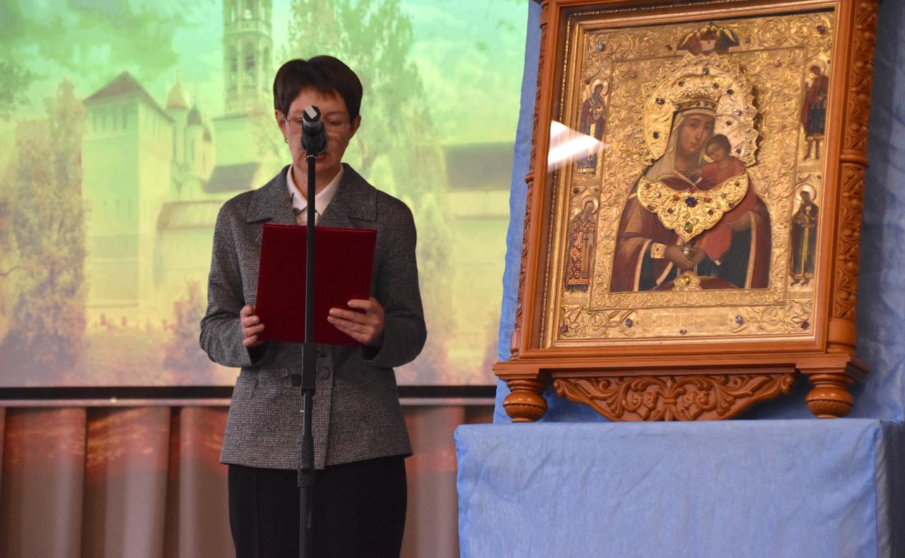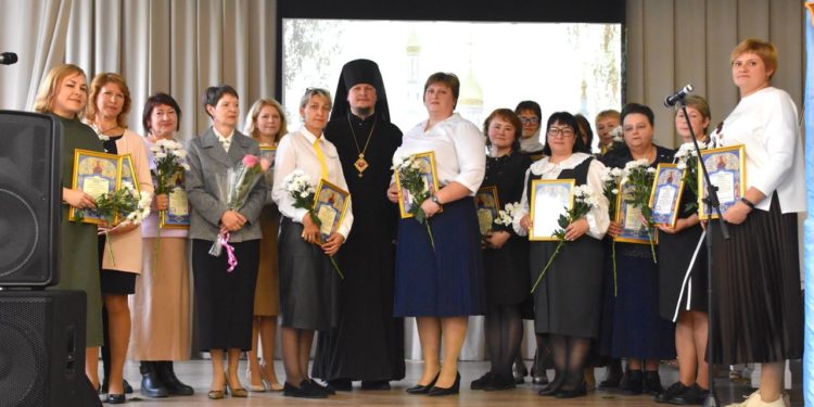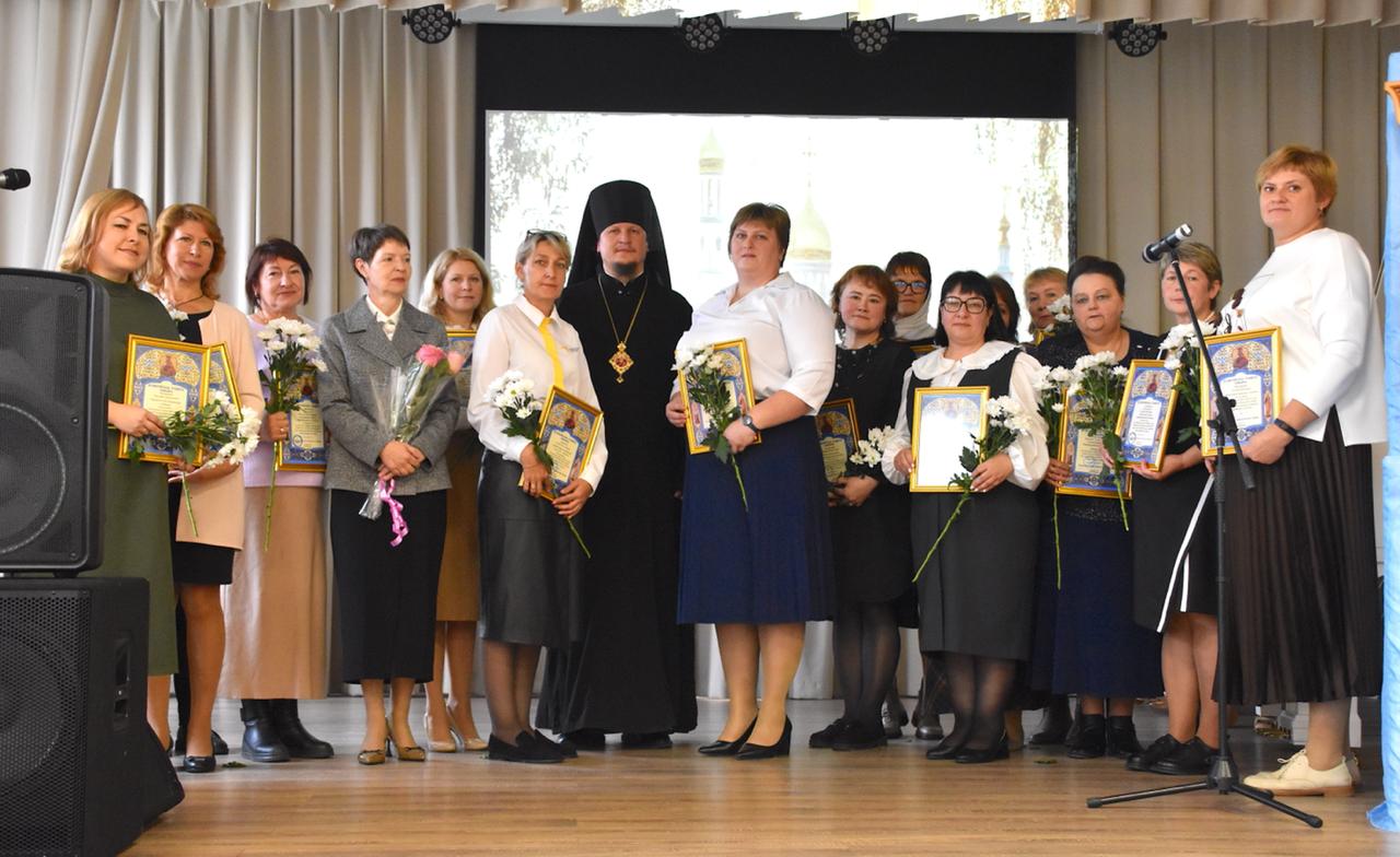 Затем Владыка Макарий с протоиереем Алексием Жигановым вручили руководителям и педагогическим работникам из семи районов Калужской области Архиерейские награды за усердные труды во славу Русской Православной Церкви и цветы. Юбилейные знаки 10-летия образования Козельской епархии были вручены Марине Денисовой — заведующей отделом образования администрации муниципального района «Город Людиново и Людиновский район» и Елене Башкировой — директору музейно-краеведческого центра «Музей комсомольской славы» Людинова. Архиерейских грамот были удостоены: Евгения Федорова — старший воспитатель Людиновского Детского сада №6 «Дюймовочка», Елена Ведюшкина — учитель ОПК Игнатовской основная общеобразовательной школы Людиновского района, Любовь Бойкова — советник директора по воспитанию и взаимодействию с детскими общественными объединениями Дудоровской средней общеобразовательной школы, Светлана Михеева — муниципальный координатор преподавания курса ОПК в Ульяновском районе, Оксана Кочеткова — учитель начальных классов Думиничской средней общеобразовательной школы № 2, Татьяна Павлютенкова — учитель начальных классов Думиничскаой средней общеобразовательной школы № 3, Елена Бодрова — учитель начальных классов, советник директора по воспитанию и взаимодействию с детскими общественными объединениями средней общеобразовательной школы № 1 города Козельск, муниципальный координатор преподавания курса ОПК в муниципальных образовательных организациях Козельского района, Татьяна Шмырева – директор Частного образовательного учреждения «Православная гимназия» в городе Козельск, Майя Храменкина — учитель начальных классов средней общеобразовательной школы №2 города Сухиничи, Ольга Нянькина — учитель русского языка и литературы Брынской основной общеобразовательной школы, Наталья Помазенкова — заместитель директора по воспитательной работе средней общеобразовательной школы № 1» города Жиздра, Наталья Шевчук — воспитатель Детского сада «Улыбка», Галина Сергачева — учитель начальных классов, ОРКСЭ