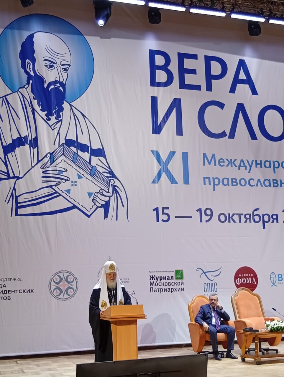 Предстоятель Русской Церкви со сцены Зала церковных соборов благословил участников форума и обратился к собравшимся с Первосвятительским словом.