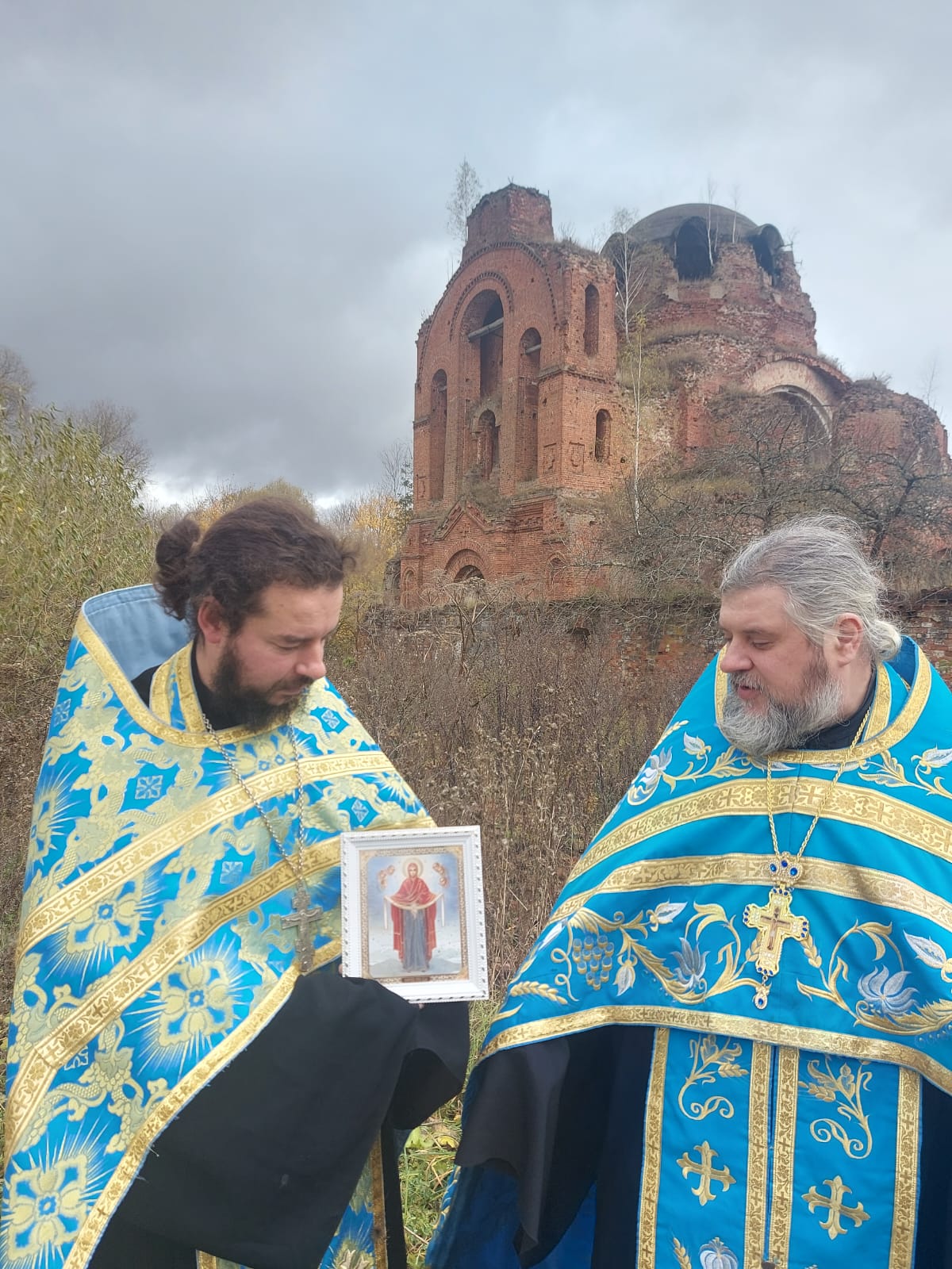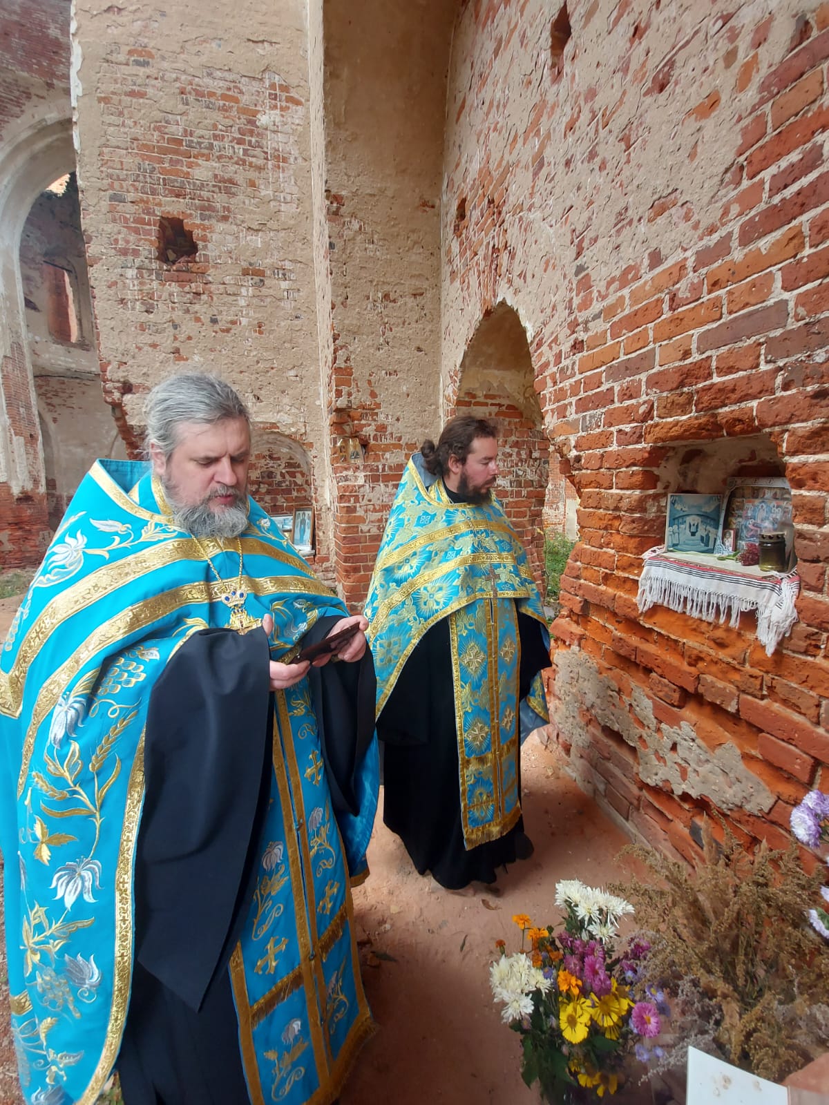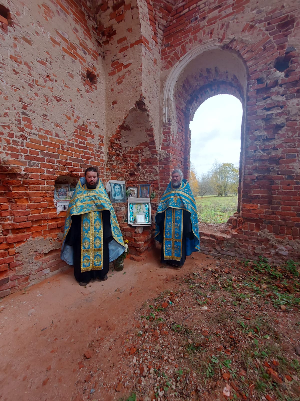 После богослужения в Лазаревском храме протоиерей Михаил Карпенко и иерей Николай Безручкин отправились в деревню Космачево, где находится древняя святыня людиновского района — храм Покрова Пресвятой Богородицы, который на данный момент находится в руинированном состоянии и нуждается в масштабных реставрационных работах.