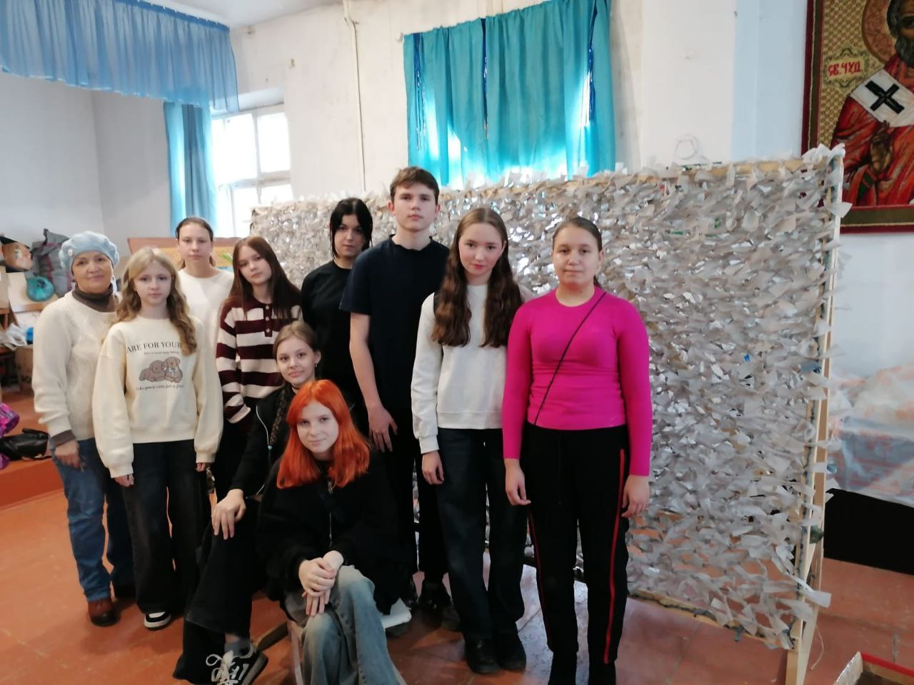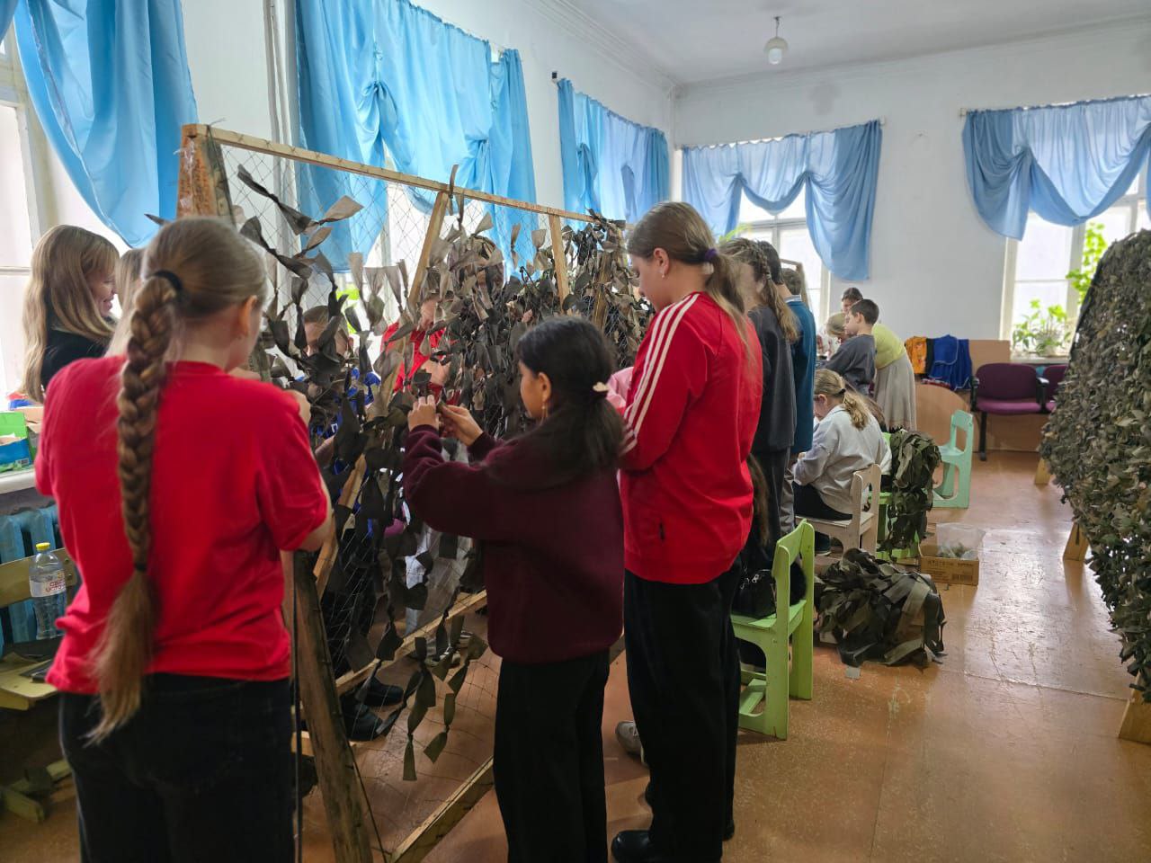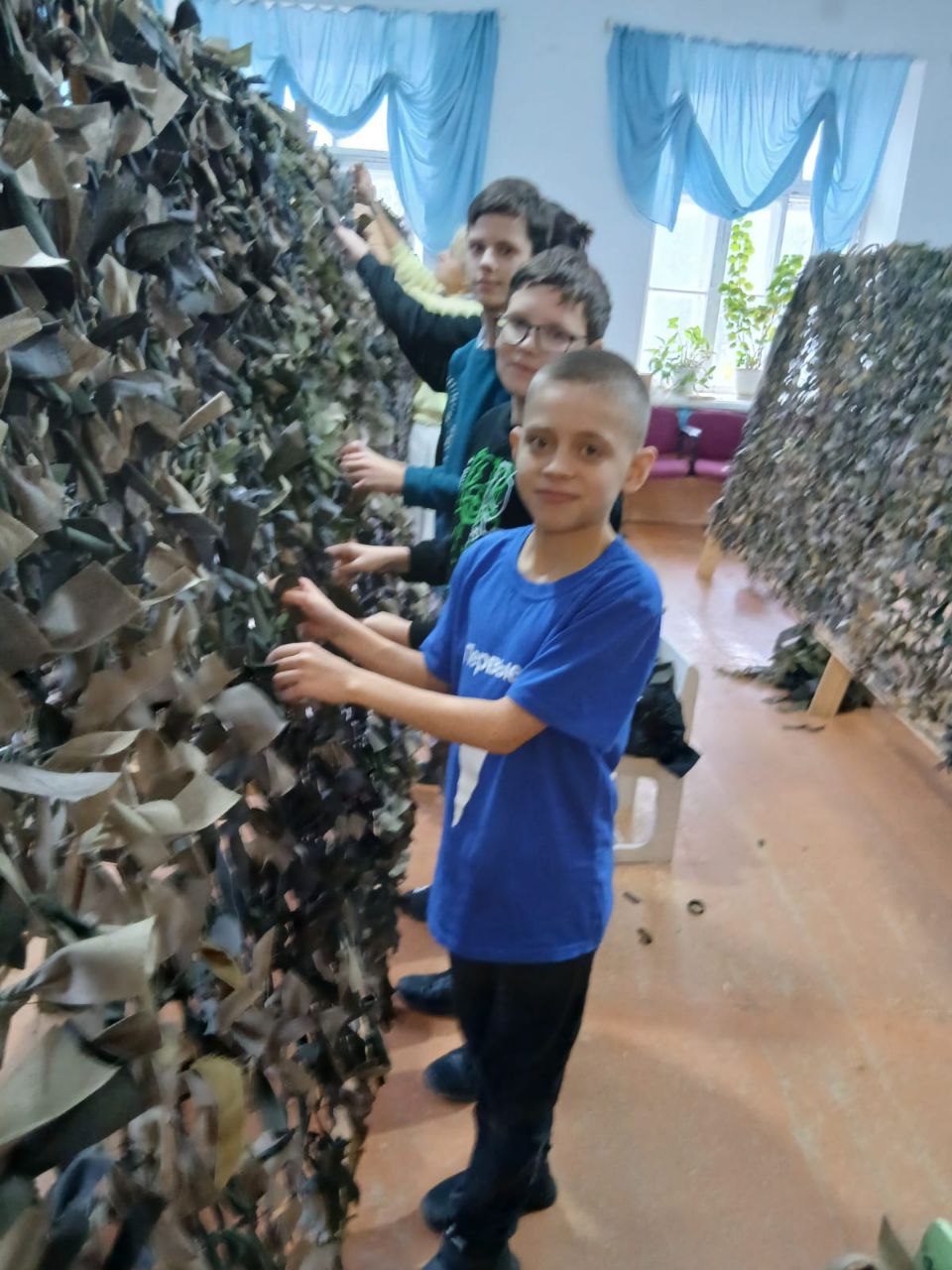 В последних числах октября сего 2025 года в помещении Казанского собора города Людиново, где плетут маскировочные сети добровольцы Приходской группы «Тепло и забота солдату» (координатор Валентина Купрюхина), школьники из разных учебных заведений города Людиново собрались вместе, чтобы общими силами поддержать наших военнослужащих — сплести для них маскировочные сети.