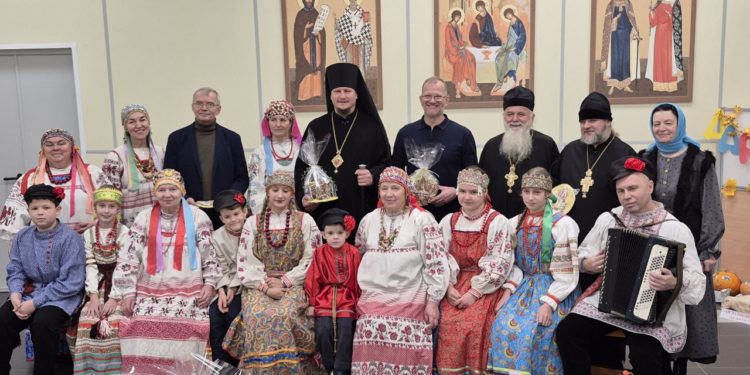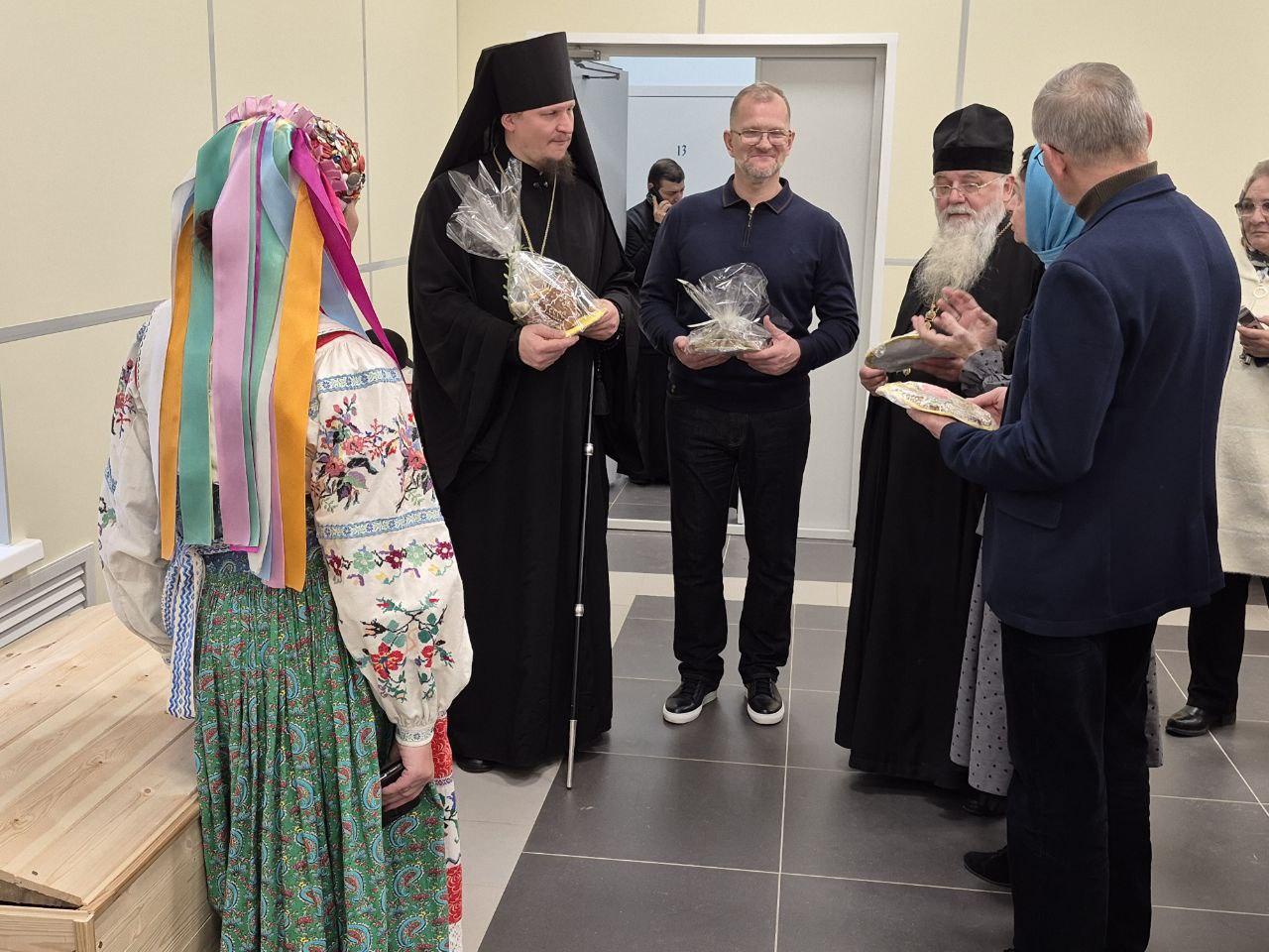 Весёлой и задорной песней с  хлебом – солью встречали почётных гостей участники фольклорных коллективов «Проталинка» и «Черновцы» при Казанском соборе.