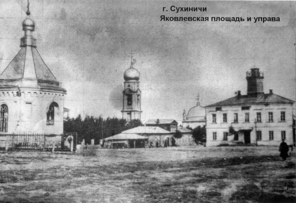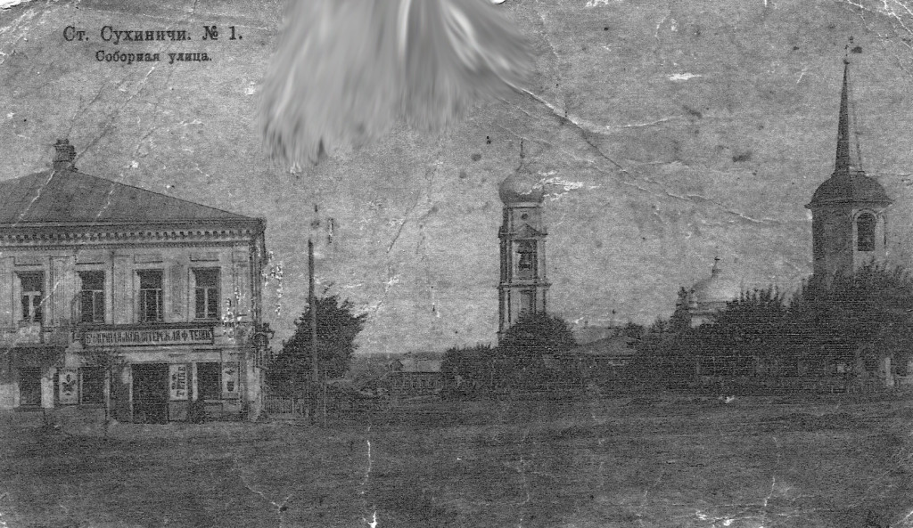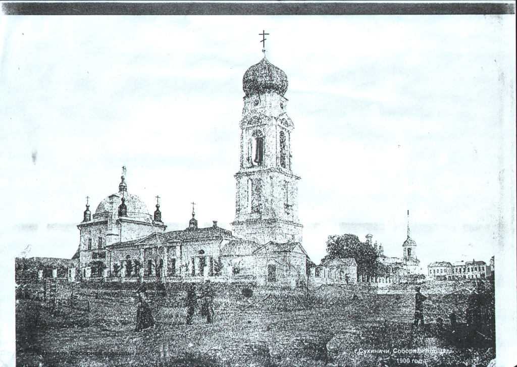 К началу XIX века в г. Сухиничи было два каменных храма и одна часовня. Первым построенным храмом был каменный собор в центре села Сухиничи, освященный в честь святителей Афанасия и Кирилла архиепископов Александрийских. Его постройка закончилась в 1745 году. Сведений о том, кем он построен — не осталось. Главный каменный собор в честь Смоленской иконы Божией Матери был построен тульским купцом Харитоном Антиповичем Постуховым в 1770 году. Высокая, 25-метровая столпообразная колокольня собора Смоленской иконы Божией Матери была сооружена на средства горожан.
