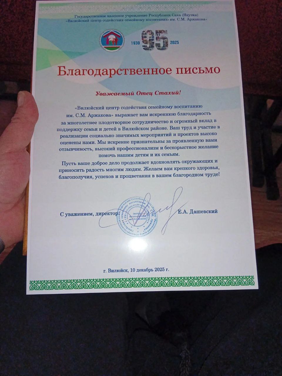 На торжественном концерте, в честь 95-летия Центра, иерею Стахию Гайсину была вручена Благодарственная грамота за многолетнее и плодотворное сотрудничество.