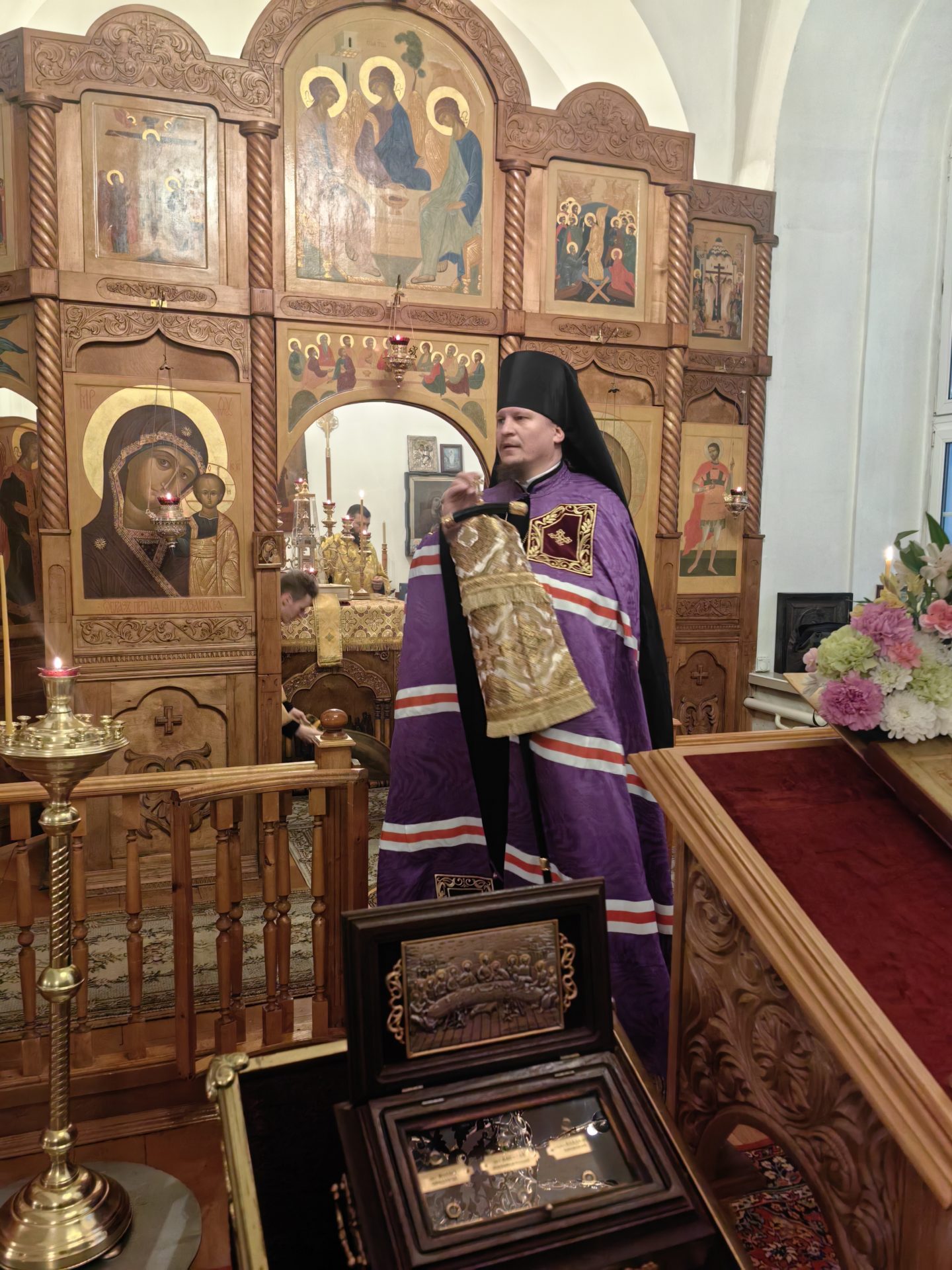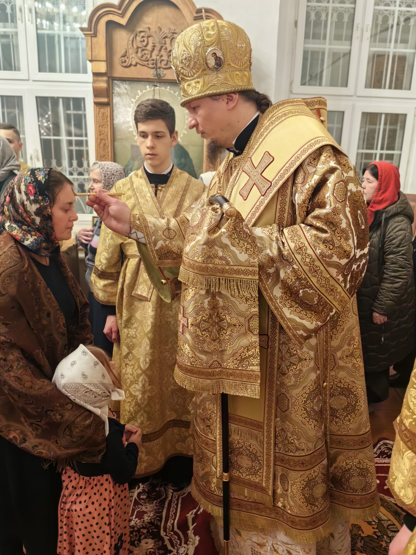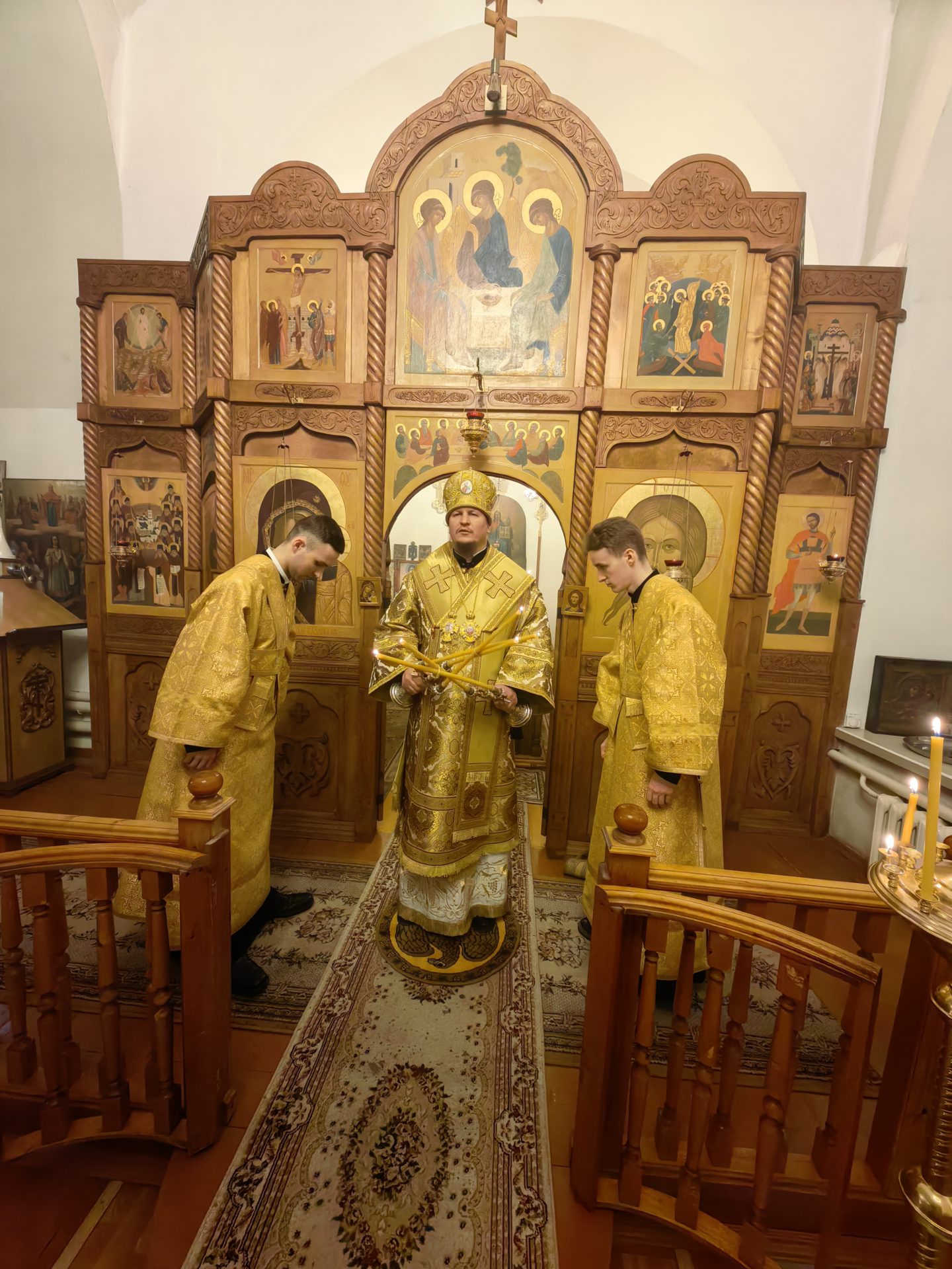 Епископу сослужили: настоятель храма священник Сергий Дрозд, иеромонах Тихон (Клинов), священник Лев Шиповский, Секретарь Епархиального Совета священник Филипп Лисенков, диакон Николай Кречетов и диакон Сергий Акопян.
