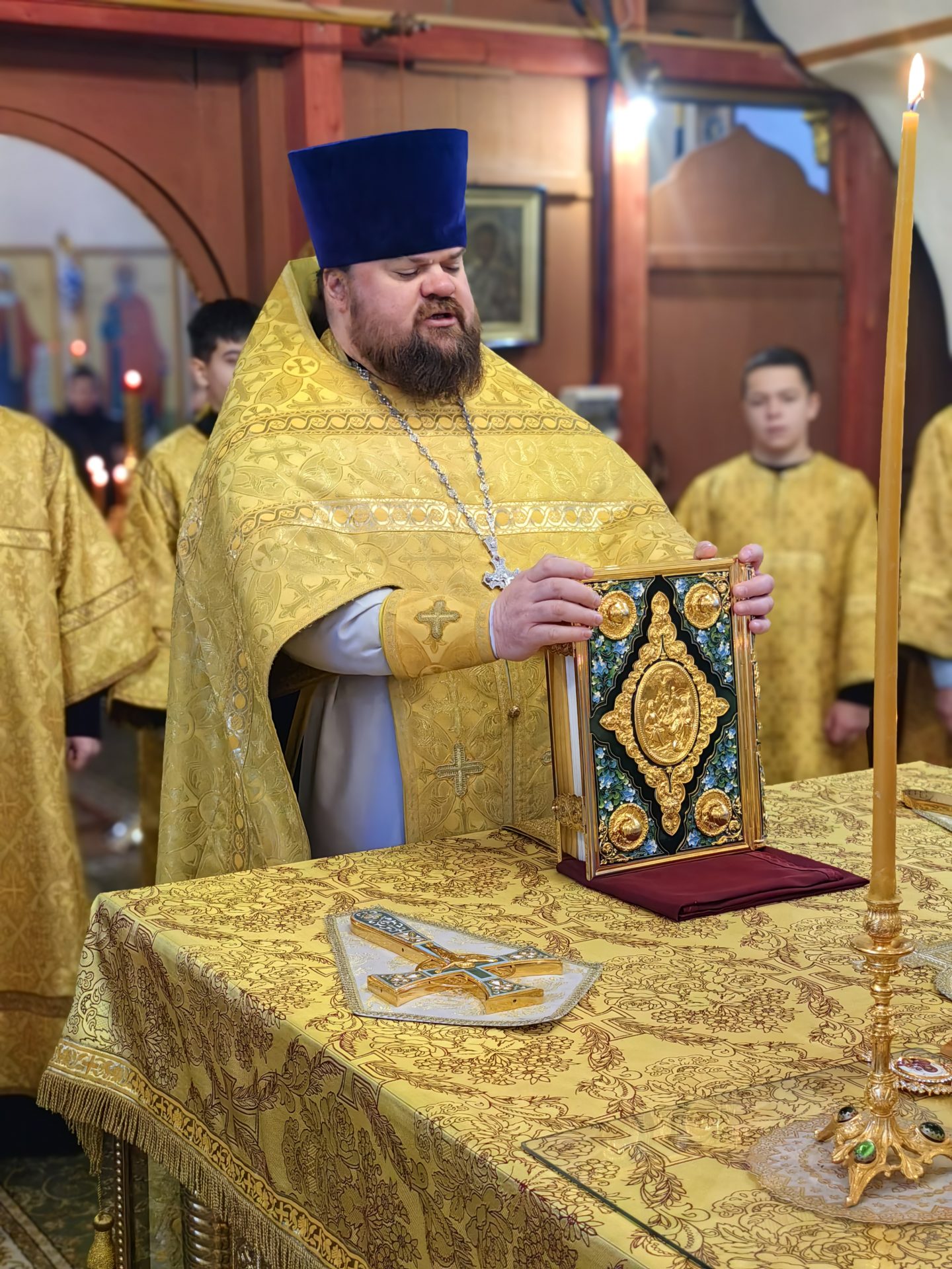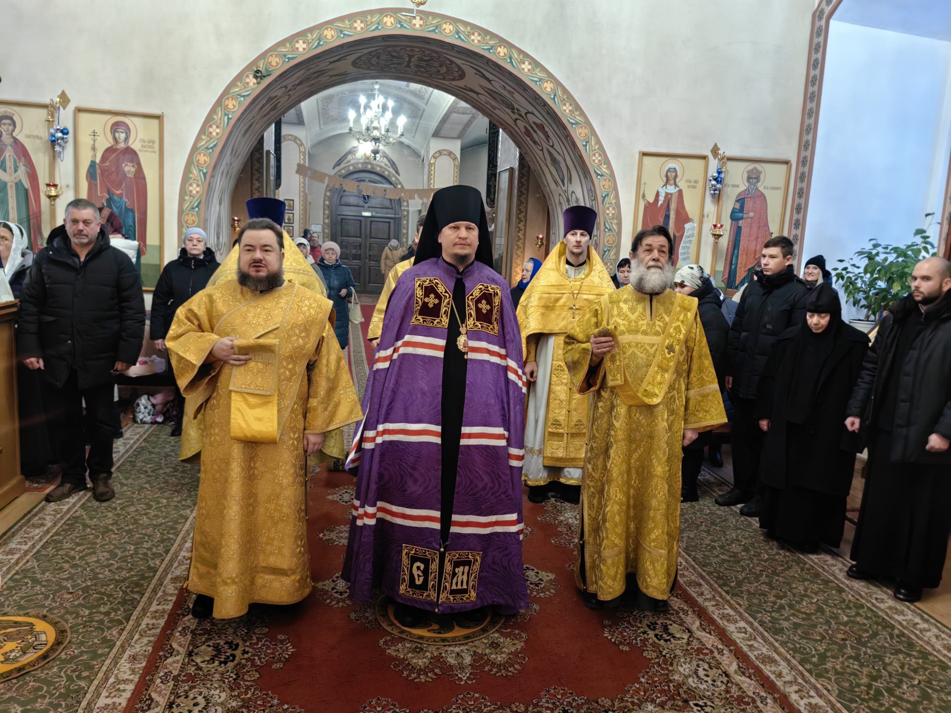 Епископу сослужили: настоятель храма протоиерей Сергий Сычев, благочинный Градо-Козельского церковного округа священник Филипп Лисенков, священник Дамиан Рупасов, диаконы Николай Кречетов и Андрей Пожилов.