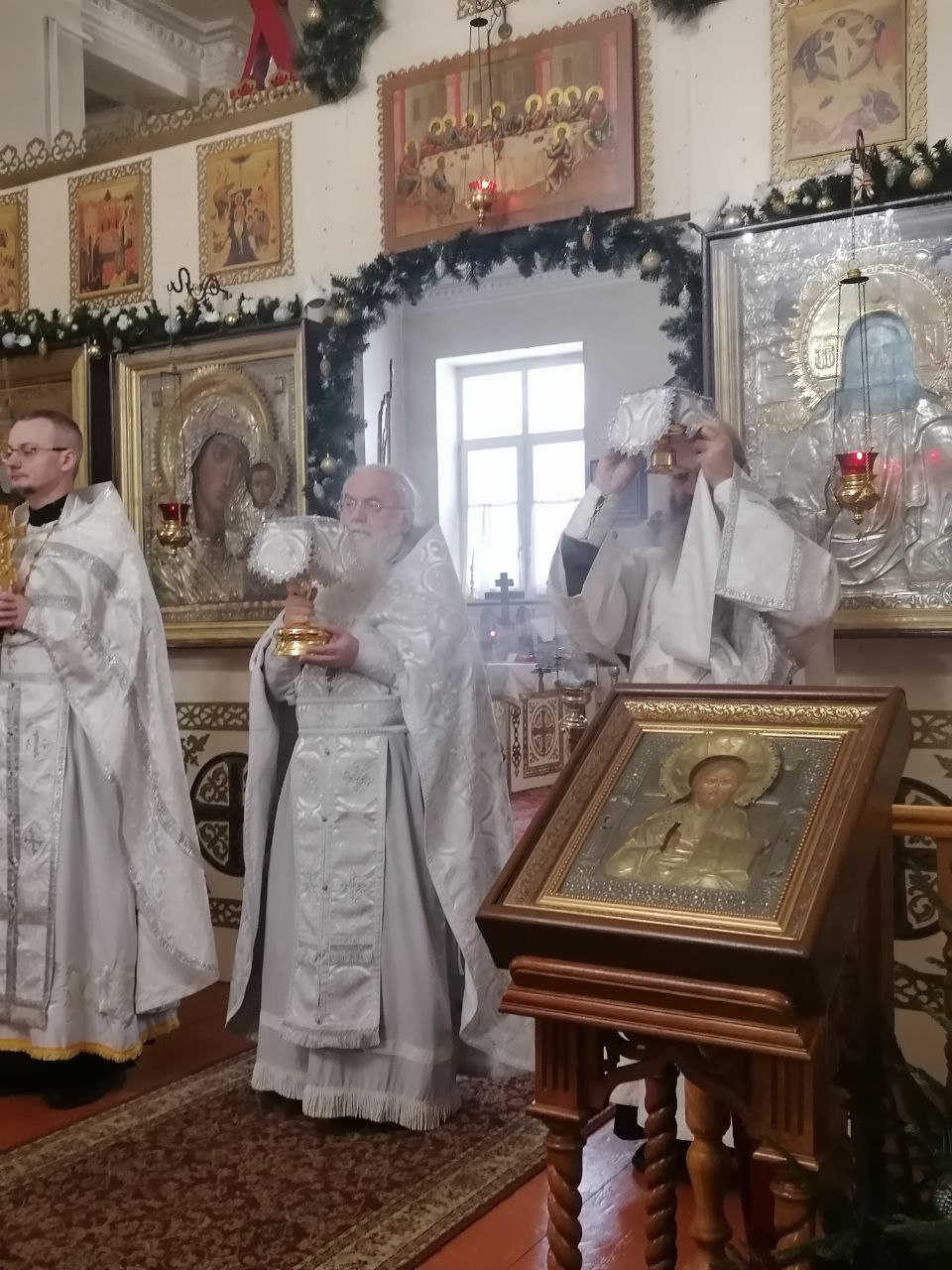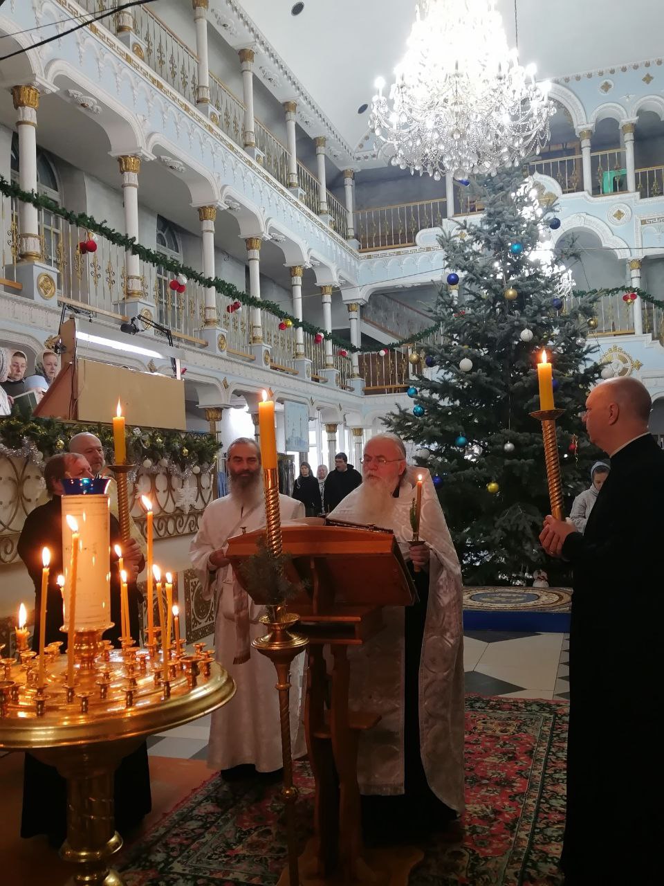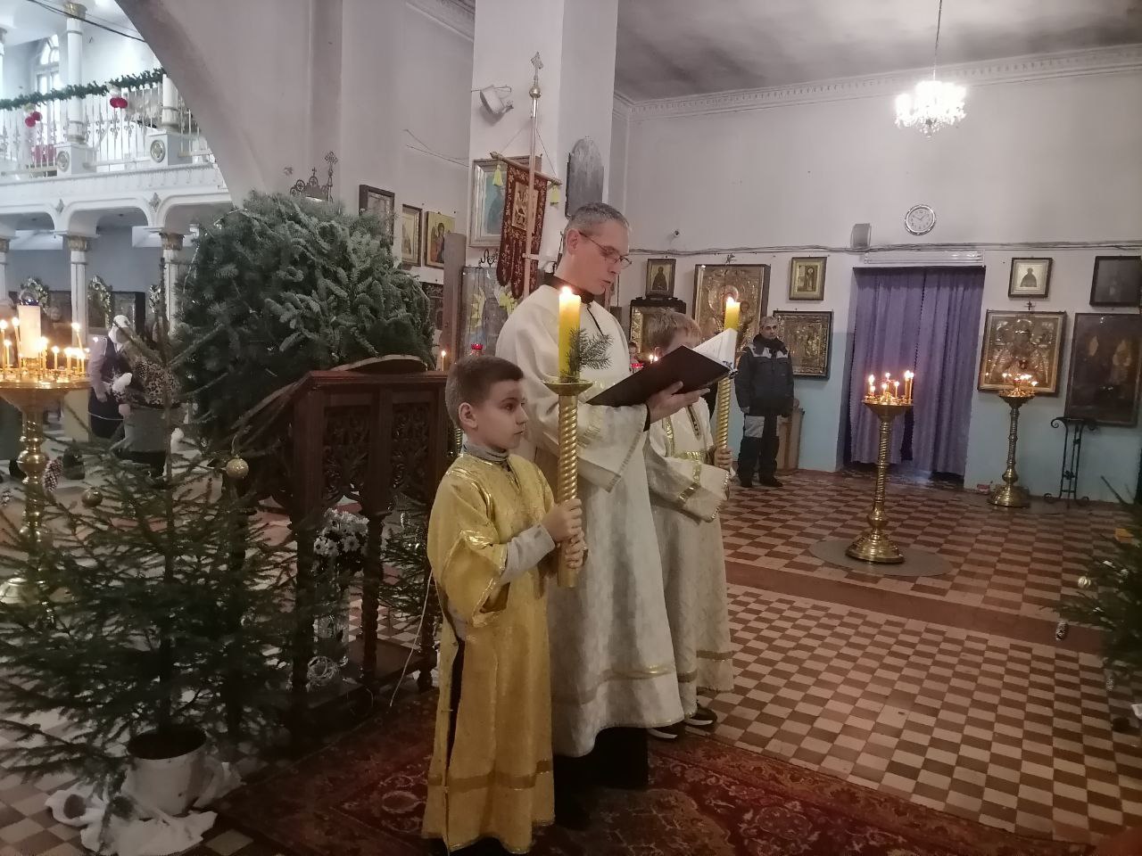 По окончании торжественного богослужения из алтаря в центр храма была вынесена свеча, символизирующая Вифлеемскую звезду. Здесь, перед этой свечой священнослужители вместе с хором пропели тропарь и кондак Рождества Христова, совершили чин освящения сочива (которое с любовью приготовили сотрудники храма по особому местному рецепту). По традиции настоятель поздравил именинников этого дня и вручил им святые просфоры.