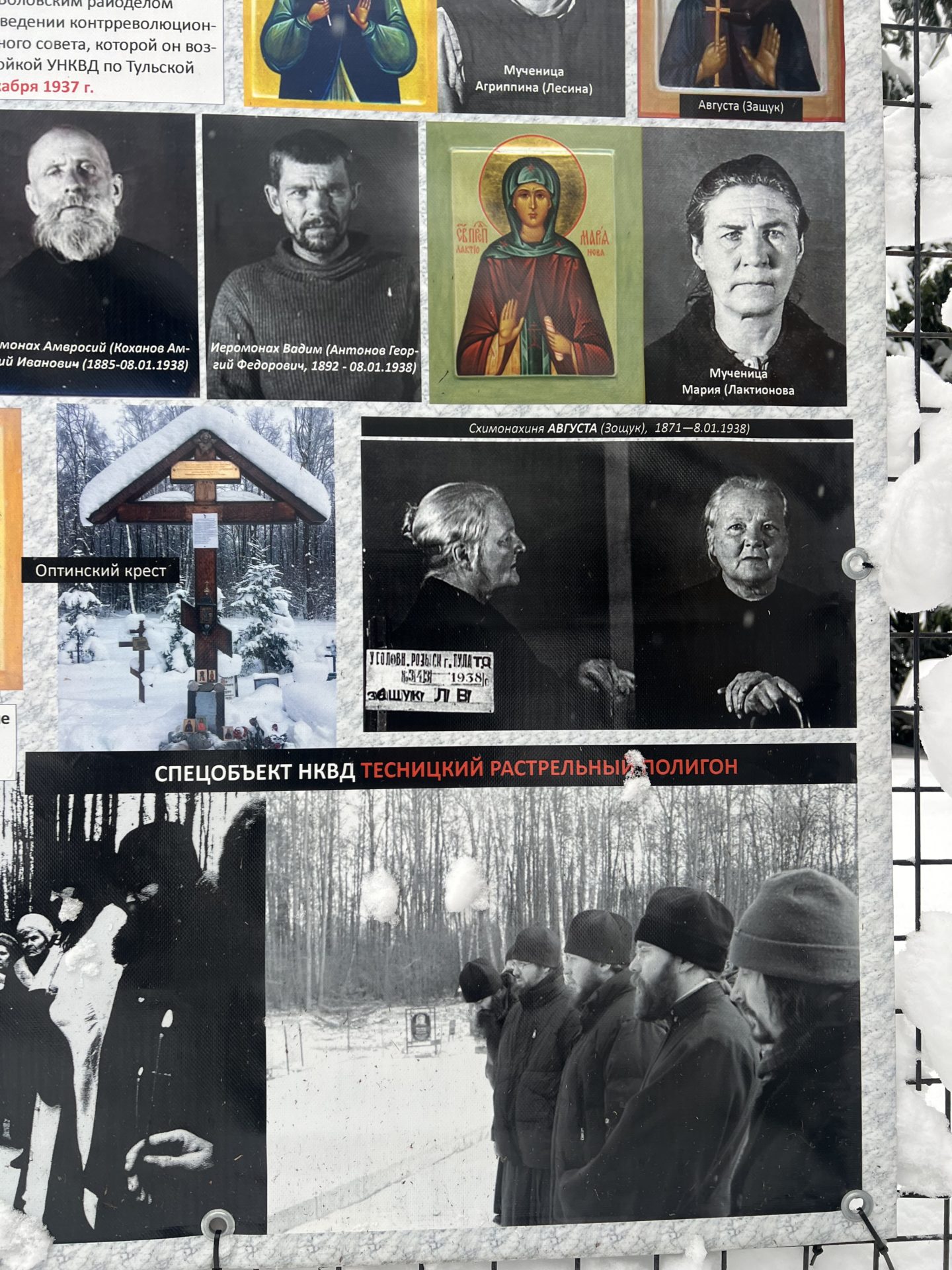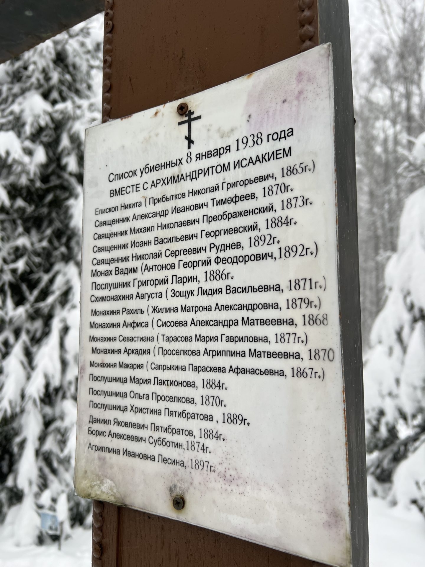 Приговор привели в исполнение 26 декабря/8 января 1938 года, на второй день Рождества Христова, когда Святая Церковь празднует Собор Пресвятой Богородицы, расстрелянных мучеников тайно захоронили в лесу на 162-м километре Симферопольского шоссе. Ныне на этом месте братией Оптиной Пустыни воздвигнут Честный Животворящий Крест — непобедимое оружие христиан, разрушившее смерть, всерадостное знамение нашего искупления.