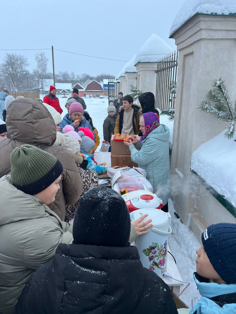 Далее праздник переместился на улицу, где всех гостей встречали горячим чаем и пирожками от всеми любимой на приходе бабы Любы!