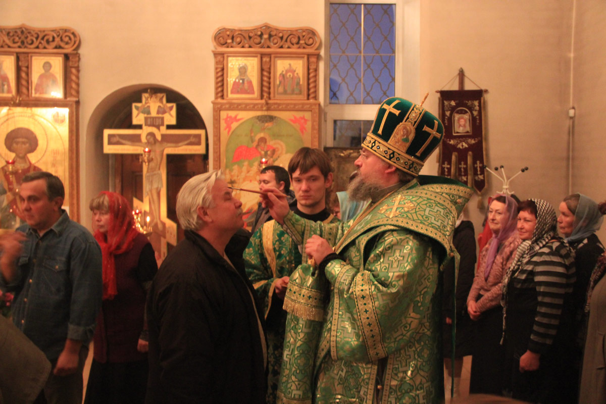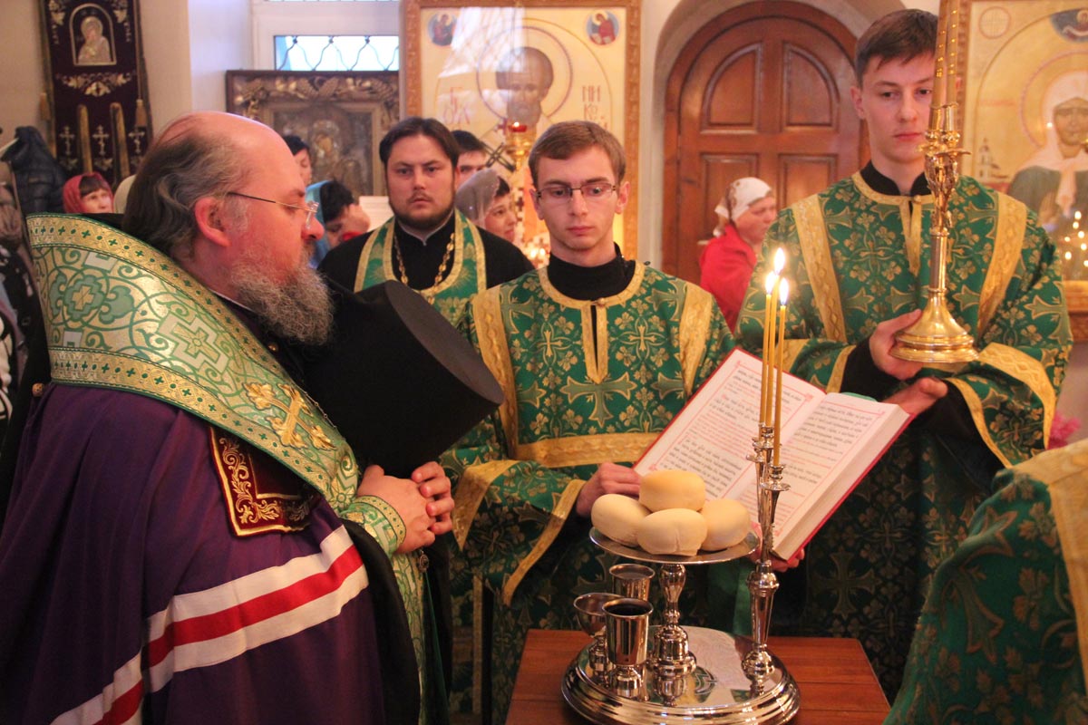 Его Преосвященству сослужили: настоятель храма иерей Василий Гаднай, иерей Антоний Хатунцев и диакон Евгений Ковригин. По окончании богослужения владыка обратился к богомольцам с архипастырским словом.