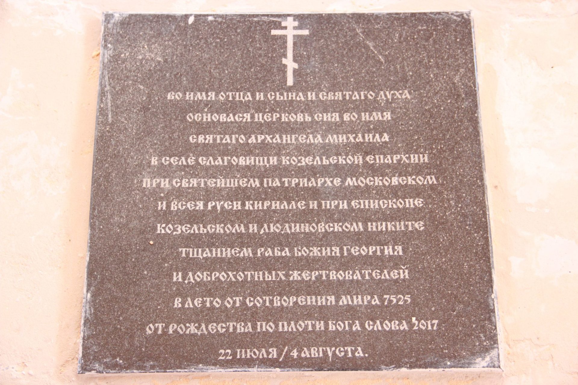 Закладка храма состоялась 5 августа 2017 года. Чин совершил владыка Никита в сослужении духовенства Козельского благочиния. Это событие было отмечено особым, трогательным моментом: на закладке молился ныне покойный протоиерей Леонтий Никифоров. За 55 лет своего ревностного служения отец Леонтий возродил десятки святынь Козельской земли, и храм в Слаговищах стал последним, в основание которого он вложил свою молитву, словно передавая эстафету веры будущим поколениям.