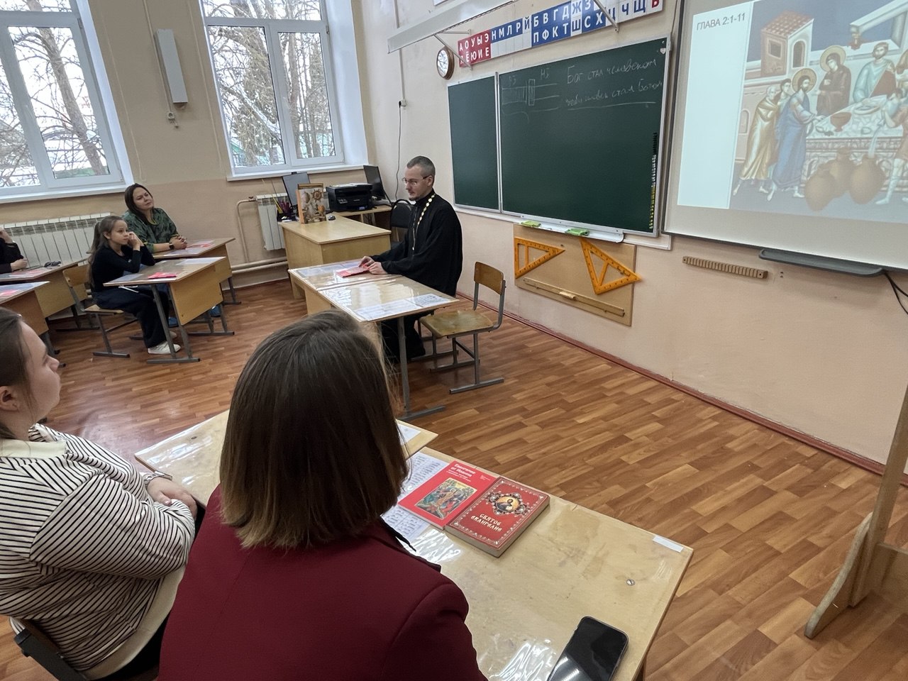 Отец Алексий Сначёв на встрече с детьми и родителями выступил в роли соведущего по теме «Беседы с батюшкой. Евангелие: уроки для всей семьи». Евангелие – это «благая весть» о жизни и учении Иисуса Христа. В ходе чтения священником отрывков из Евангелия от Иоанна родители и ученики узнали, как правильно толковать богословский смысл сюжета из Священного Писания, как преломить и осмыслить его к ситуациям повседневной жизни, постепенно открывая для себя все новые и новые жизненные смыслы. Сердечную благодарность выразили администрация школы, учителя и родители православных классов священнослужителям за сотрудничество, за внимание к вопросам образования и родительского просвещения.
