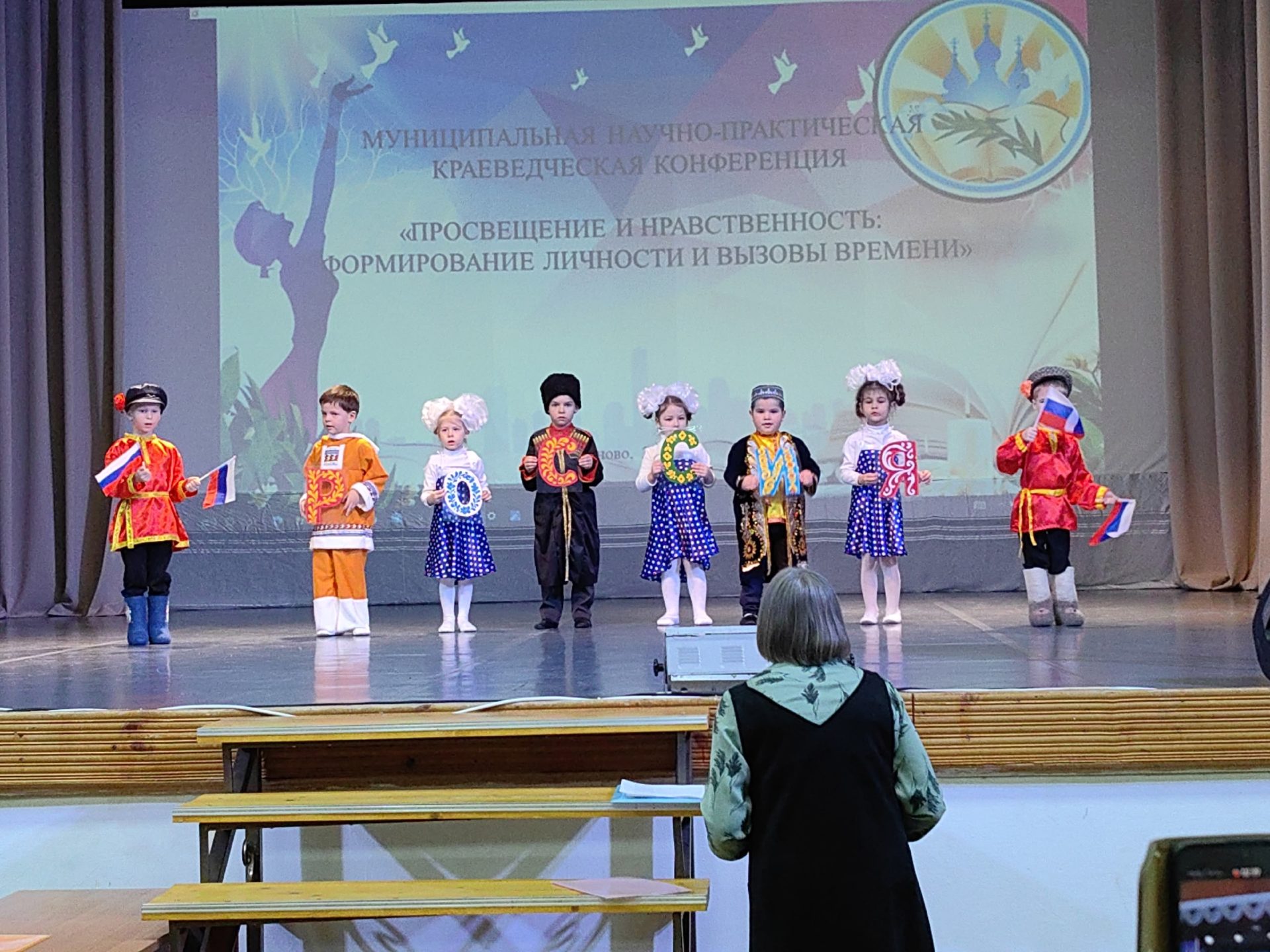 Самые младшие участки конференции — воспитанники детского сада «Солнышко» — представили свое выступление с музыкально-литературной композицией «В единстве народов — сила России!» в рамках празднования Года единства народов России.