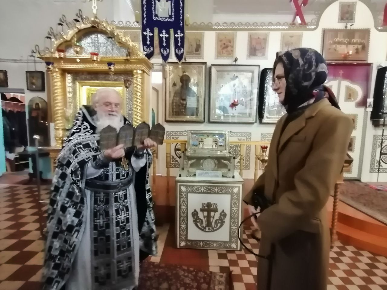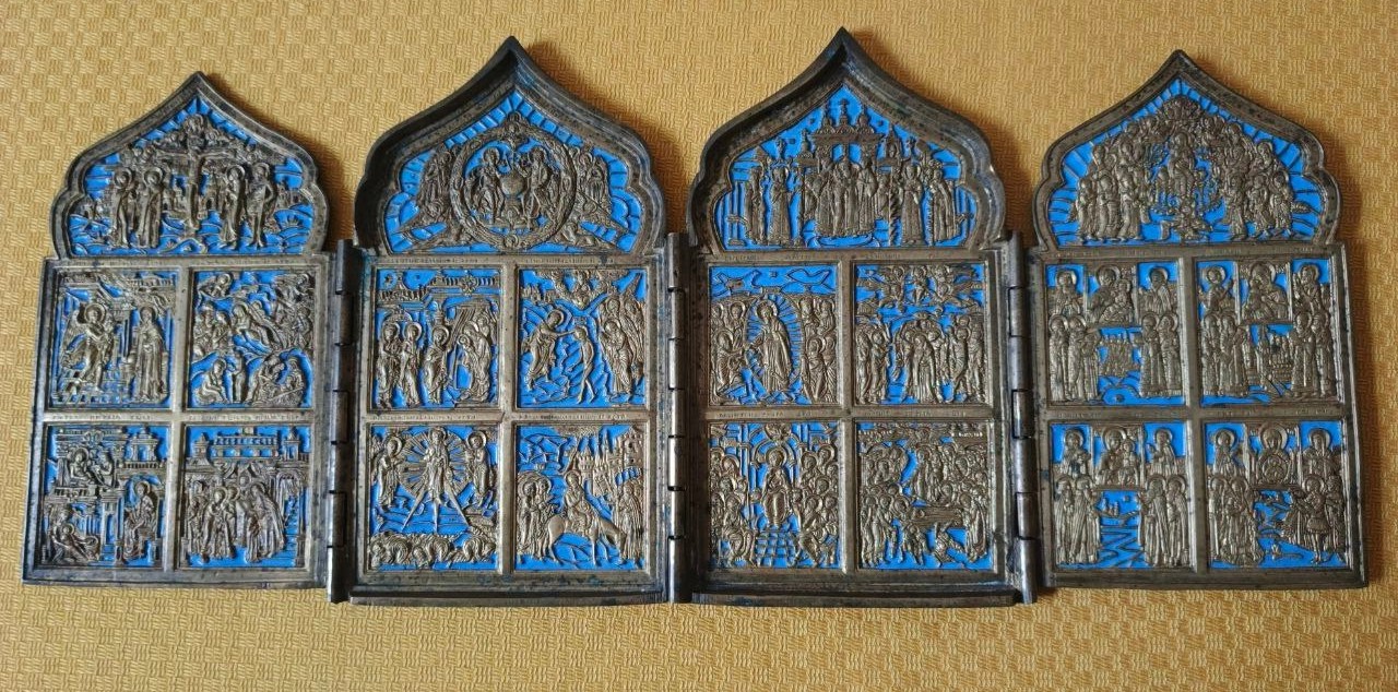 В феврале Мария Валерьевна уже приезжала в Людиново по служебным делам и посещала Казанский собор. Очень впечатлили в первый визит депутата Святыни собора, благоукрашение храма и музейные экспозиции. В этот раз в Людинове Мария Валерьевна была проездом, но решила прийти в храм, чтобы передать настоятелю собора протоиерею Алексию Жиганову четырёхстворчатый праздничный складень середины 19 века. Этот замечательный меднолитный (латунный) складень «Праздники» с голубой эмалью, с хорошей сохранностью ликов и самих створок (предположительно московских меднолитных мастерских) год назад Марии Валерьевне подарила одна женщина. После посещения церковного музея при Казанском соборе Людинова в первый визит, депутат решила передать этот старинный складень в храм.